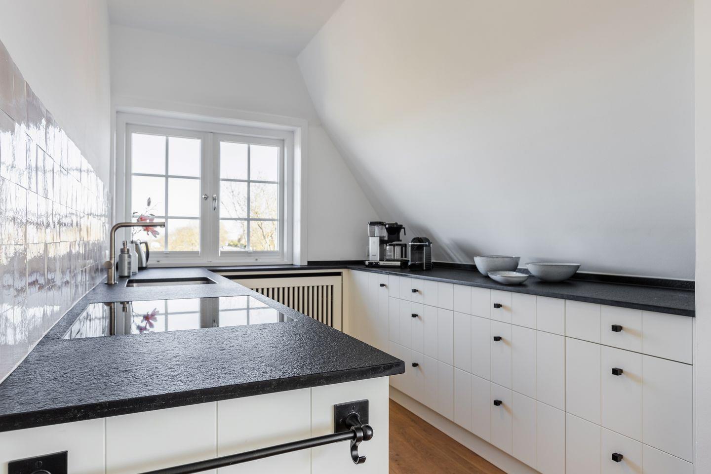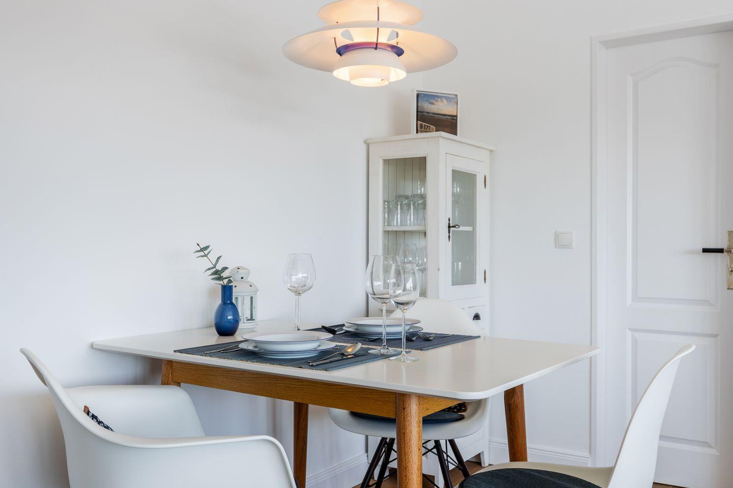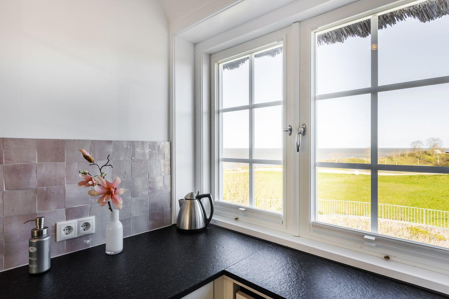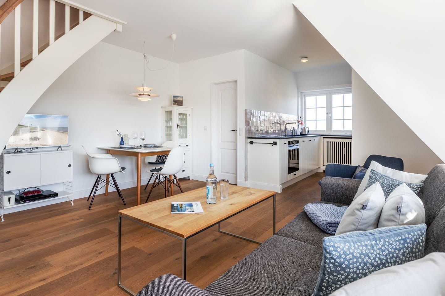 Sie gelangen über ein eigenes Treppenhaus in die helle und freundliche Wohnung. Der Wohnraum verfügt über Echtholzparket und ist mit einer gemütlichen Sitzgruppe und einem Essplatz ausgestattet. Besonderes Highlight ist die offene Küche, die 2022 komplett erneuert wurde und von wo aus Sie über das Wattenmeer sehen können.