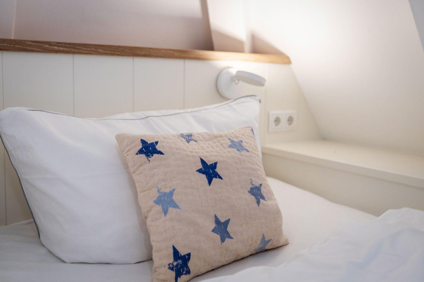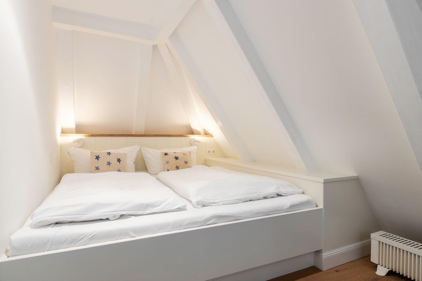Angrenzend an den Wohnraum befindet sich ein hellgestaltetes, modernes Duschbad. Über eine Treppe erreichen Sie den Schlafbereich mit einem komfortablen Doppelbett, einem Einzelbett und ausreichend Stauraum für Ihre Kleidung.
