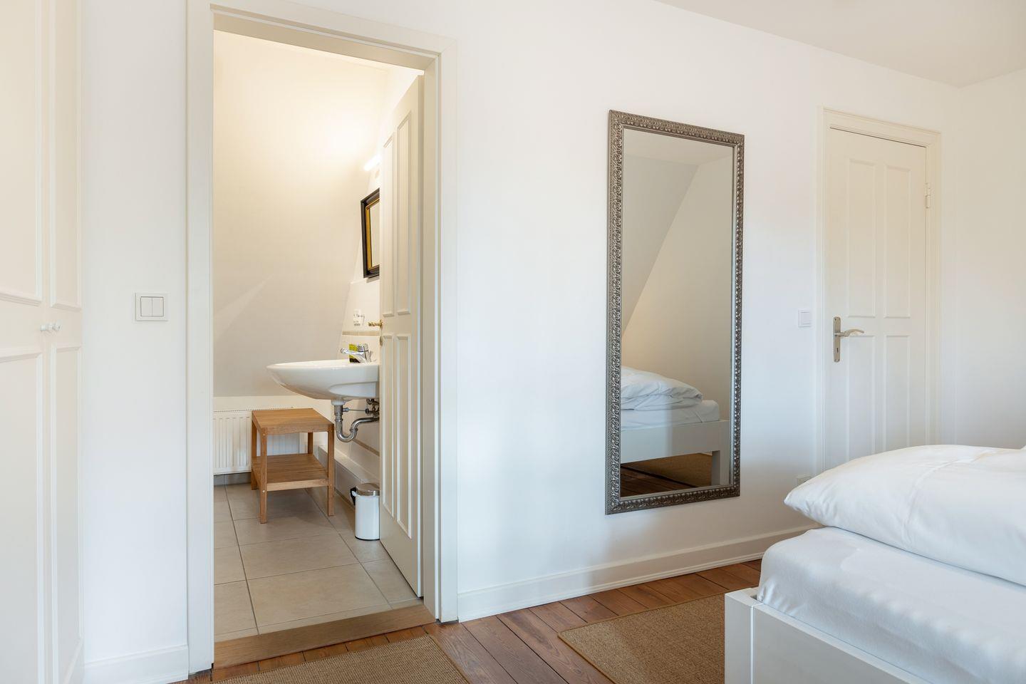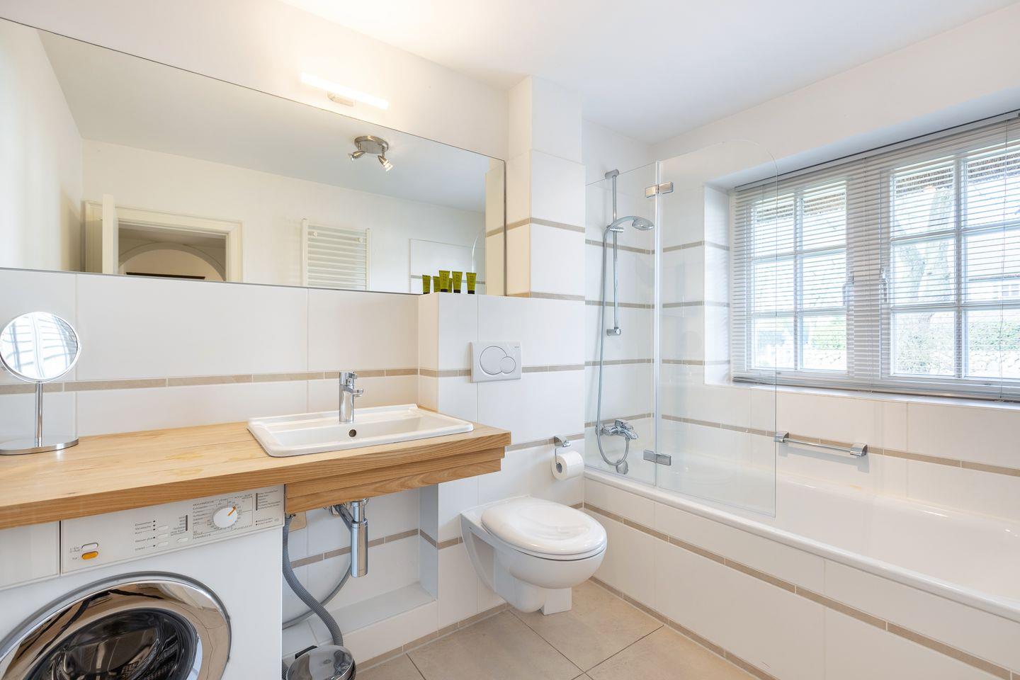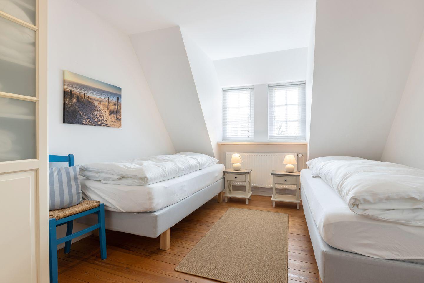 Das Mittelhausteil Paula ist mit ca. 85 m² der größte Gebäudeteil – geeignet für bis zu 5 Personen. Paula ist im Landhausstil teils mit historischen Elementen (Delfter Kacheln, Holzböden, etc.) ausgestattet. Im Erdgeschoss gibt´s einen großen Wohn- /Essbereich sowie eine Landhausküche mit allem Komfort (GS, Cerankochfeld, Backofen, Mikrowelle, etc.). Das Bad im EG ist hell und geräumig (Fußbodenheizung, Designwaschtisch und Badewanne). Hier steht zusätzlich eine Waschmaschine zur Verfügung. Im Dachgeschoss - mit Friesengiebel und Reetdachgauben – gibt es zwei große Zimmer (ein Elternschlafzimmer mit großem Doppelbett, Einbauschrank im friesischen Stil und eigenem Duschbad, ein großes Kinderzimmer mit 3 Betten). Ein niedlicher Mußeplatz in der Galeriezone unter dem Friesengiebel lässt den Alltag vergessen. Die Gartenmöbel und der Strandkorb stehen Ihnen von ca. April - Oktober zu Verfügung.