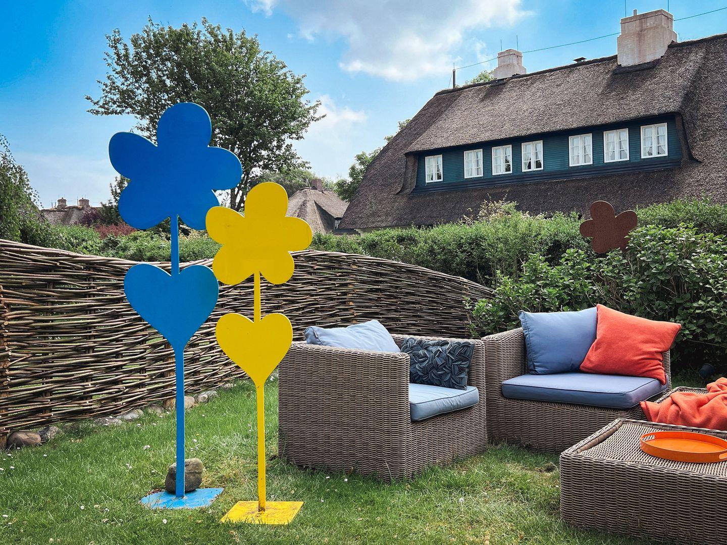 Die Terrasse ( nach Süden ausgerichtet) lädt zum Verweilen an, der Tisch mit Stühlen und der Strandkorb sind von