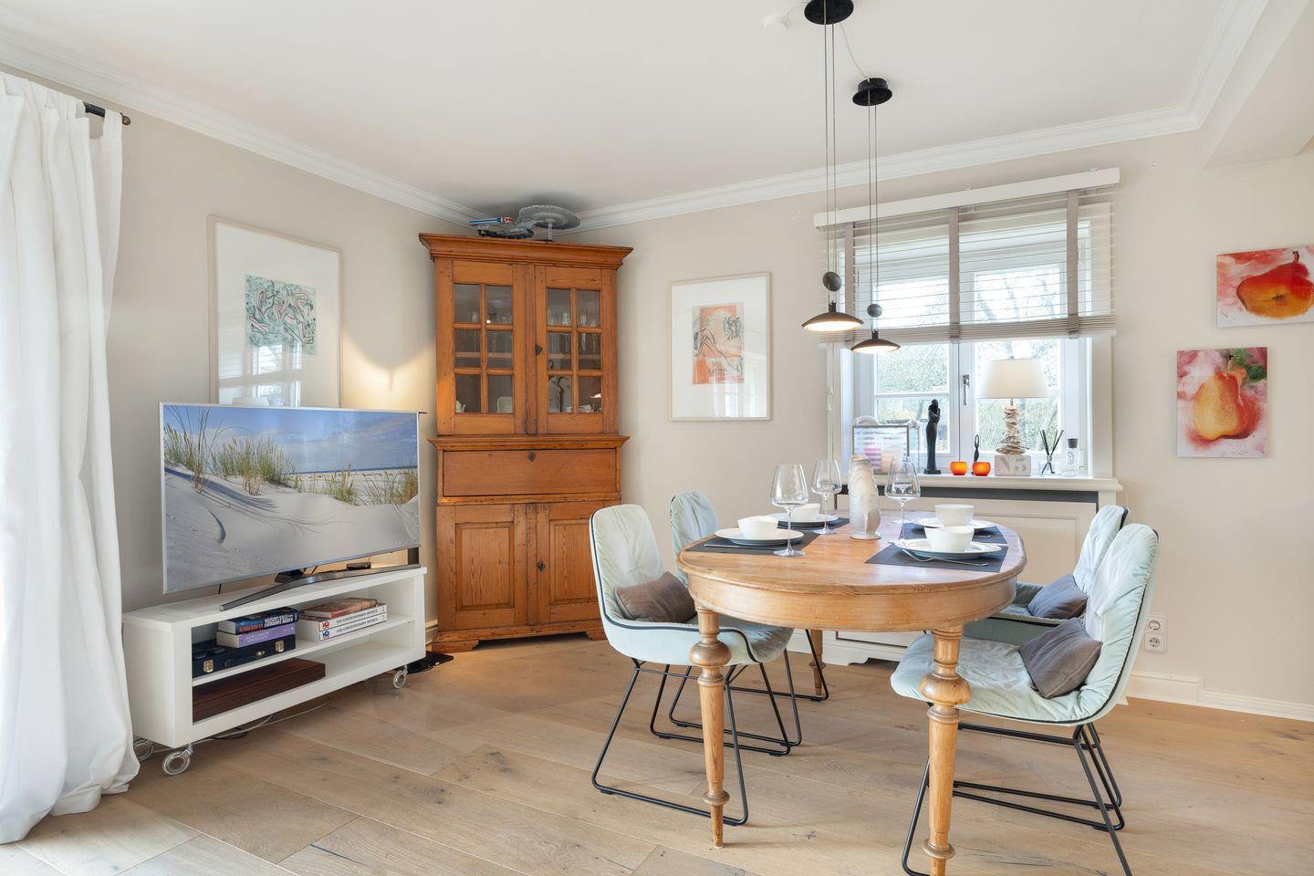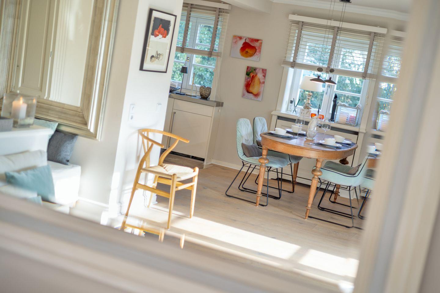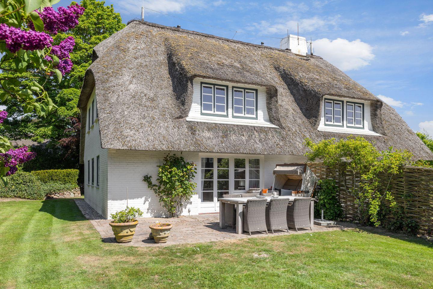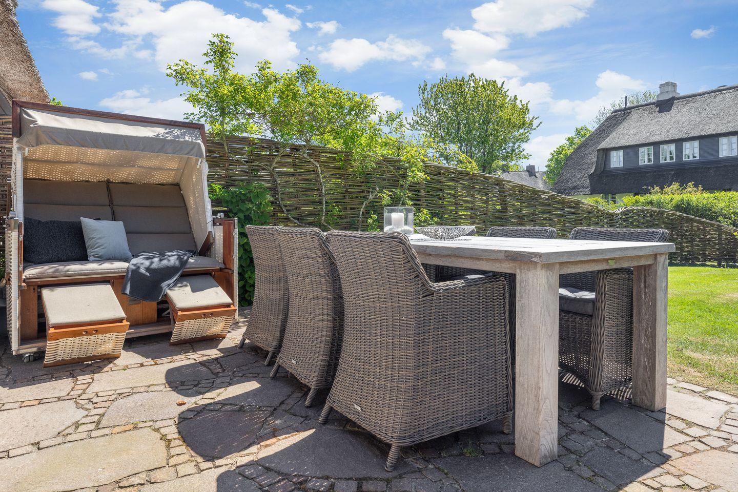 Die voll ausgestattete Küche lässt keine Wünsche offen und ist ideal für alle, die gerne selbst kochen. Sie finden moderne Geräte, darunter einen Induktionsherd, eine Spülmaschine, einen Kühlschrank mit Gefrierfach und viele nützliche Küchenutensilien. Frühstücken Sie auf der sonnigen Terrasse, die mit gemütlichen Gartenmöbeln ausgestattet ist, und genießen Sie die frische Sylter Luft.