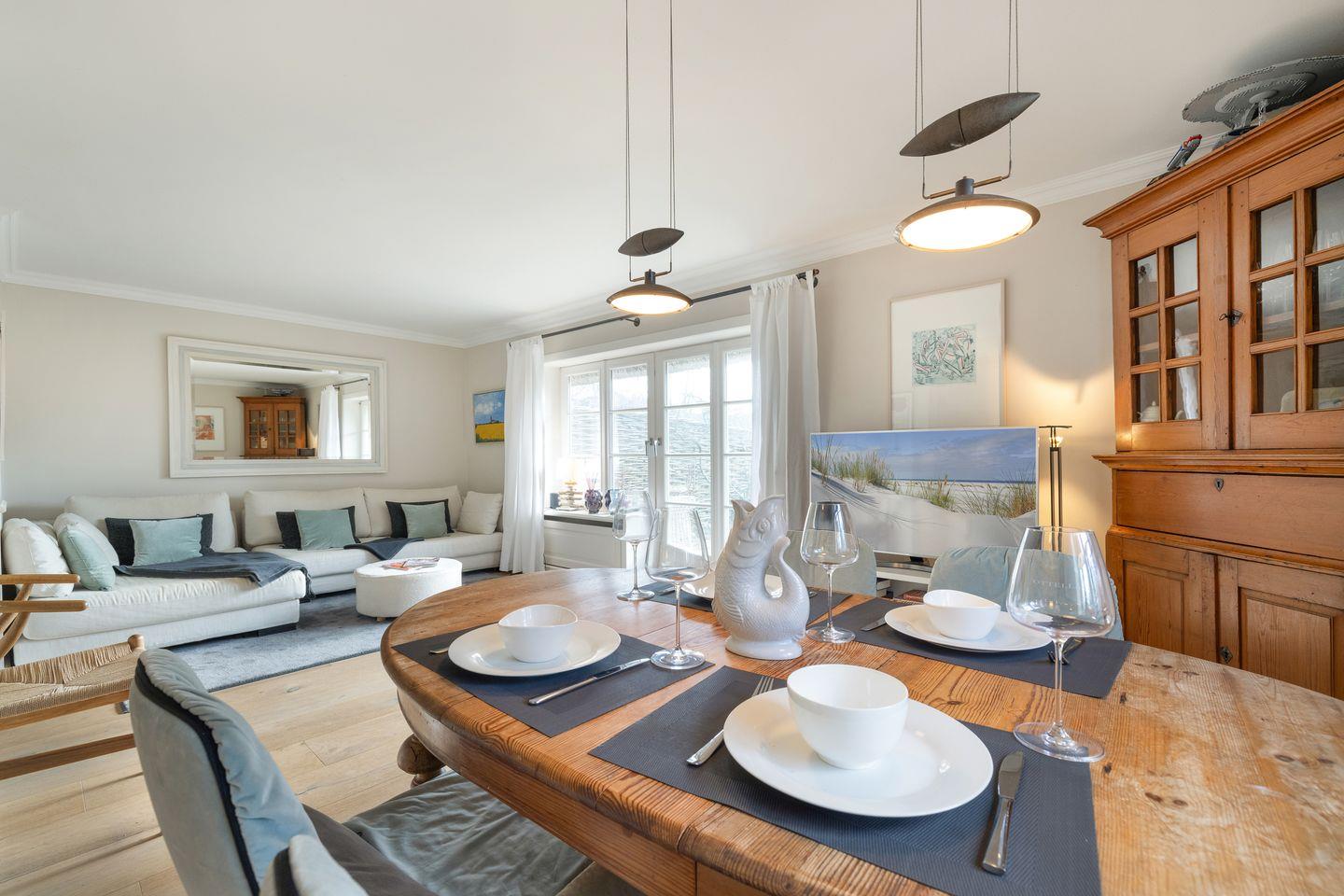 Die Wohnung überzeugt nicht nur mit einem offenen Wohnkonzept, sondern auch mit einer gemütlichen Atmosphäre. Der helle Wohnbereich ist mit hochwertigem Parkett ausgestattet und bietet einen gemütlichen Essbereich, ein komfortables Sofa und einen großen Flachbild-TV (Netflixfähig) für entspannte Abende. Hier können Sie sich nach einem erlebnisreichen Tag zurücklehnen und die Seele baumeln lassen. Die große Fensterfront sorgt für eine angenehme Lichtdurchflutung und einen schönen Blick auf die Umgebung.