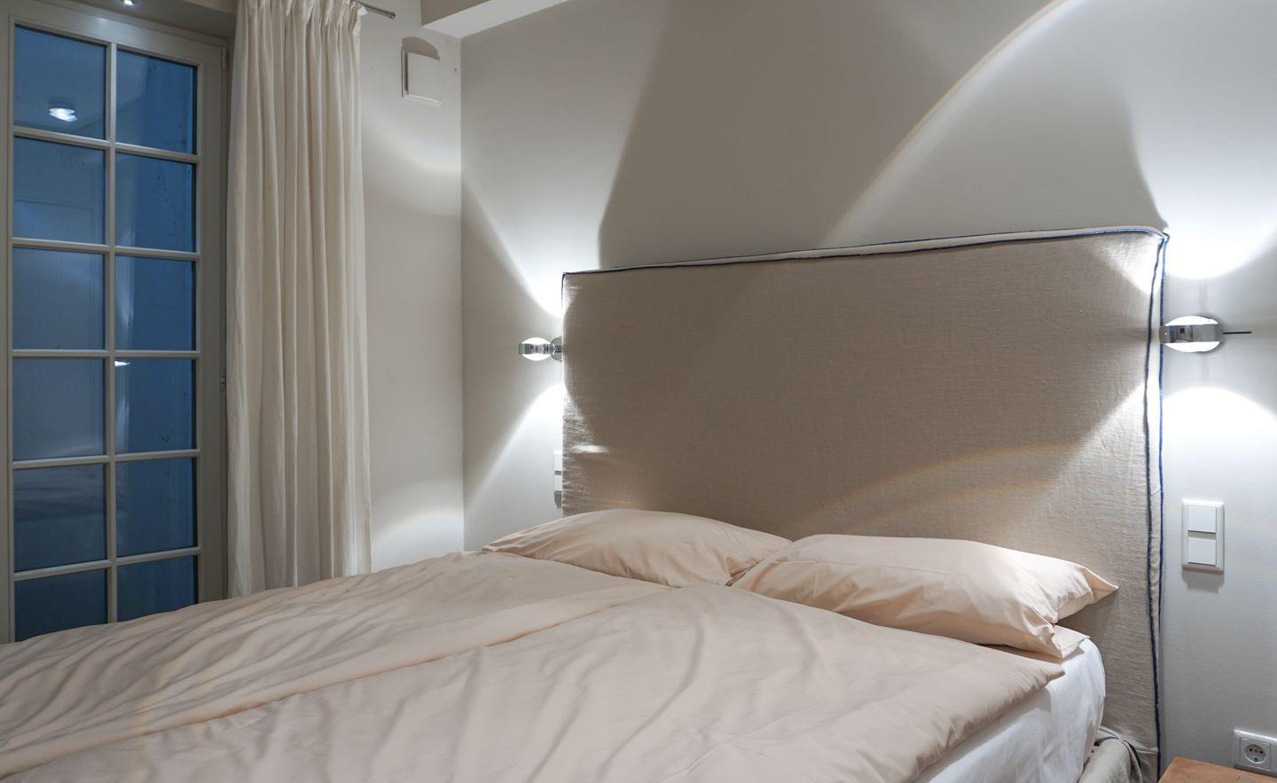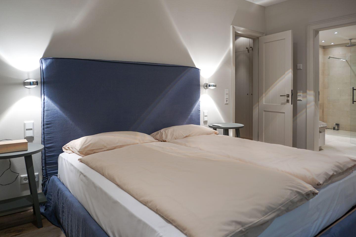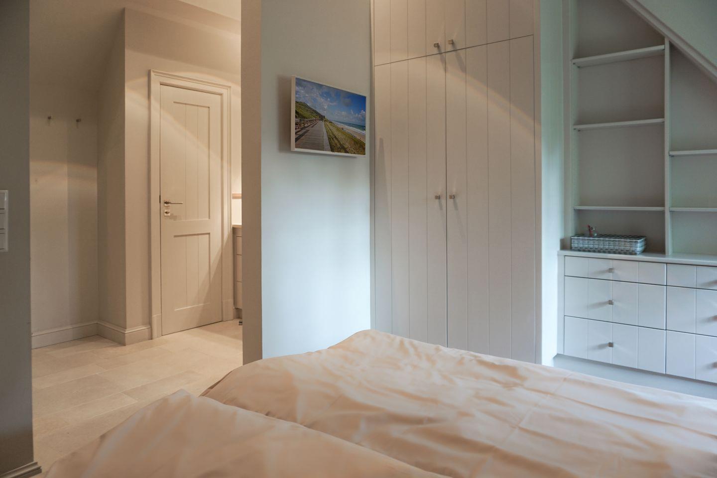 Im Inneren des Hauses verteilen sich fünf Zimmer über drei Etagen. Insgesamt stehen Ihnen vier Schlafzimmer zur Verfügung, davon zwei im Untergeschoss und zwei in der oberen Etage. 3 der vier Schlafzimmer haben das Bad en suite. Alle Schlafzimmer sind mit Dielenboden ausgestattet, der ebenso wie der Fußboden im Wohnzimmer eine warme und einladende Atmosphäre schafft. Die Wohnräume sind großzügig gestaltet und zeichnen sich durch eine hochwertige Möblierung aus. Eine gemütliche, große Sofaecke und ein moderner Kaminofen im Wohnzimmer sorgen auch an kühleren Tagen für Behaglichkeit. Fünf digitale Fernseher ermöglichen Ihnen individuelle Unterhaltung in verschiedenen Räumen.