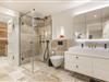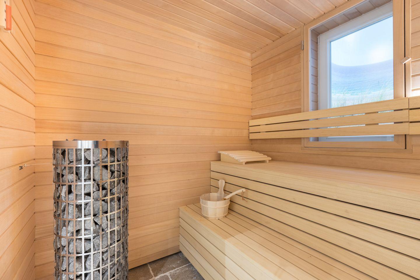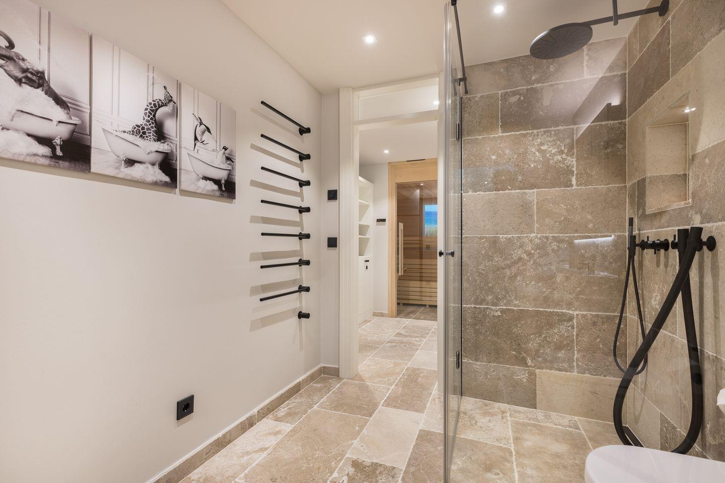 Das Untergeschoss des Hauses verfügt über ein weiteres, großzügiges Schlafzimmer mit Boxspring-Doppelbett und Flatscreen-TV. Auch hier ist hochwertiges Parkett verlegt wurden. Außerdem finden Sie hier ein Wellness-Badezimmer mit großem Saunabereich, Designer-Badewanne, Regendusche und Sauna Kaltwasserschlauch.