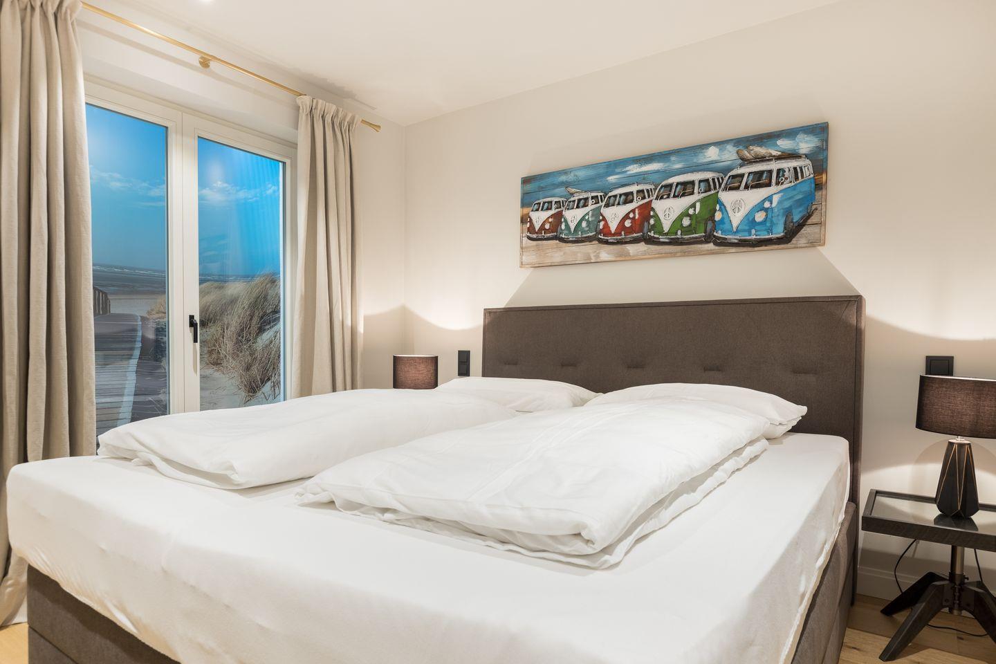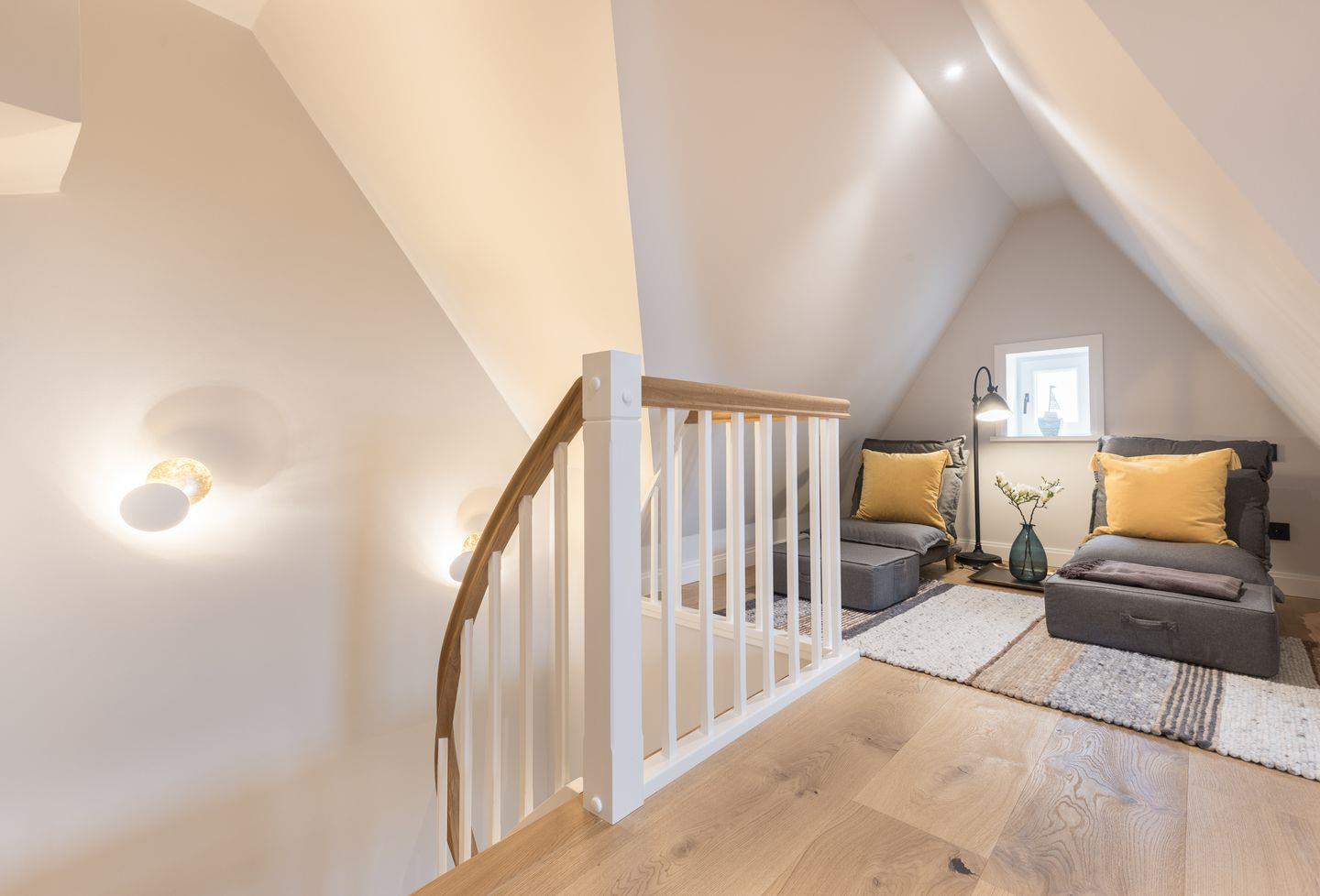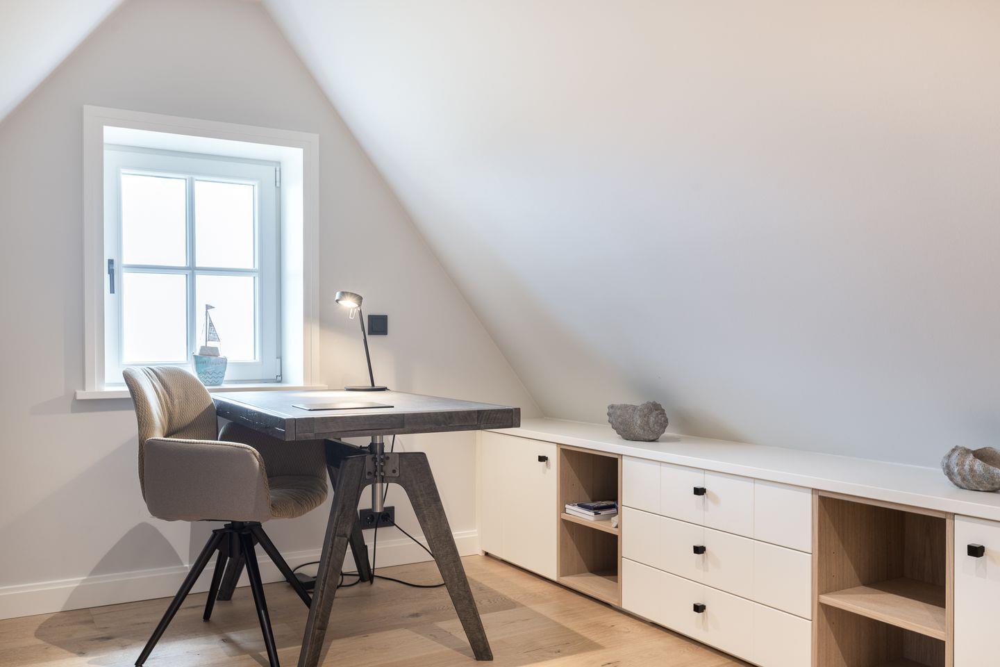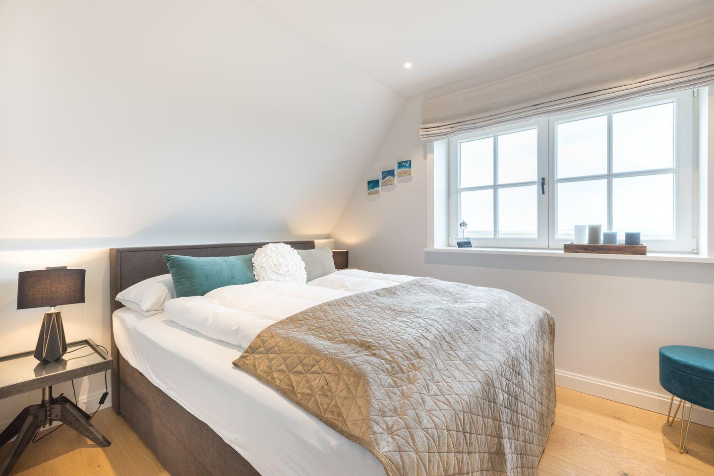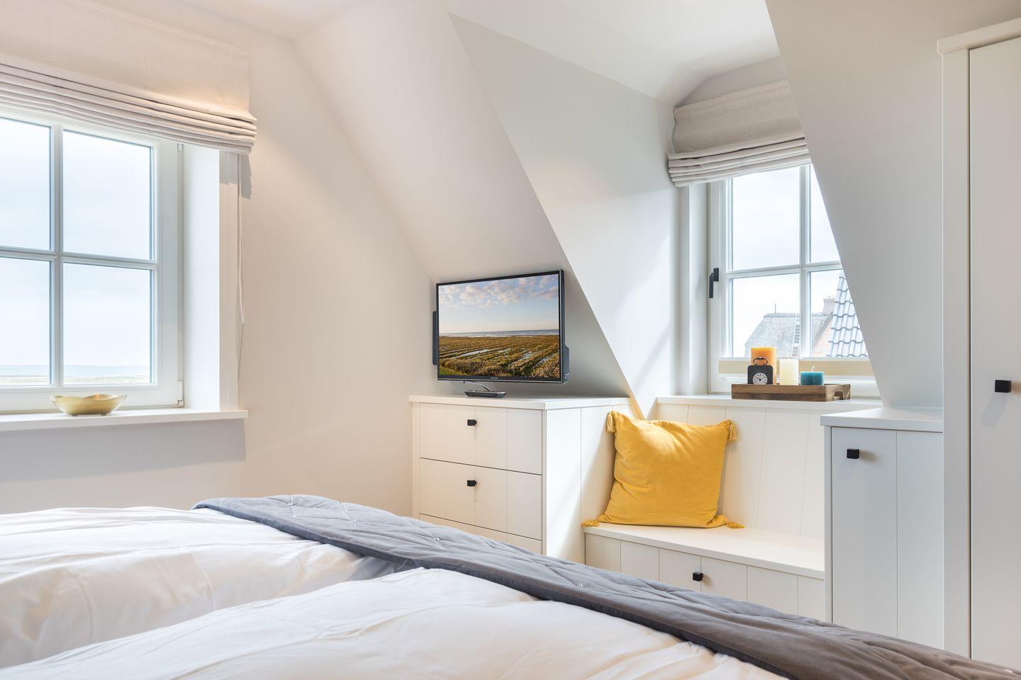 Im Obergeschoss des Hauses erwarten Sie zwei gemütliche und stilvolle Schlafräume die mit Parkettboden ausgelegt sind und mit jeweils einem Boxspring-Doppelbett und Flatscreen-TV eingerichtet wurden. Eines der Schlafzimmer verfügt über ein helles Badezimmer en-suite, ein weiteres Badezimmer ist vom Flur aus zu erreichen. Alles sind selbstverständlich hochwertige Tischlerarbeiten! Das Dachgeschoss des Hauses passt sich individuell an Ihre Bedürfnisse an. Egal, ob Sie sich beim Yoga oder auf den Wellness-Liegen entspannen möchten oder mit einem atemberaubenden Wattblick doch noch ein paar Stunden am Schreibtisch arbeiten möchten, hier ist all das möglich. Für die kleinsten Urlauber wartet hier außerdem ein interaktiver Sylt-Spieleteppich, der Ihren Kindern sicherlich viel Freude bereiten wird.