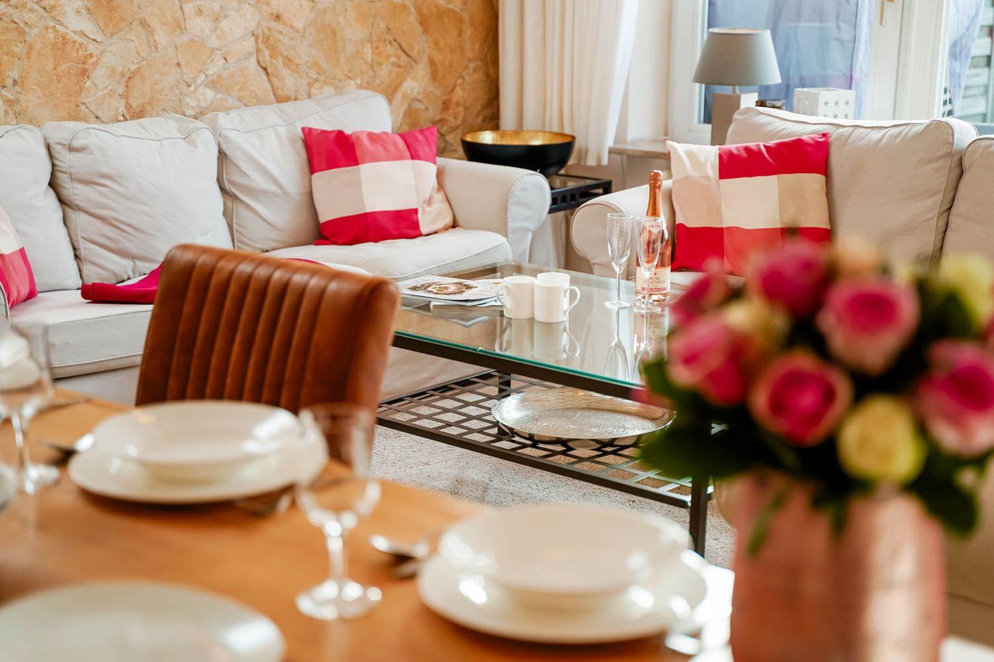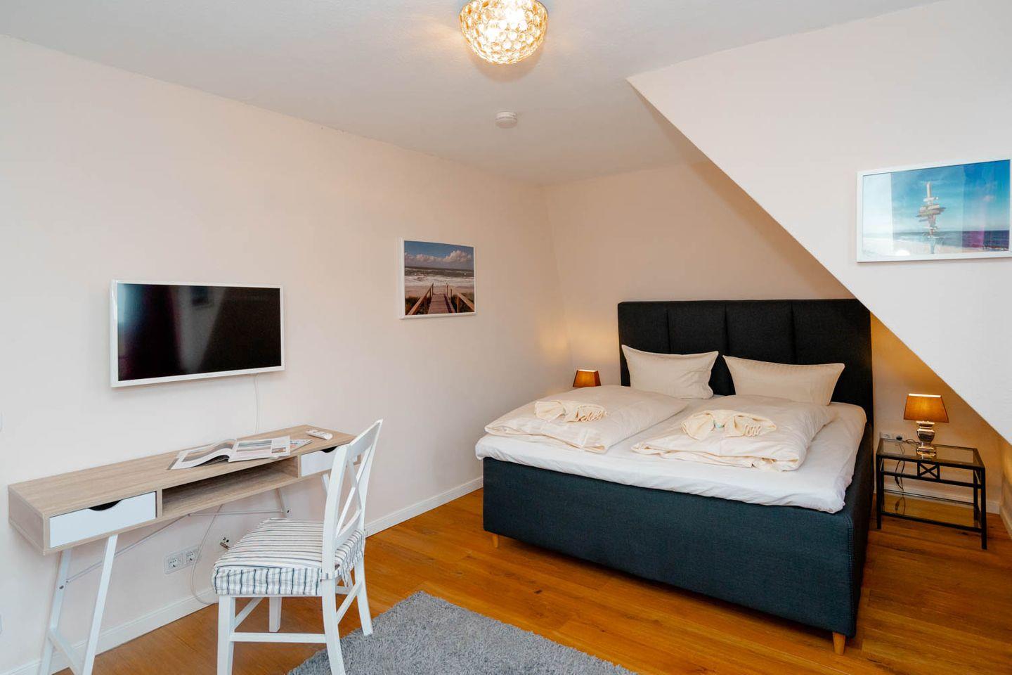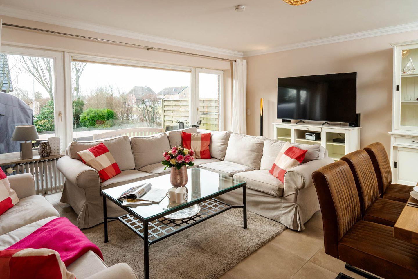 Herzlich Willkommen im Haus "Sprotte": Diese schöne Doppelhaushälfte bietet Ihnen auf ungefähr 100 Quadratmetern Wohnfläche ausreichend Platz für bis zu sechs Personen. Ein wunderschöner Blick in die weitläufigen Tinnumer Wiesen, eine große und möblierte Süd-Terrasse und der eingewachsene Garten sind nicht die einzigen Vorteile dieses Ferienhausteils: Ein Kamin, Holzdielenboden und attraktiver Wohnzimmerwandputz in Steinoptik sorgen für den individuellen Charme des Urlaubsdomizils.