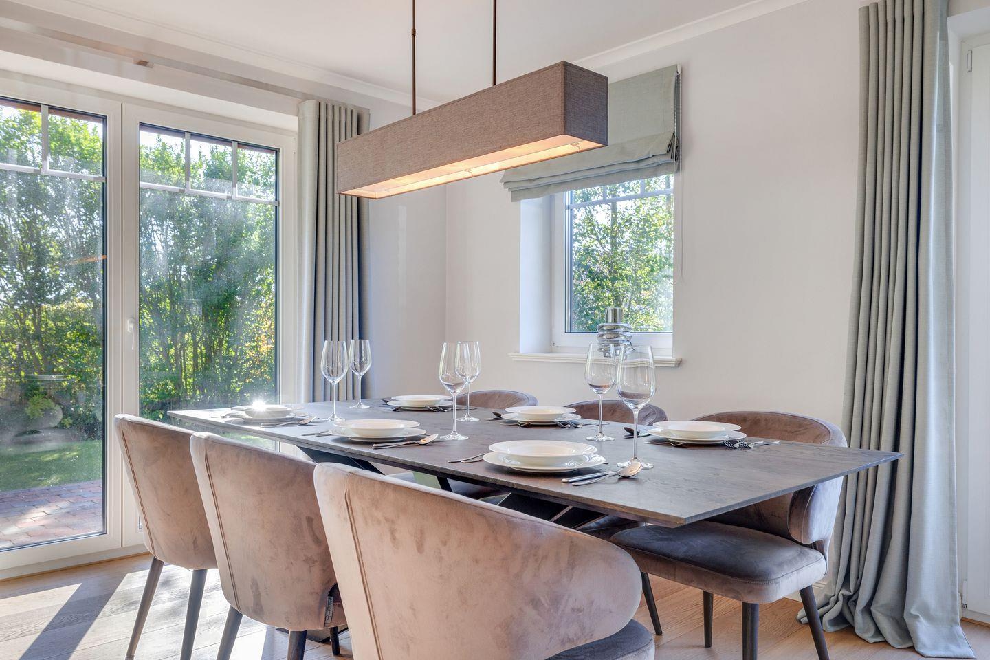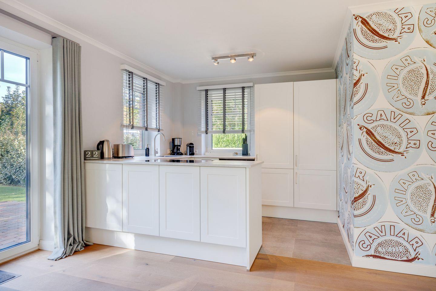 Der Wohnraum des Hauses bietet Ihnen eine große Couchecke mit Flatscreen-TV und bodentiefen Fenstern, die die Sylter Sonne hereinscheinen lassen. Am Esstisch finden bis zu sechs Personen Platz und die Küche ist mit Induktionskochfeld, Backofen, Geschirrspülmaschine und Nespresso-Maschine top-ausgestattet. Vom Wohn-/Essbereich aus erreichen Sie Ihren privaten Garten mit zwei möblierten Terrassen (April bis Oktober). Auf gleicher Ebene zum Wohnraum finden Sie außerdem ein Gäste-WC.
