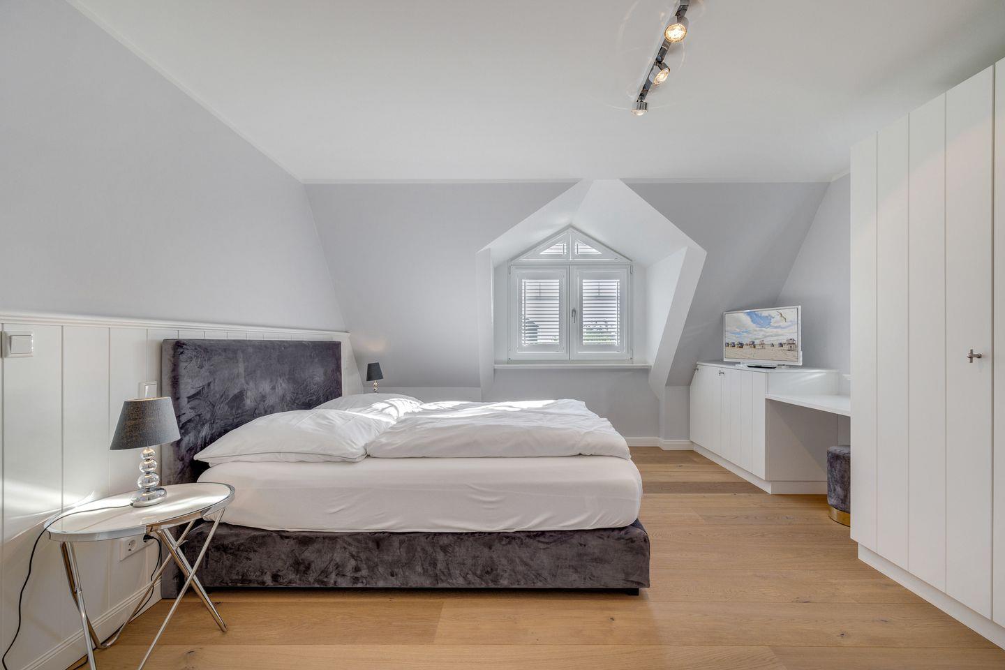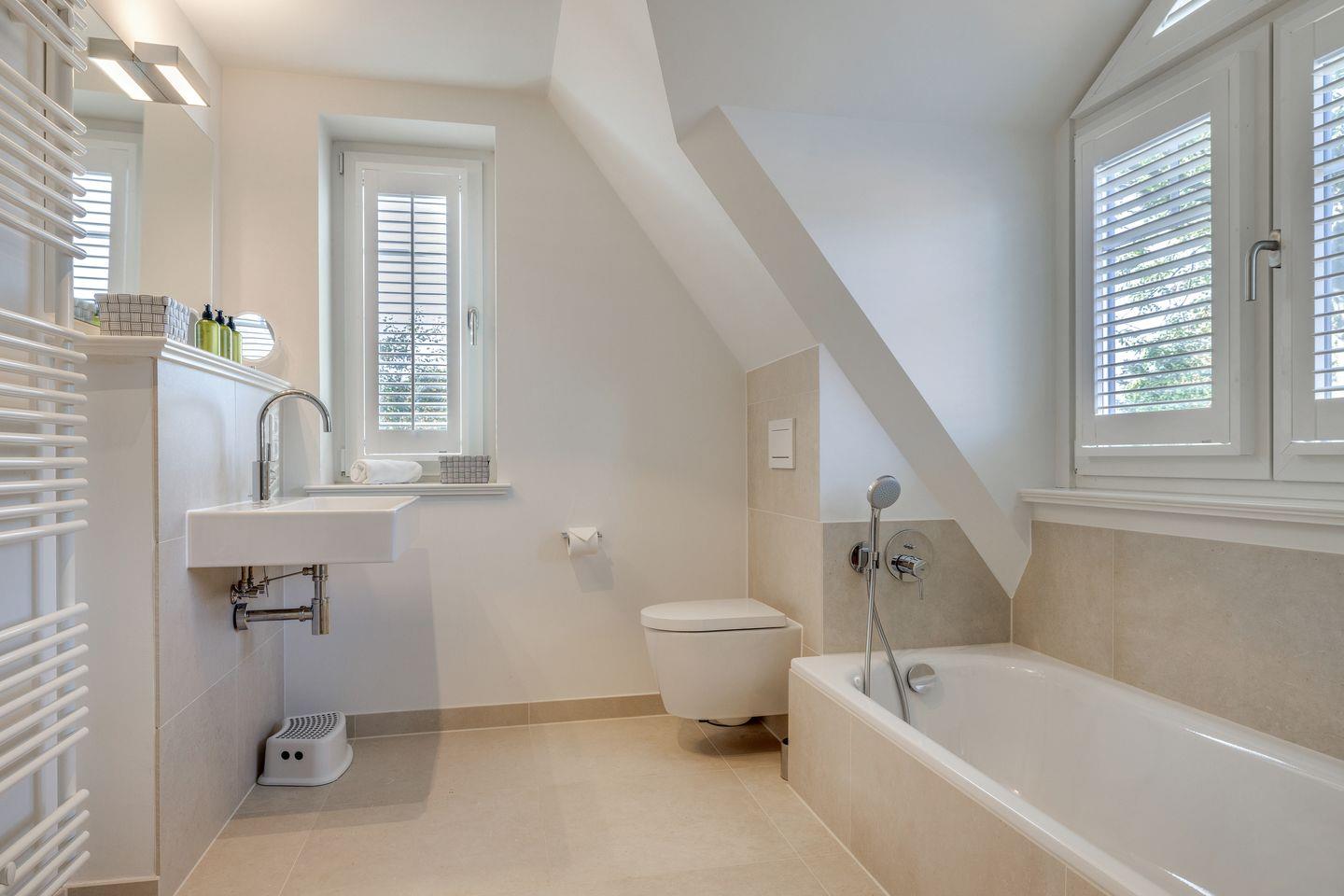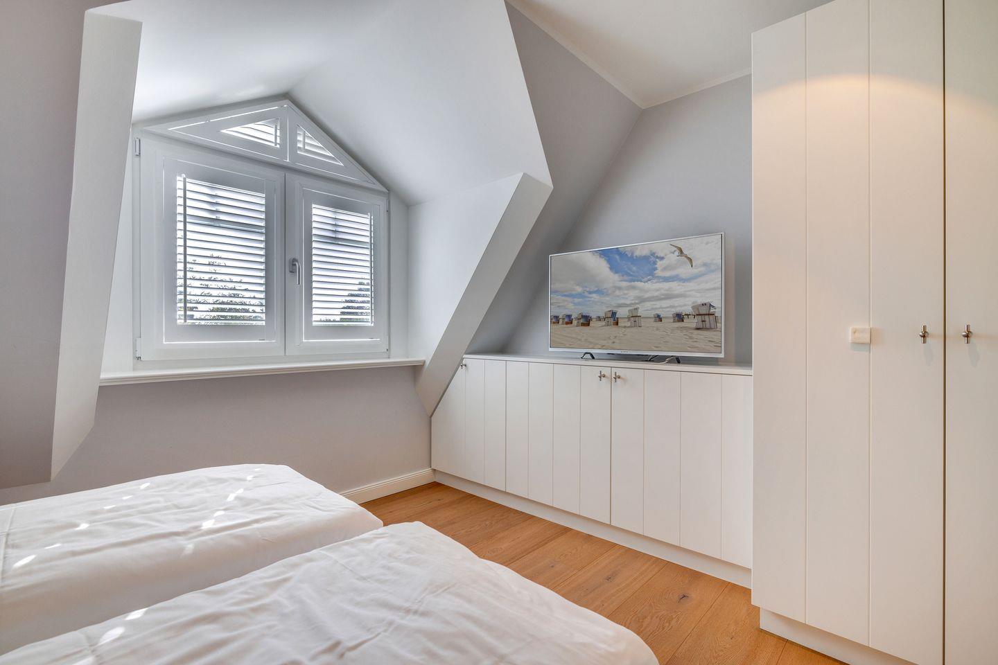 OG: ein Schlafzimmer mit Doppelbett (180x200cm) und Flatscreen-TV, ein Schlafzimmer mit Doppelbett (160x200cm) und Flatscreen-TV, ein Badezimmer mit Dusche, Badewanne und WC sowie ein weiteres Bad mit Dusche und WC