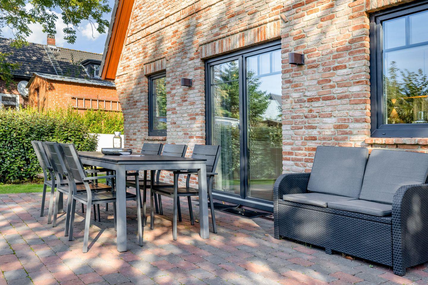 EG: Wohnraum mit Flatscreen-TV, W-Lan, Essbereich, offene Küche mit Backofen, Induktionsherd, Geschirrspülmaschine, Nespressomaschine, Gäste-WC, Garten und Terrasse mit Gartenmöbeln
