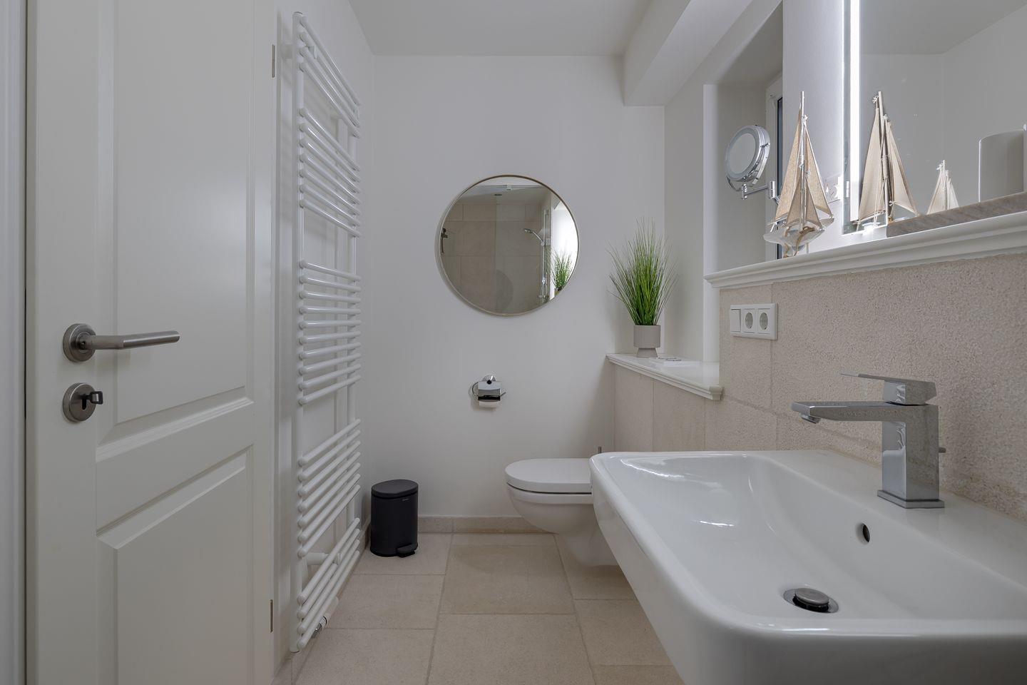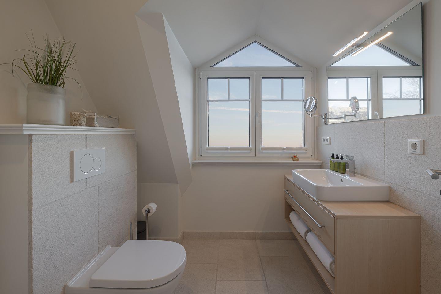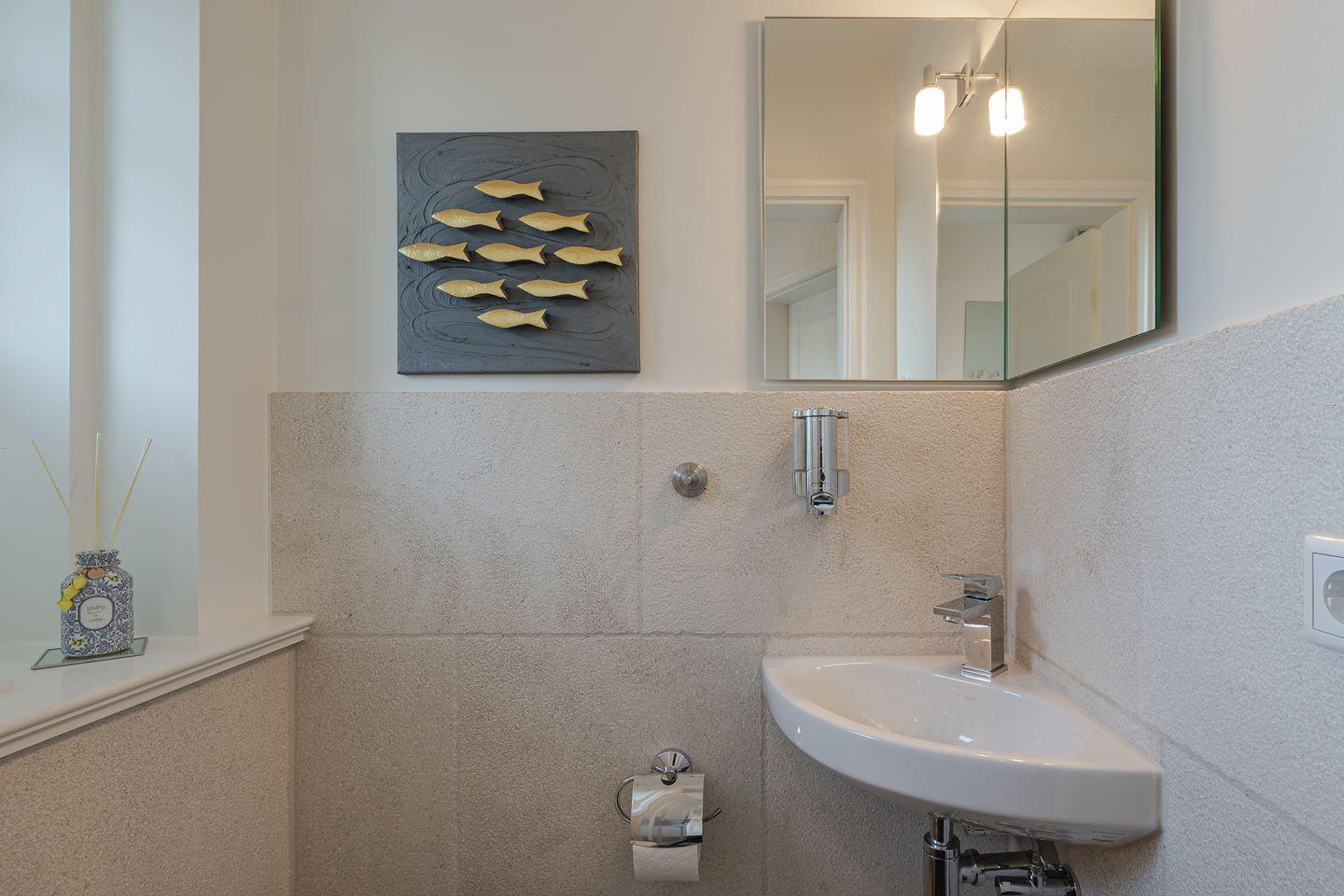Im Erdgeschoss empfängt Sie der Eingangsbereich mit Windfang und Garderobe, hier ist auch der Zugang zur Gästetoilette, die — wie die anderen Bäder auch - mit hellen Designer-Natursteinfliesen gestaltet ist.