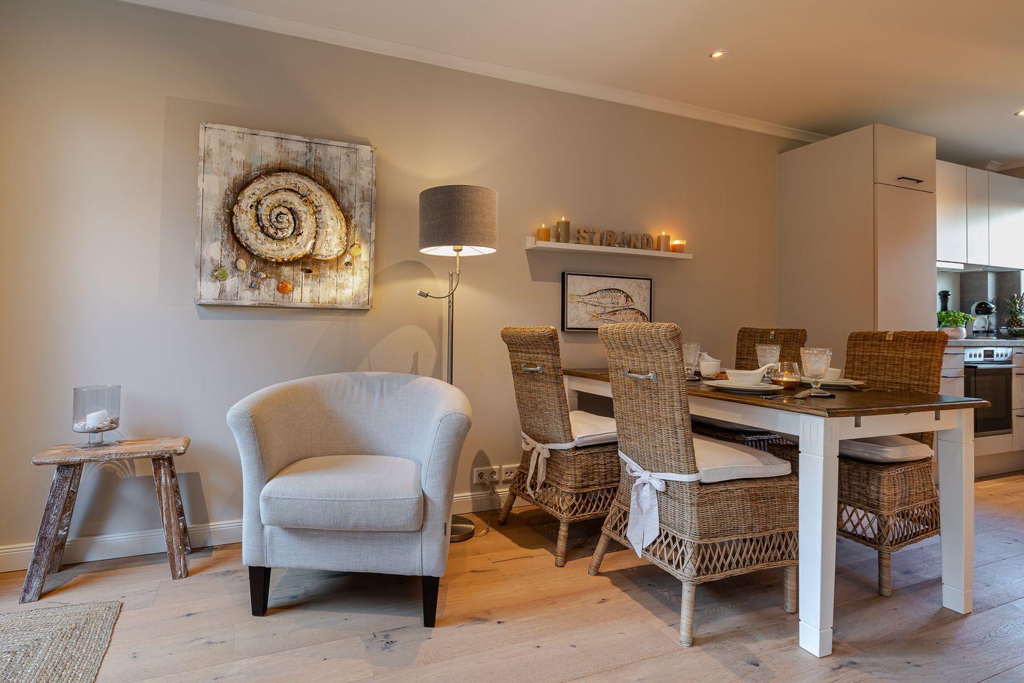 Hier schließt sich der gemütliche Essplatz sowie das Wohnzimmer mit Flatscreen-TV und einladender Sitzgruppe an, von wo aus Sie auch die Terrasse und den kleinen Garten in Süd-Westausrichtung mit Gartengestühl und Strandkorb, der auf Sylt nicht fehlen darf, erreichen.