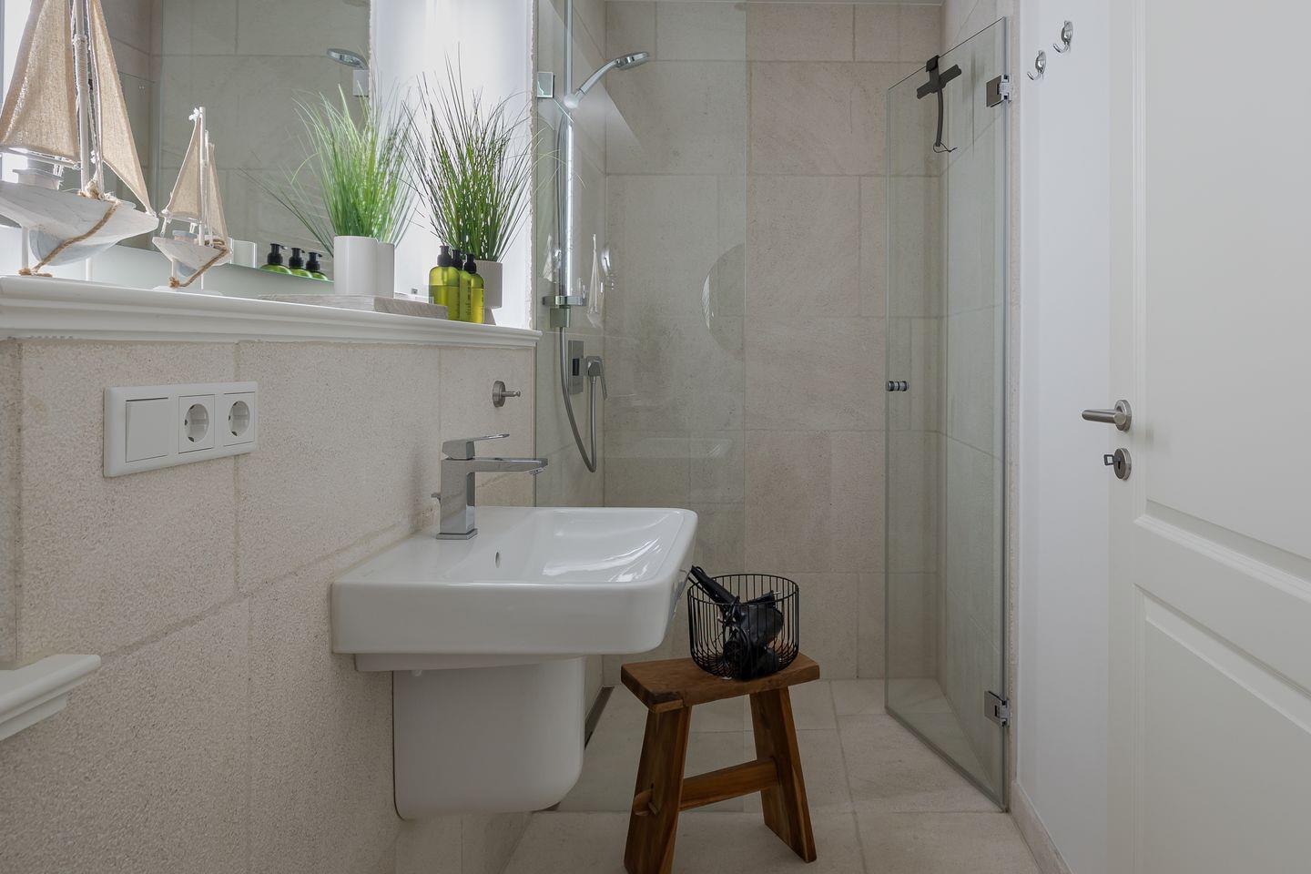 Andererseits führt die Treppe auch in den ersten Stock, wo Sie ein weiterer Schlafraum mit Boxspringbett, TV und Einbauschränken sowie ein identisch modern und vollständig ausgestattetes Bad empfängt.