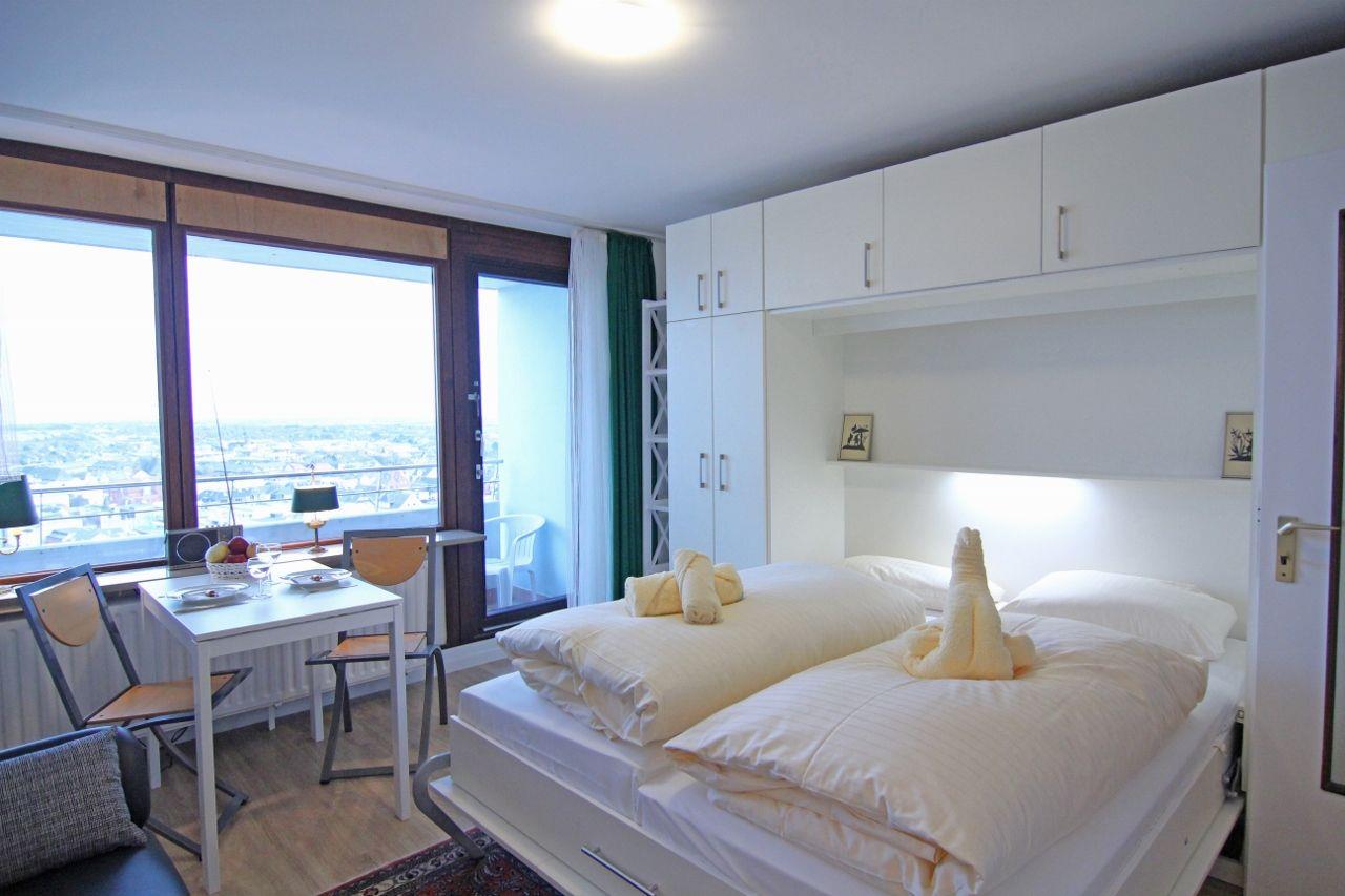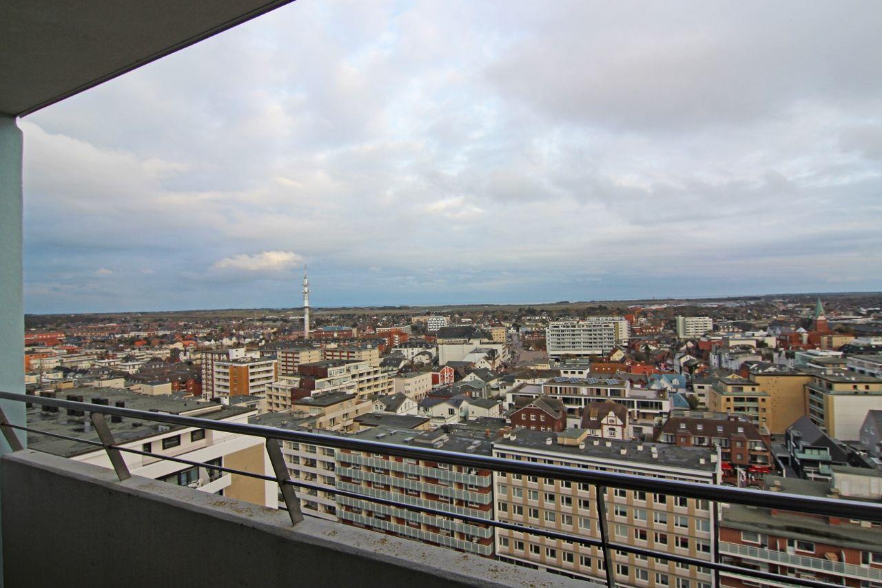 Willkommen im Appartement "Binnenkiker"! Diese Ferienwohnung ist ein stiller Star im Sortiment: Gelegen im 13. Stock des Westerländer Kurzentrums bietet sie einen unglaublichen Blick über ganz Westerland bis aufs Wattenmeer und wer möchte, kann den Sonnenaufgang vom Bett aus verfolgen. Der kleinen Balkon hat also eine Traumkulisse, nicht nur fürs Frühstück. Die Ferienwohnung ist 30 Quadratmeter groß. Selbstverständlich gibt es einen Fahrstuhl, aber Sportliche können natürlich gern auch das Treppenhaus für's Training nutzen.