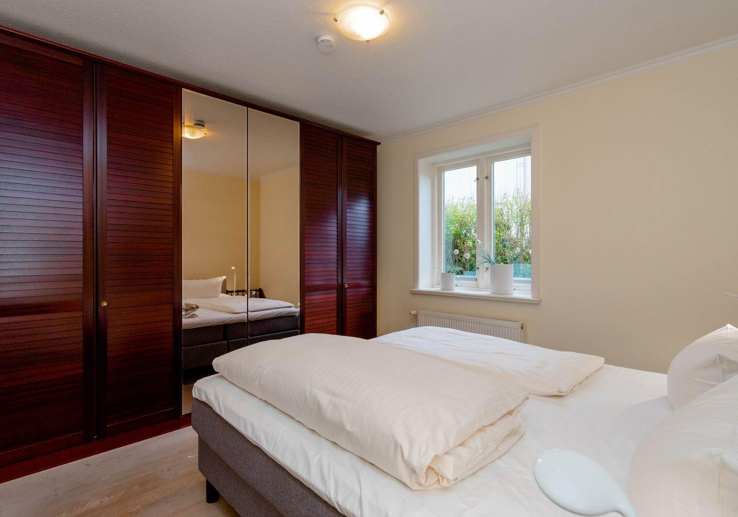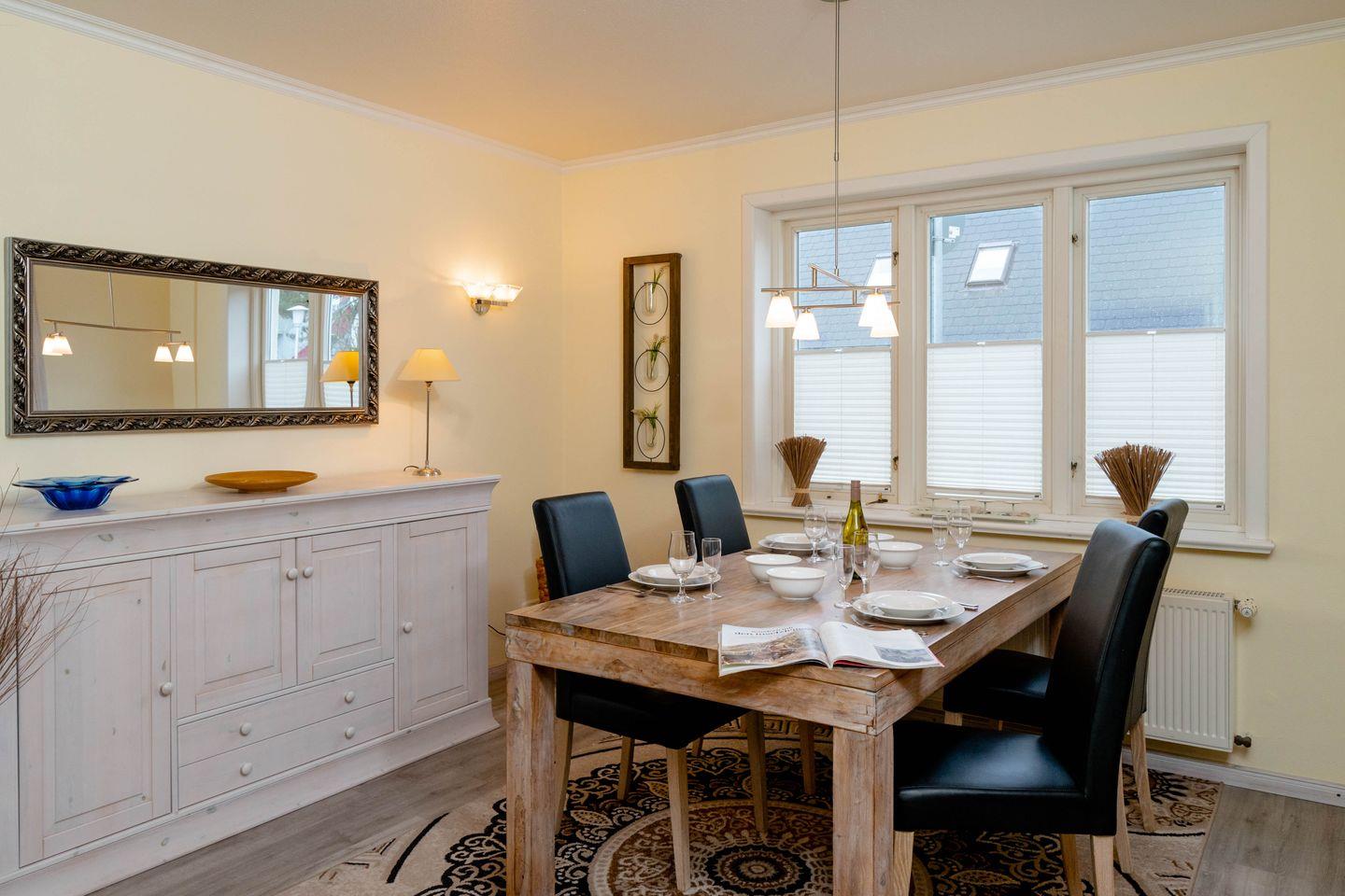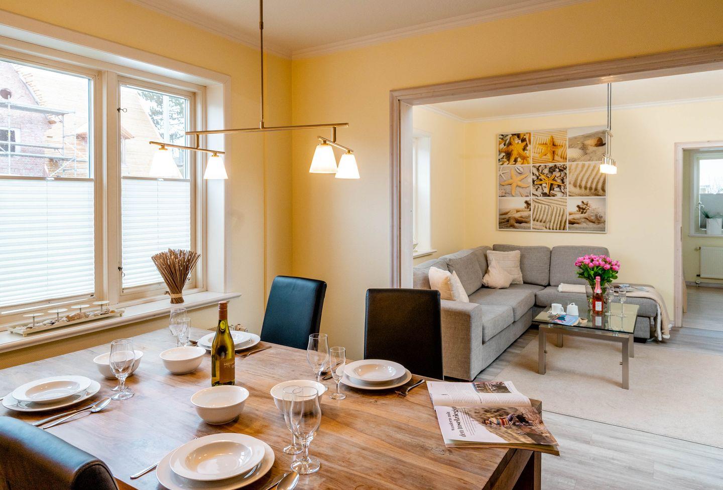 Moin, moin und Willkommen an Bord vom "Käpt'n", dieser ebenerdigen 3-Zimmer-Ferienwohnung für bis zu 4 Personen in Westerland, die auf großzügigen 80 Quadratmetern durch viele liebenswerte Details besticht. Ein schöner und wertiger Echtholzfußboden, attraktiv Holztüren in weißer Kalkbeize-Optik und dazu passende Einzelstücke fügen sich hier zu einem ganz eigenen, sehr inseligen und entspannten Einrichtungsstil. Die Wohnung ist wunderbar hell, sie hat eine separate Küche mit allem Drum und Dran, ein Esszimmer und neben dem großzügigen Wohnzimmer zwei geschickt angeordnete Doppelschlafzimmer, eins auf dieser, eins auf der gegenüberliegenden Seite der Wohnung. Womit sich dieses Ferienappartement auch für zwei befreundete Paare empfiehlt. Ihre Lage ist übrigens nahezu perfekt: in einer ruhigen Seitenstraße im Norden von Westerland und doch zentrumsnah und mit dem Strandübergang "Friesische Straße/Nordhedig" nur wenige Gehminuten entfernt. Dieser Strandübergang bietet einen gewissen "Luxus"