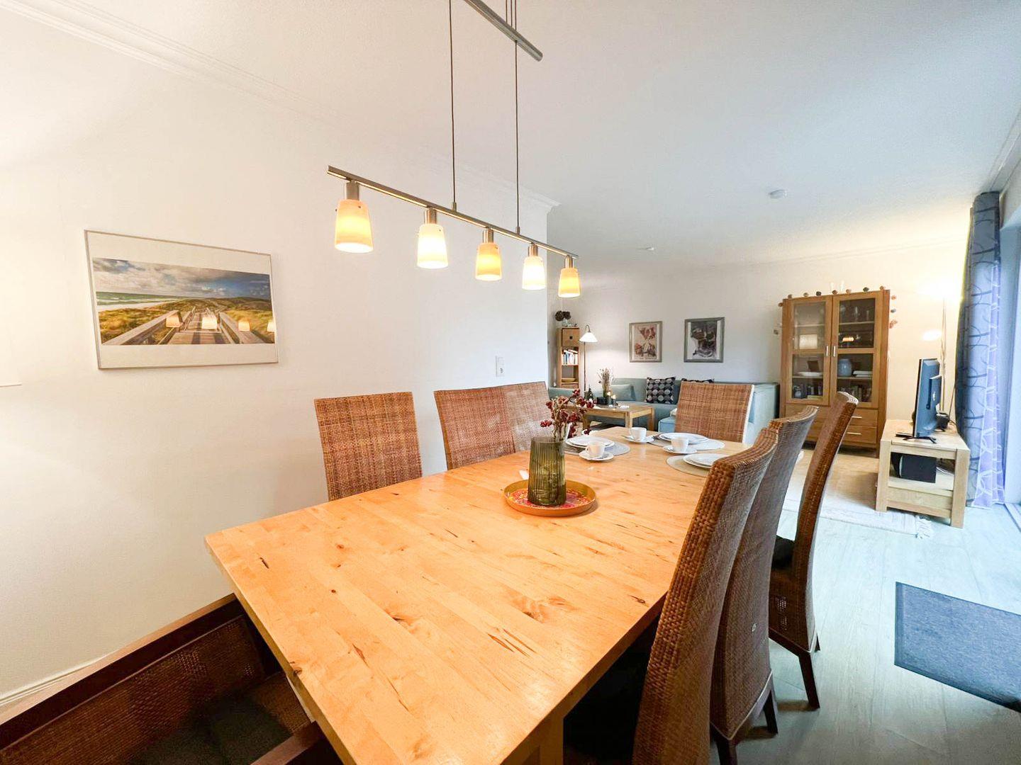 Herzlich willkommen im "Blaue Huis".Dies großzügige 4-Zimmer-Appartement fühlt sich fast wie ein Einzelhaus an. Das helle Wohn- und Esszimmer mit Kamin, ein Doppelschlafzimmer, vollausgestattete Extra-Küche und Duschbad befinden sich im Erdgeschoss. Die Süd-Terrasse mit Strandkorb bietet den perfekten Platz zum Entspannen. Im ruhigen Untergeschoss erwarten Sie zwei weitere Schlafzimmer, ein zweites Bad und die Luxus-Sauna. Die Lage zwischen Westerland und Wenningstedt ist ideal, nah zur Nordseeklinik und zum Strand. Ein Bäcker und Supermarkt sind um die Ecke.