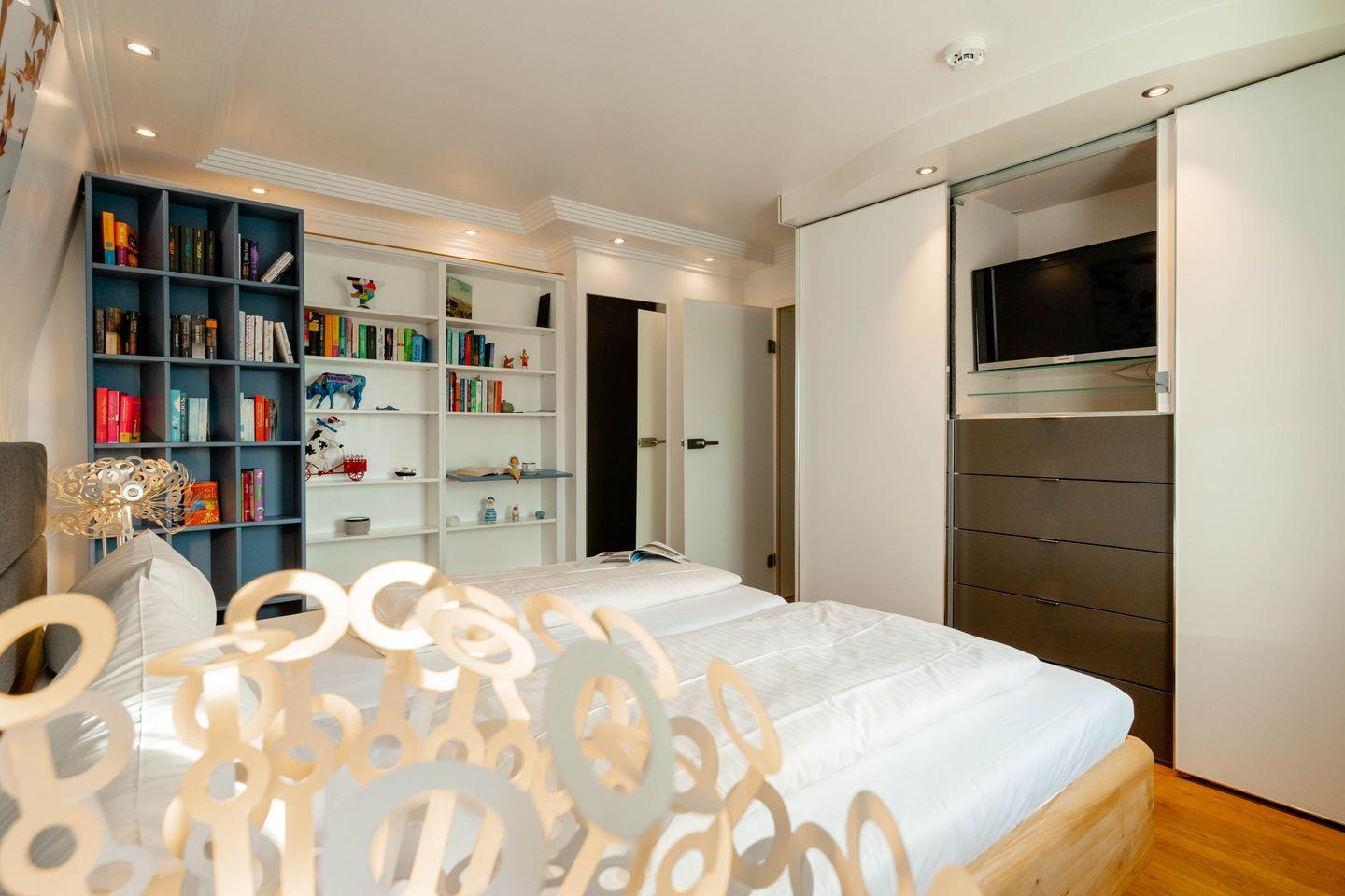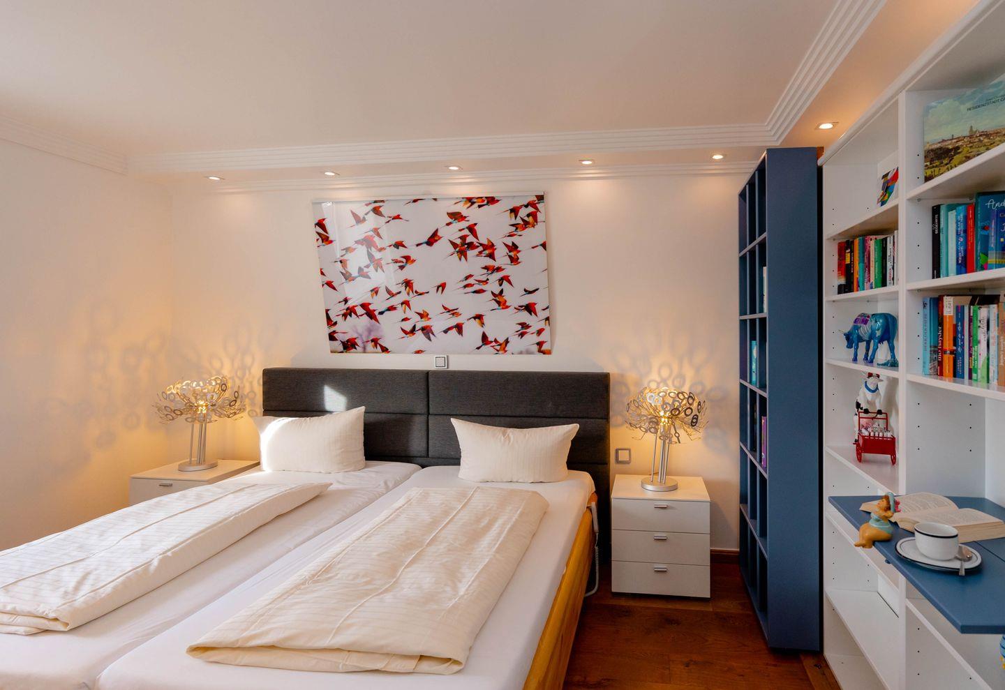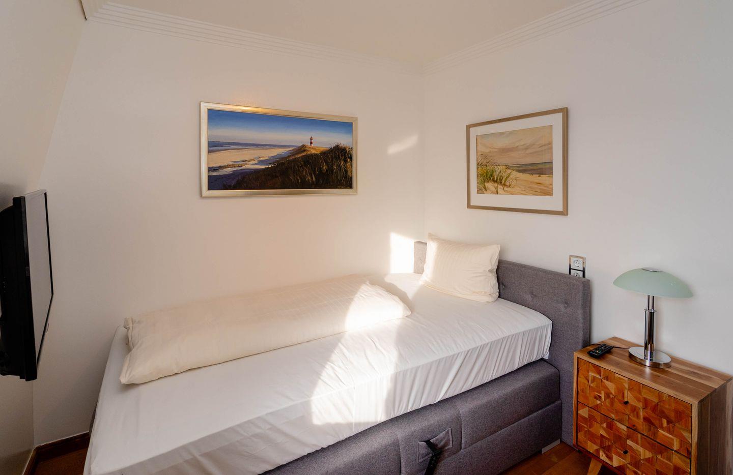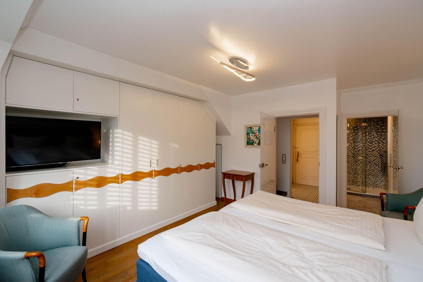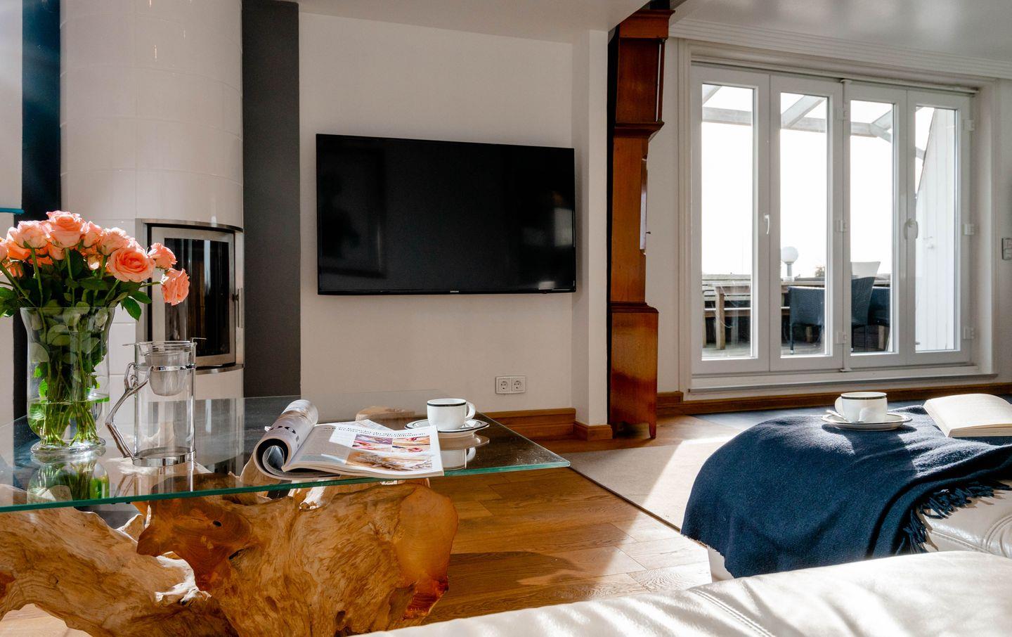 Das „Sommerwind“-Penthouse in Westerland ist ein Traum für Inselliebhaber. Mit vier Zimmern bietet es Platz für bis zu fünf Personen. Die zentrale Lage ermöglicht kurze Wege zu Shopping, Restaurants und dem Meer. Drei Schlafzimmer, zwei Badezimmer, ein Kamin-Kachelofen und eine Dachterrasse mit Westblick über die Inselhauptstadt sorgen für Flair. Der Einrichtungsstil verbindet Antiquitäten mit Moderne, warmem Holz und strahlendem Weiß. Perfekt ausgestattet inklusive Außenparkplatz.