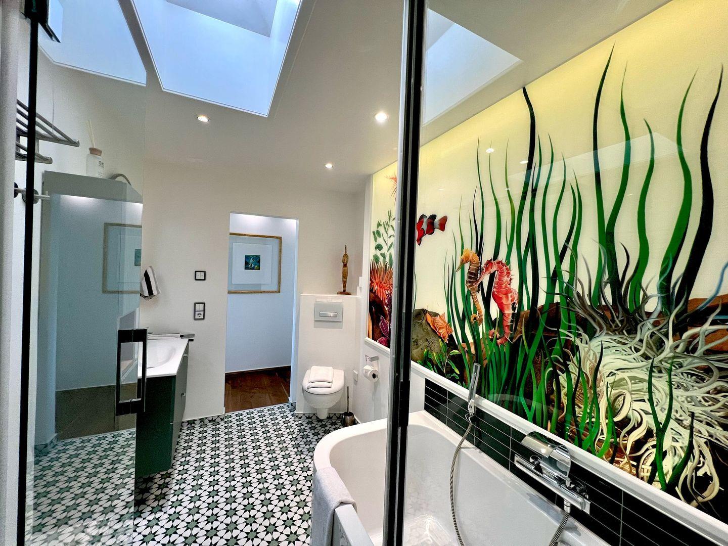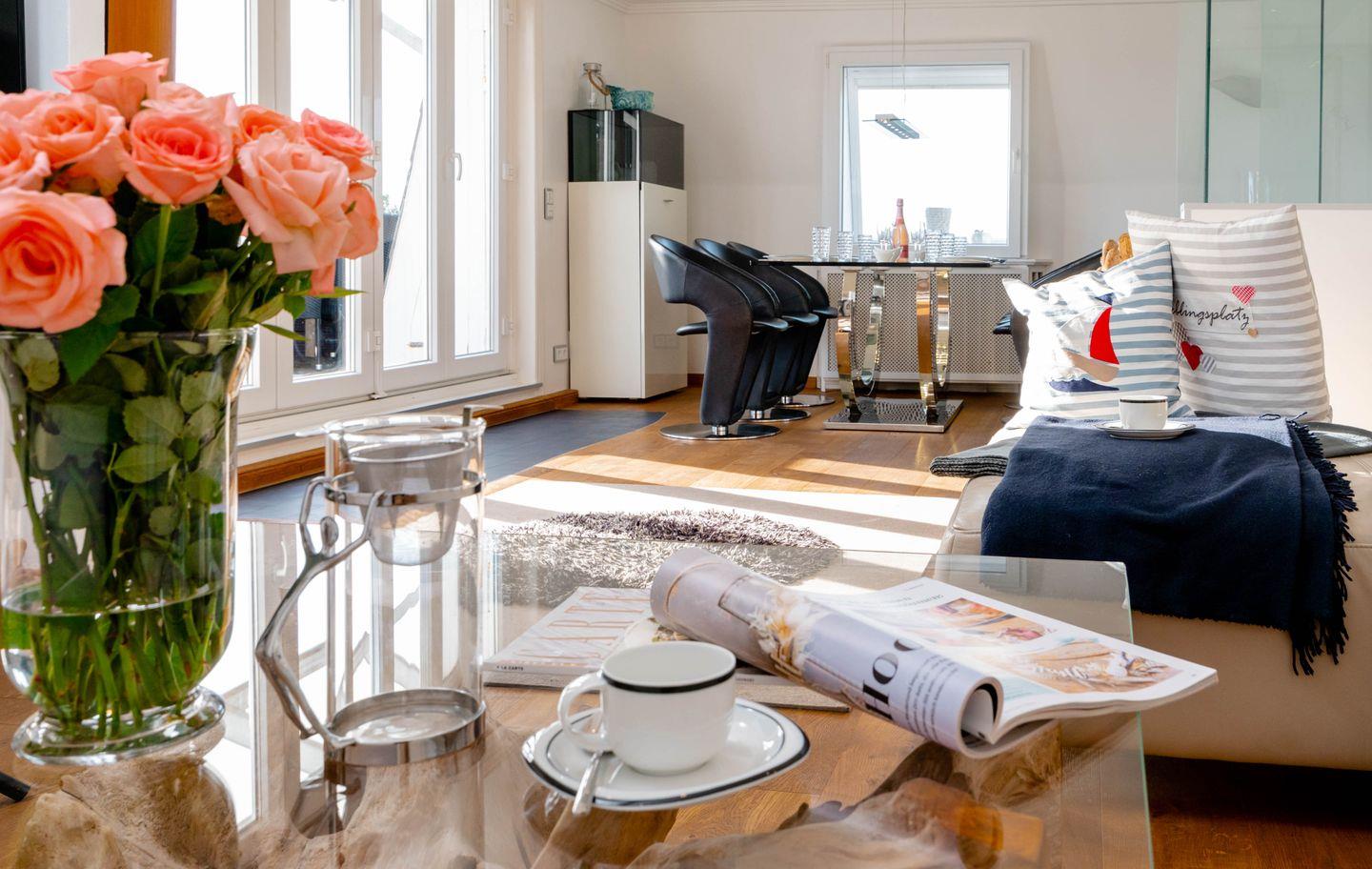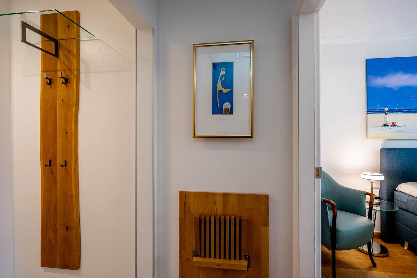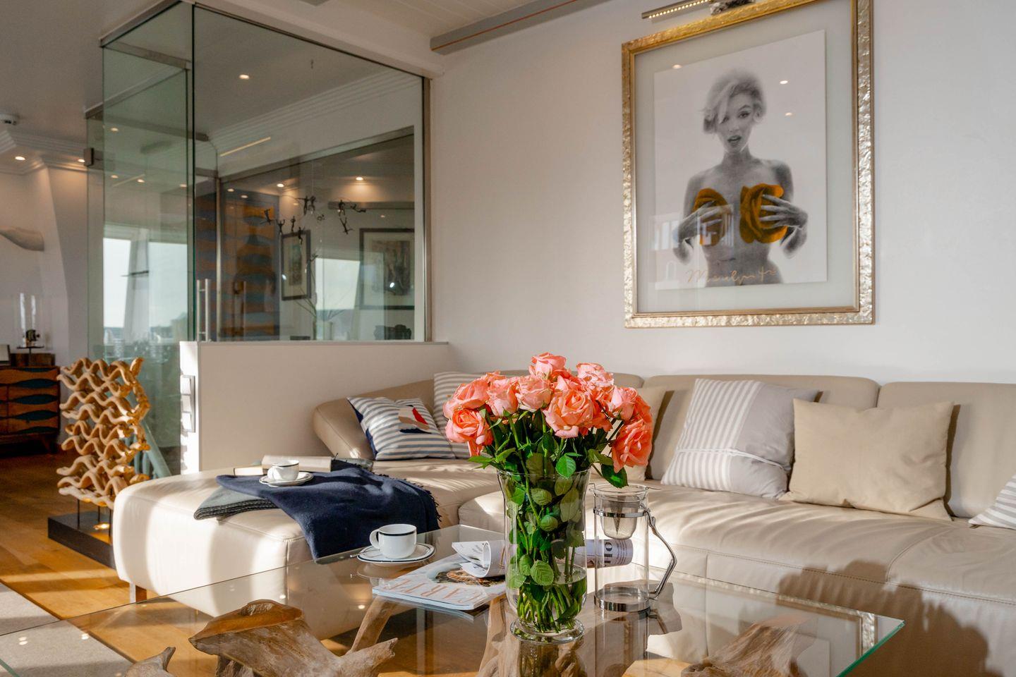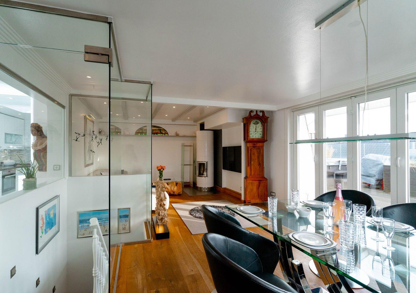 Moin, moin, dieser „Sommerwind“ ist etwas für Inselliebhaber, die das Außergewöhnliche suchen: ein 4-Zimmer-Ferienpenthouse für bis zu fünf Personen mit unglaublich vielen tollen Details. Da ist zunächst einmal die Lage: mitten in Westerland und doch etwas über den Dingen, mit kurzen Wegen zum Shopping, zu den Restaurants, Clubs und Supermärkten, zum Wochenmarkt, und wer ans Meer möchte, geht einfach nur einmal die Friedrichstraße „runter“ Richtung Westen. Drei Schlafzimmer, zwei Badezimmer, ein echter Kamin-Kachelofen und eine Dachterrasse nach Westen mit großartigem Blick über die Dächer der kleinen Inselhauptstadt sorgen für viel Flair in diesem Penthouse, das sich über zwei Ebenen zieht. Aber der Clou ist der wirklich besondere Einrichtungsstil dieses Objekts: Antiquitäten und Moderne, viel warmes Holz und strahlendes Weiß samt Glas verbinden sich mit raffinierten Einbauten und liebevoll ausgewählter Kunst zu einem attraktiven und sehr individuellen Mix. Müssen wir noch erwähnen,dass dieses Penthouse perfekt ausgestattet ist und sogar noch ein Außenparkplatz dazugehört.