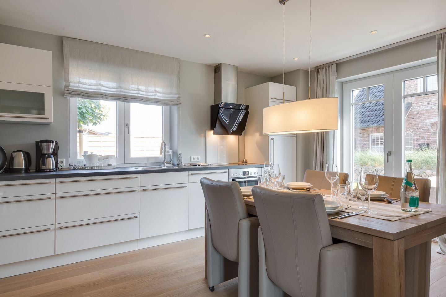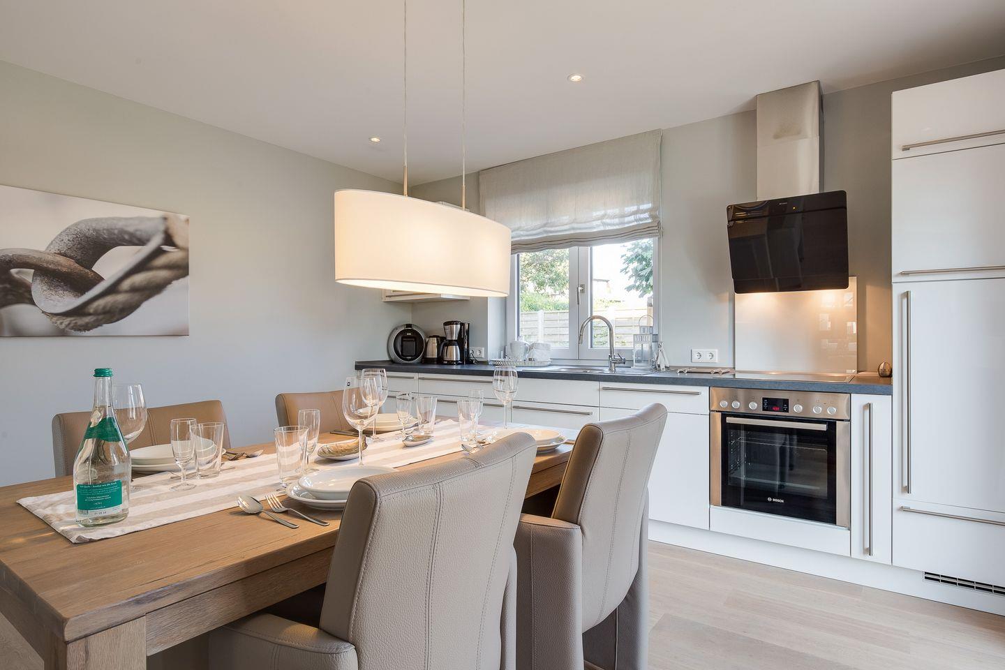 Ihr schöner Essbereich befindet sich vor der luxuriösen Küche, die Ihnen alles bietet, was Ihnen -auch als ambitioniertem Hobbykoch- goutiert. Ebenfalls im Erdgeschoss befindet sich ein Schlafbereich mit Doppelbett (180x200cm) und Flat-TV sowie ein modernes Luxusbad mit großzügiger Dusche, feinen Materialien und Armaturen.