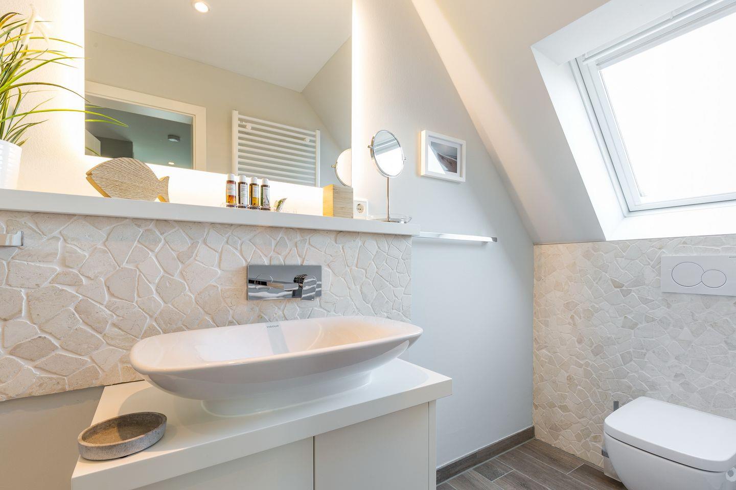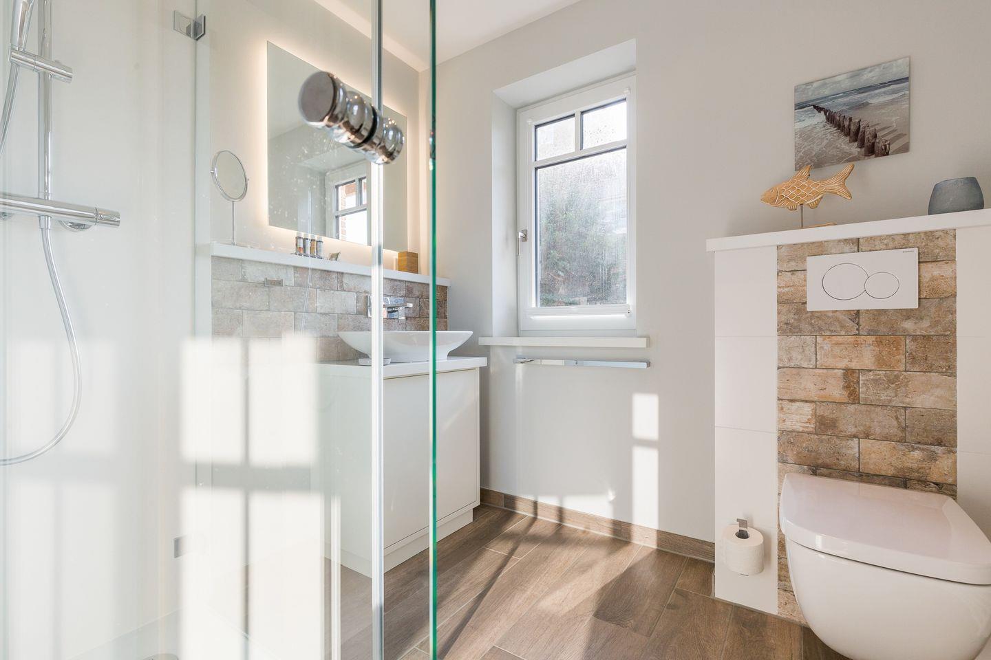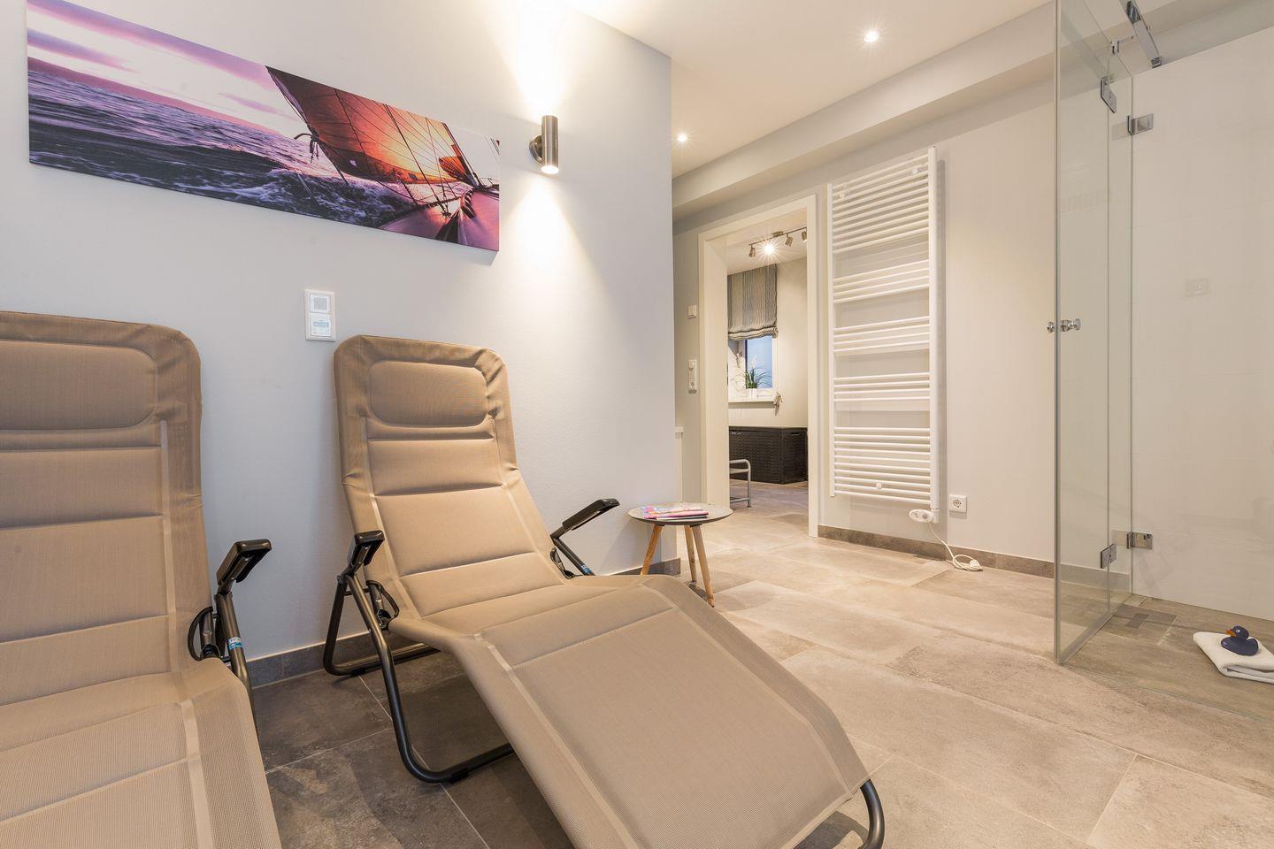 Als besonderes Highlight empfängt Sie in Ihrem "Wohnen und Mee(h)r im Souterrainbereich eine kleine Wellnessoase. Hier stehen Ihnen sowie Ihrem Domizilnachbarn im Obergeschoss (dieses Domizil ist also auch optimal für einen Urlaub zusammen mit einer befreundeten Familie oder Paar) eine wirklich großzügige Sauna und Duschbereich sowie eine kleine Waschküche zur Verfügung.