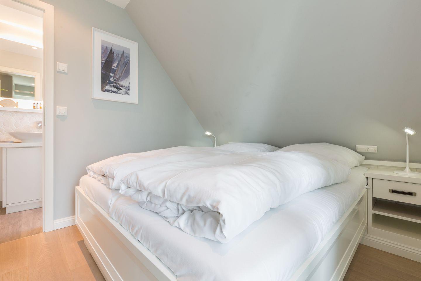 Über Ihre Design-Treppe "wandeln" Sie in den Obergeschossbereich, der nicht minder besonders gestaltet wurde. Hier steht Ihnen ebenfalls eine Räumlichkeit mit Doppelbett (160x200cm) sowie ein Wohlfühlbad mit Dusche zur Verfügung.