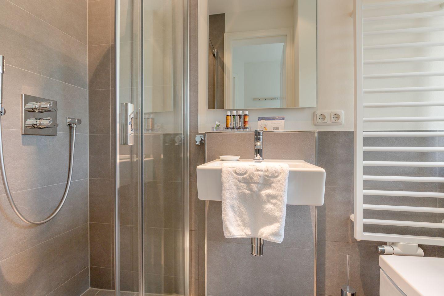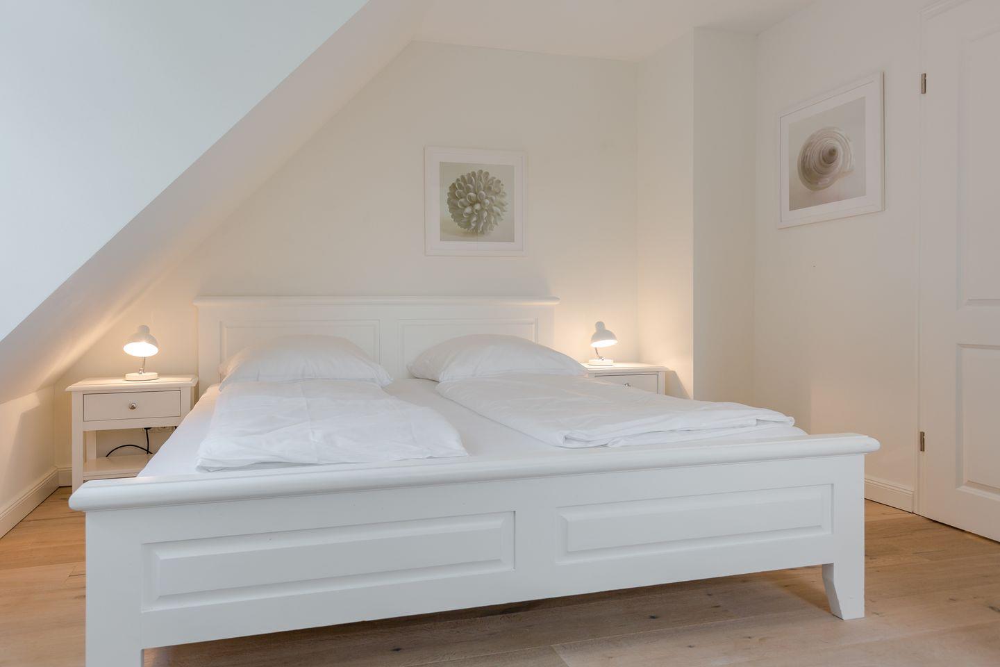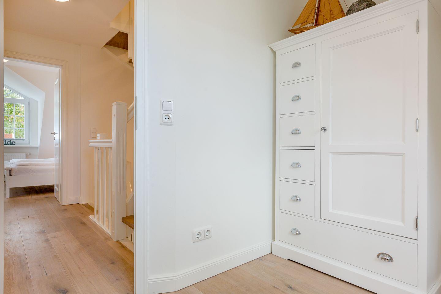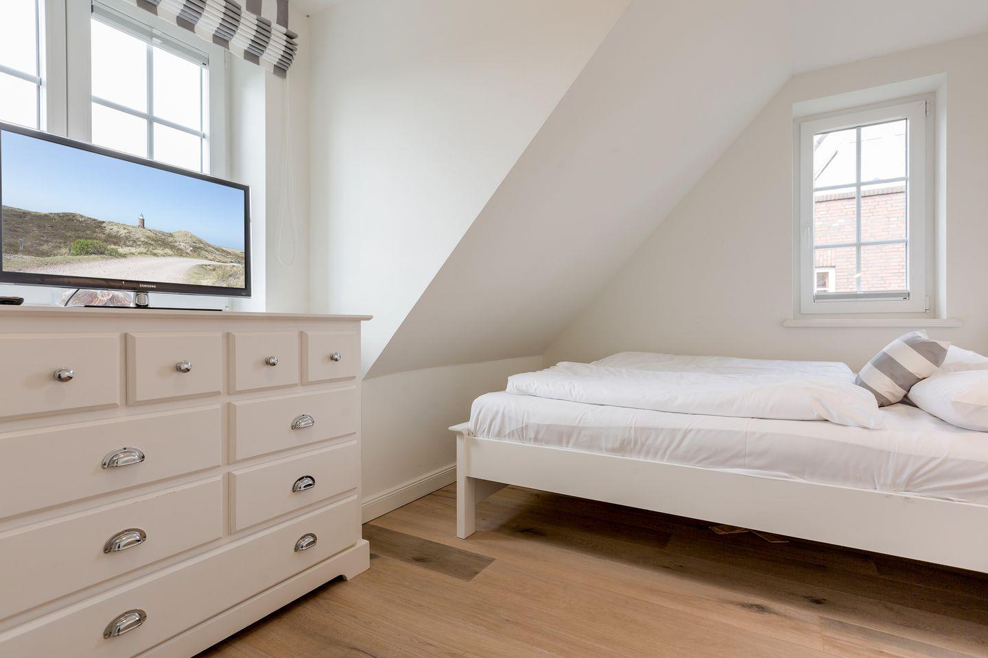 Das Obergeschoss des Hauses verfügt über einen Schlafraum mit Doppelbett, großzügigem Schrankplatz und Samsung Flat-TV. Auf dieser Etage finden Sie außerdem ein Wohlfühlbad mit Wanne, integrierter Dusche und WC. Im Obergeschoss befindet sich darüber hinaus ein weiterer, Schlafraum ebenfalls ausgestattet mit einem Doppelbett. Im Dachgeschoss des Hauses finden Sie einen weiteren Raum mit zwei Einzelbett und einem Flatscreen-TV.