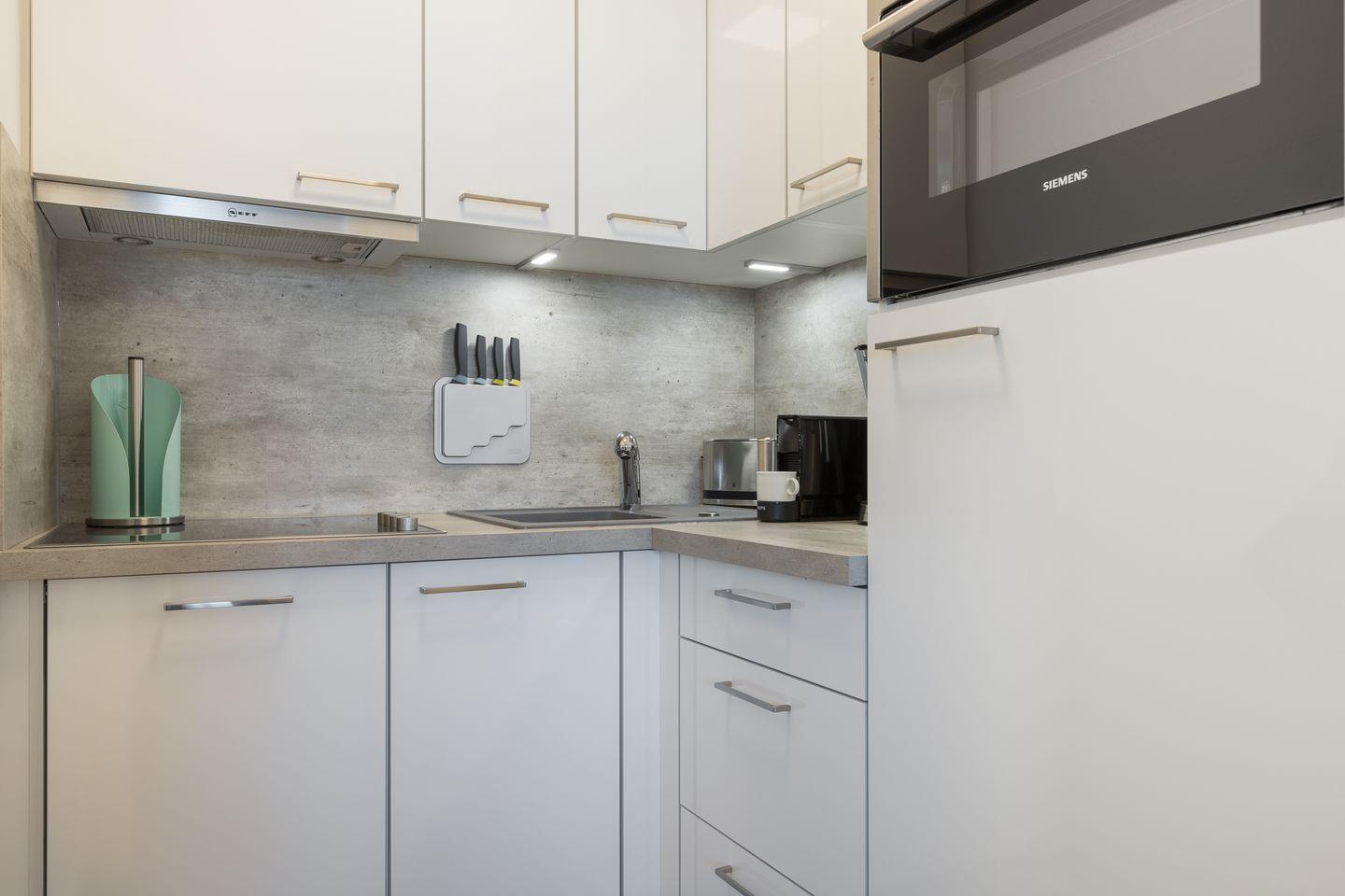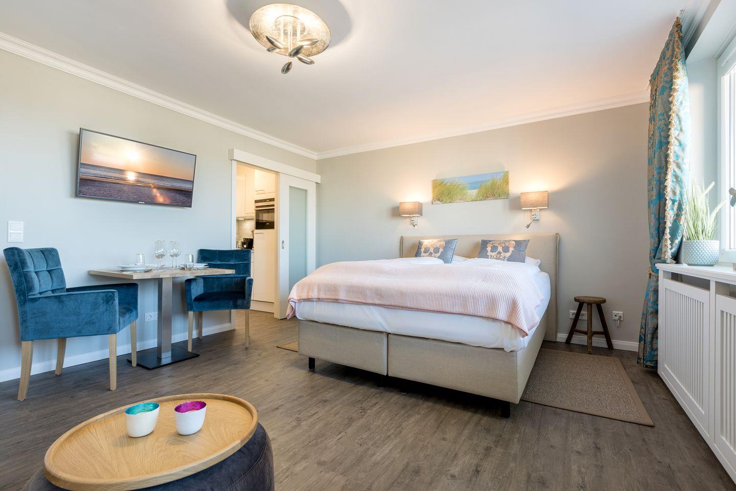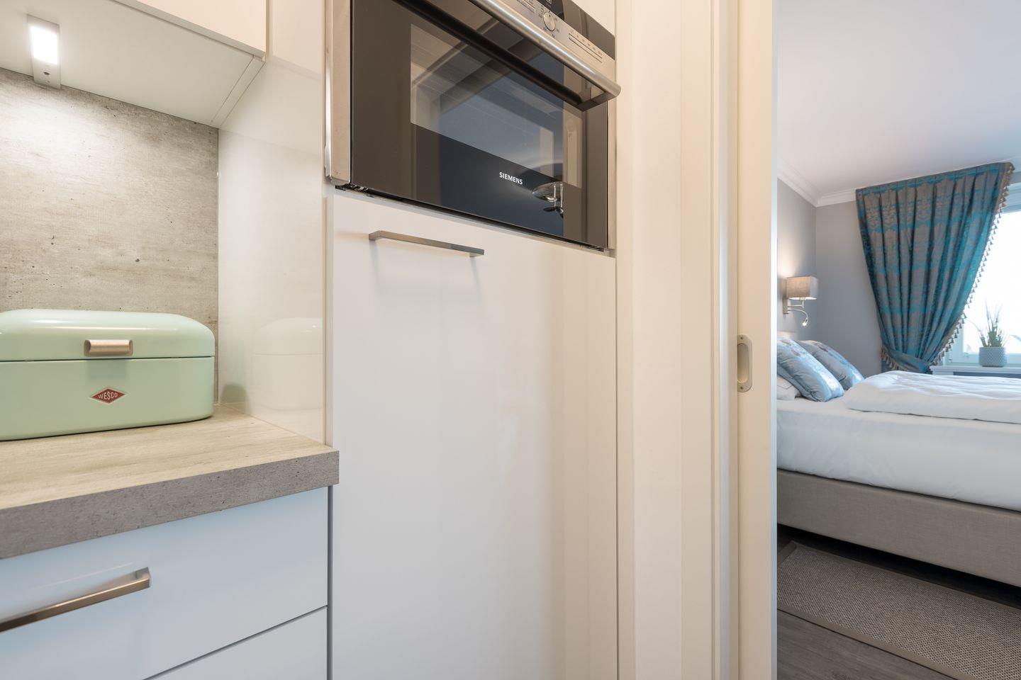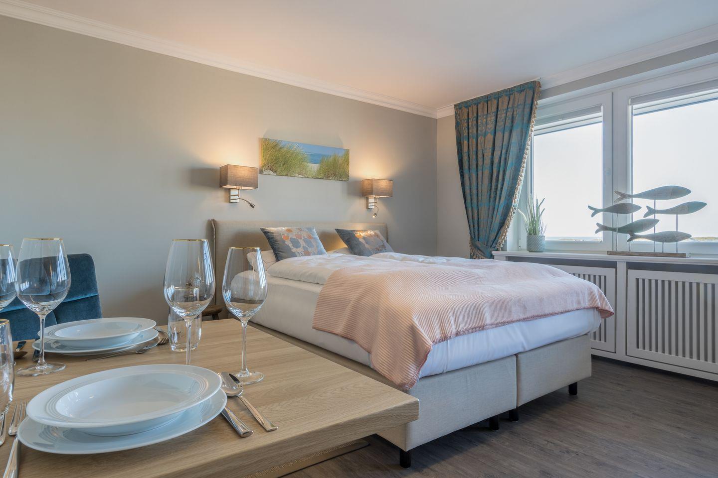 Diese moderne Ferienwohnung bietet Ihnen einen hellen kombinierten Wohn- und Schlafraum mit einem gemütlichen Sofa, einer bequemen Essgelegenheit und dem hochwertigen Boxspringbett (2x80x200cm). Das Highlight ist der Balkon mit direktem Meerblick, auch vom Sofa aus können Sie diesem Blick genießen. Vom Wohnzimmer geht die separate neu gestaltete Küche ab. Die Küche bietet alles was Sie in Ihrem Urlaub benötigen: Filterkaffeemaschine, Nespresso-Kaffeemaschine, Toaster, Wasserkocher, Eierkocher, Cerankochfeld mit 4 Platten, Backofen mit Mikrowelle, Geschirrspüler.