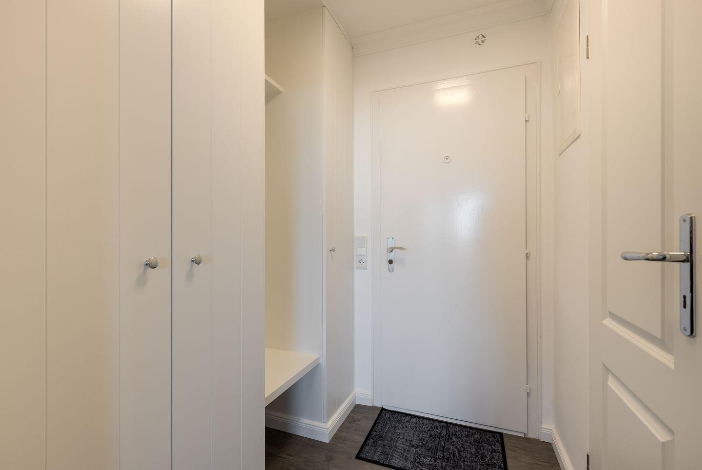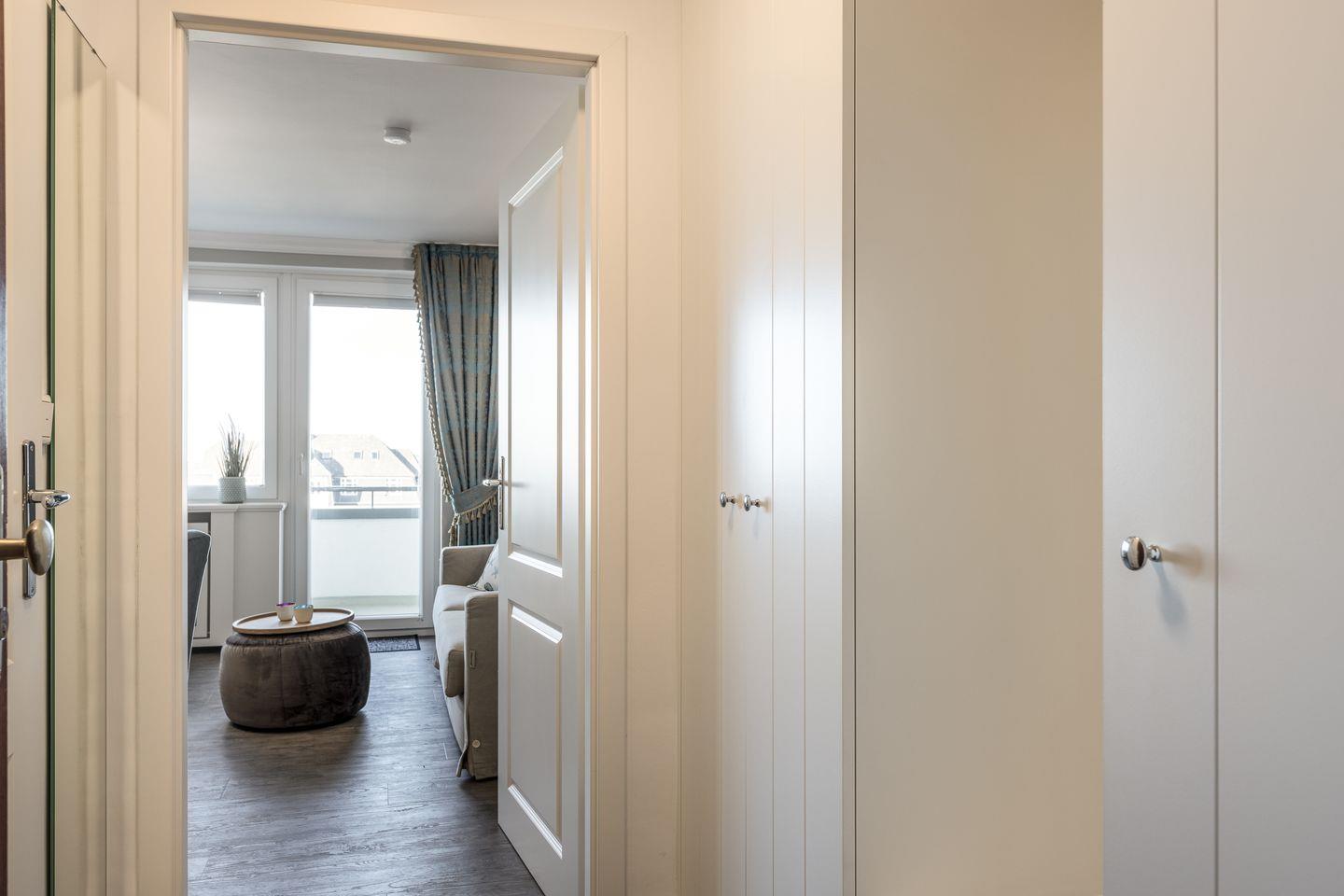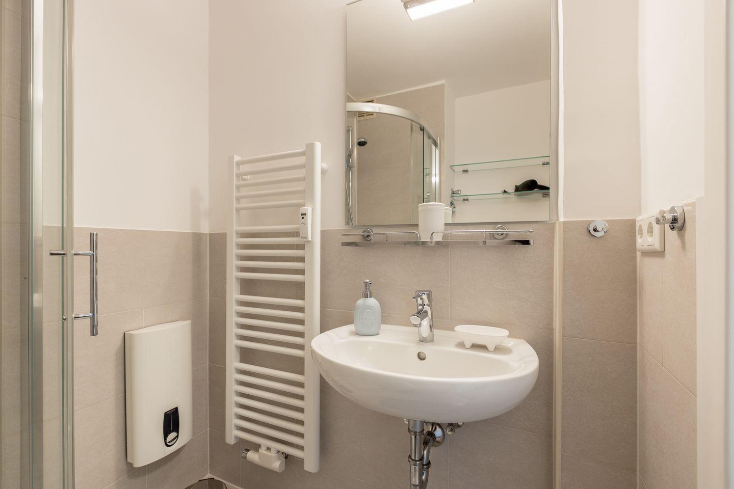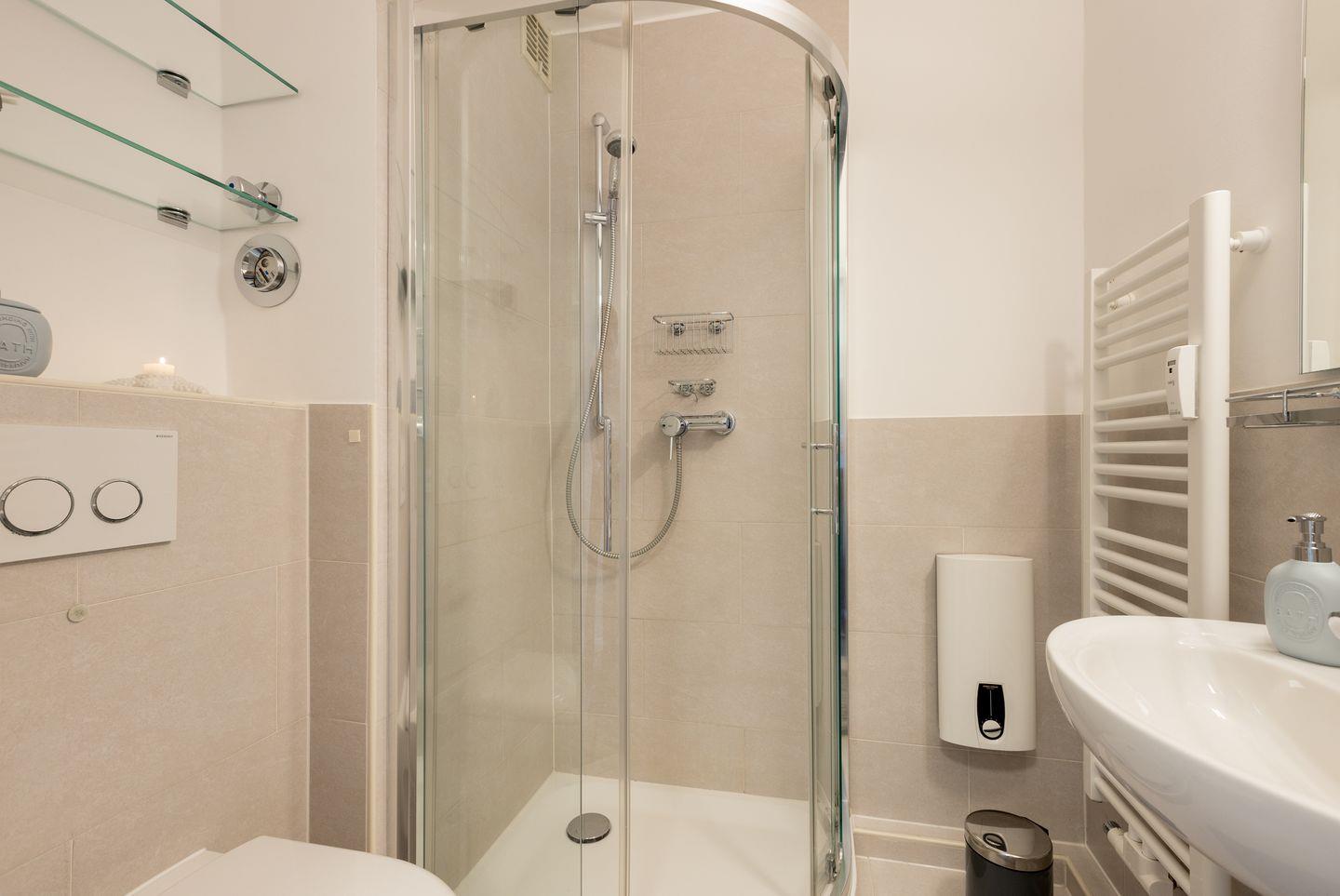 Im Flur befindet sich ein großzügiger Einbauschrank und eine Garderobe. Im Badezimmer steht Ihnen eine bodentiefe Dusche zur Verfügung, Glasregale sorgen für ausreichend Ablagefläche.