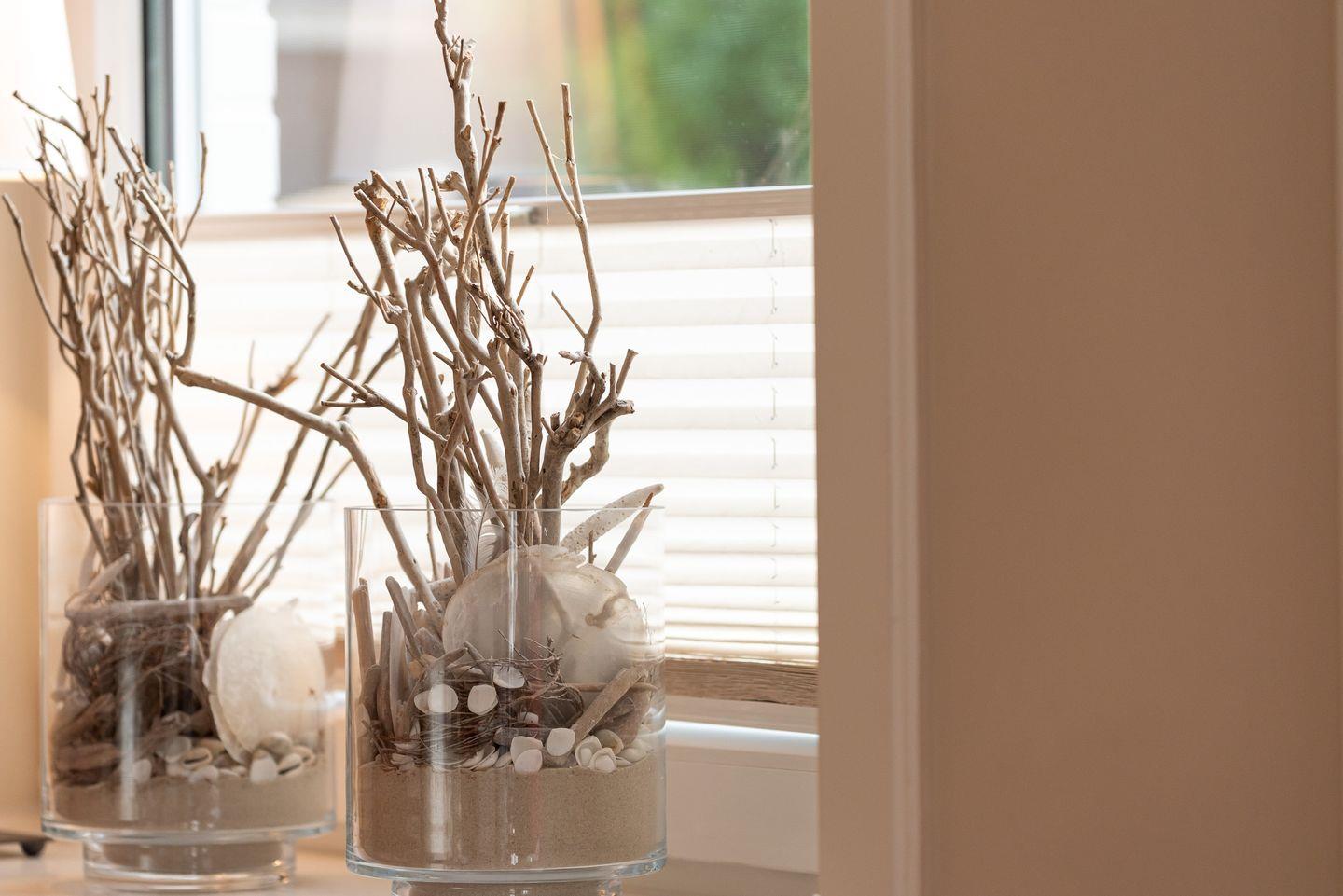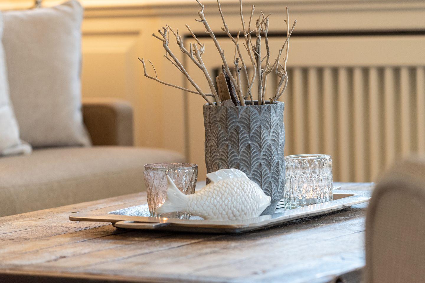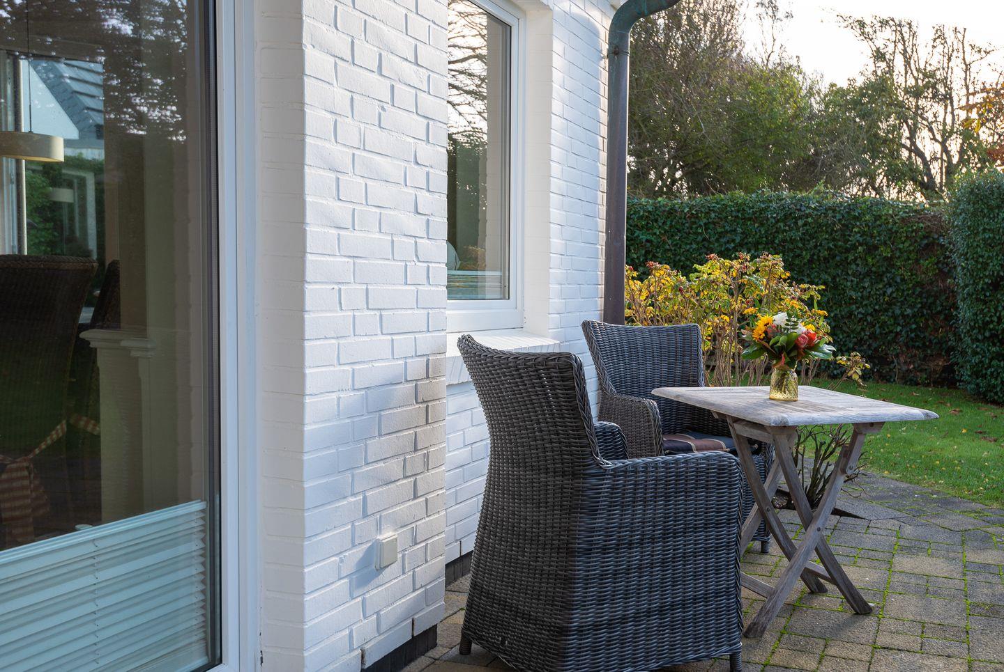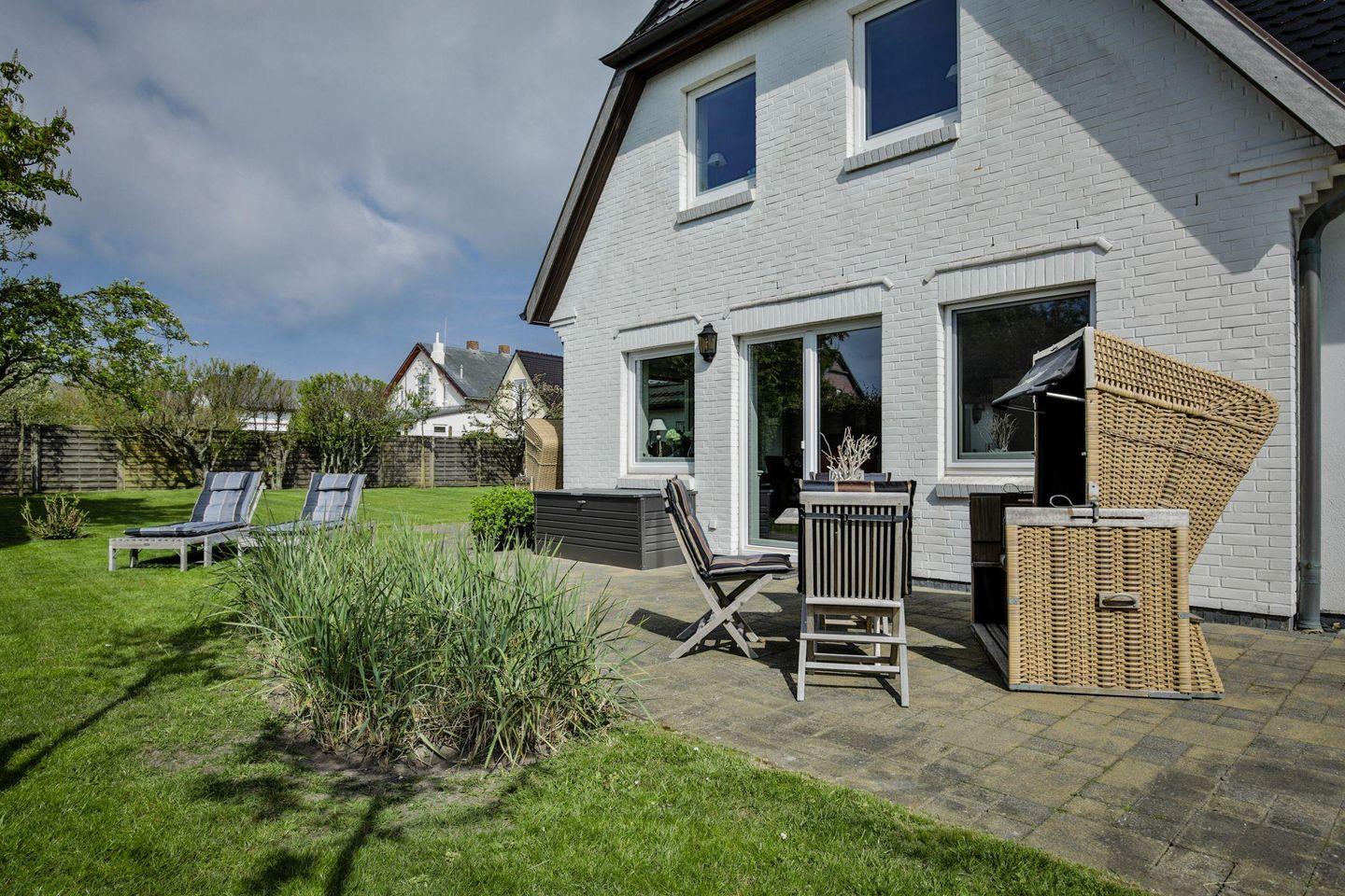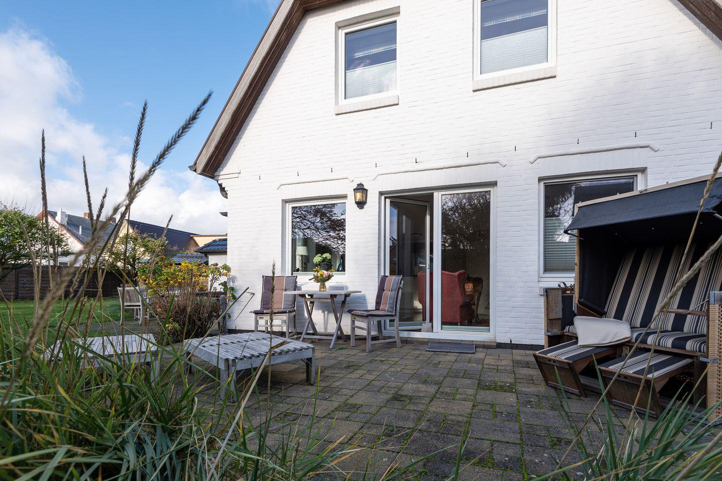Koch-/Wohn-/Essbereich: Die gut ausgestattete Küche im Landhausstil wird von einem großzügigen Essbereich für bis zu 6 Personen vom Wohnbereich abgegrenzt. Die gemütlichen Polstermöbel und Rattansessel im Wohnbereich laden zum Verweilen ein. Von dem Wohnbereich haben Sie ebenfalls Zutritt auf die mit Gartenmöbeln möblierte West-Terrasse. In Richtung Süden liegt eine weitere Terrasse mit zwei Strandkörben.