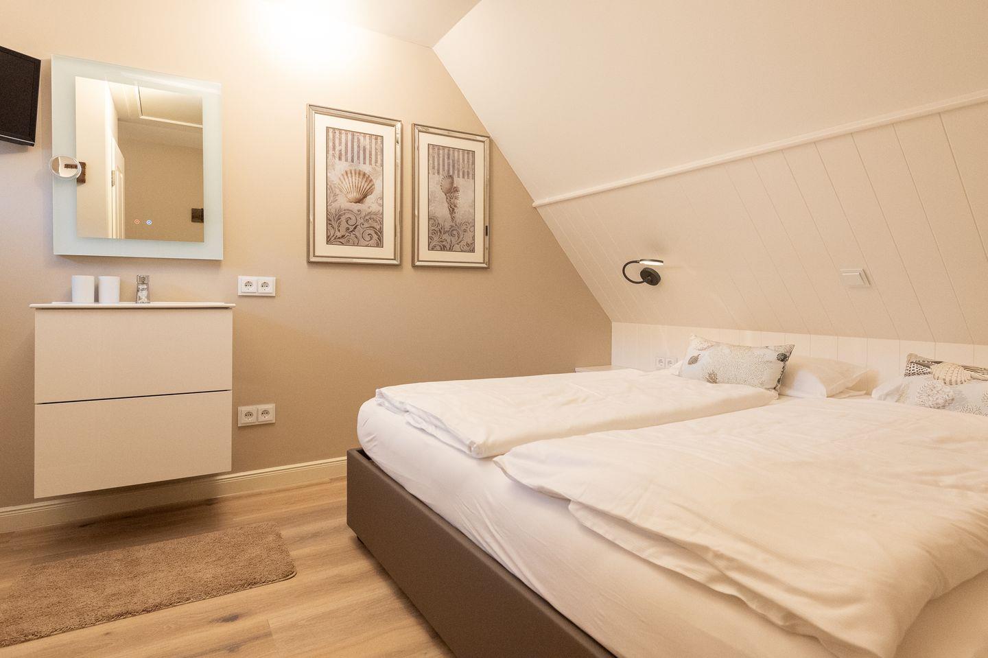 Schlafzimmer 1: Helles Doppelbettschlafzimmer mit Einbauschränken und TV.