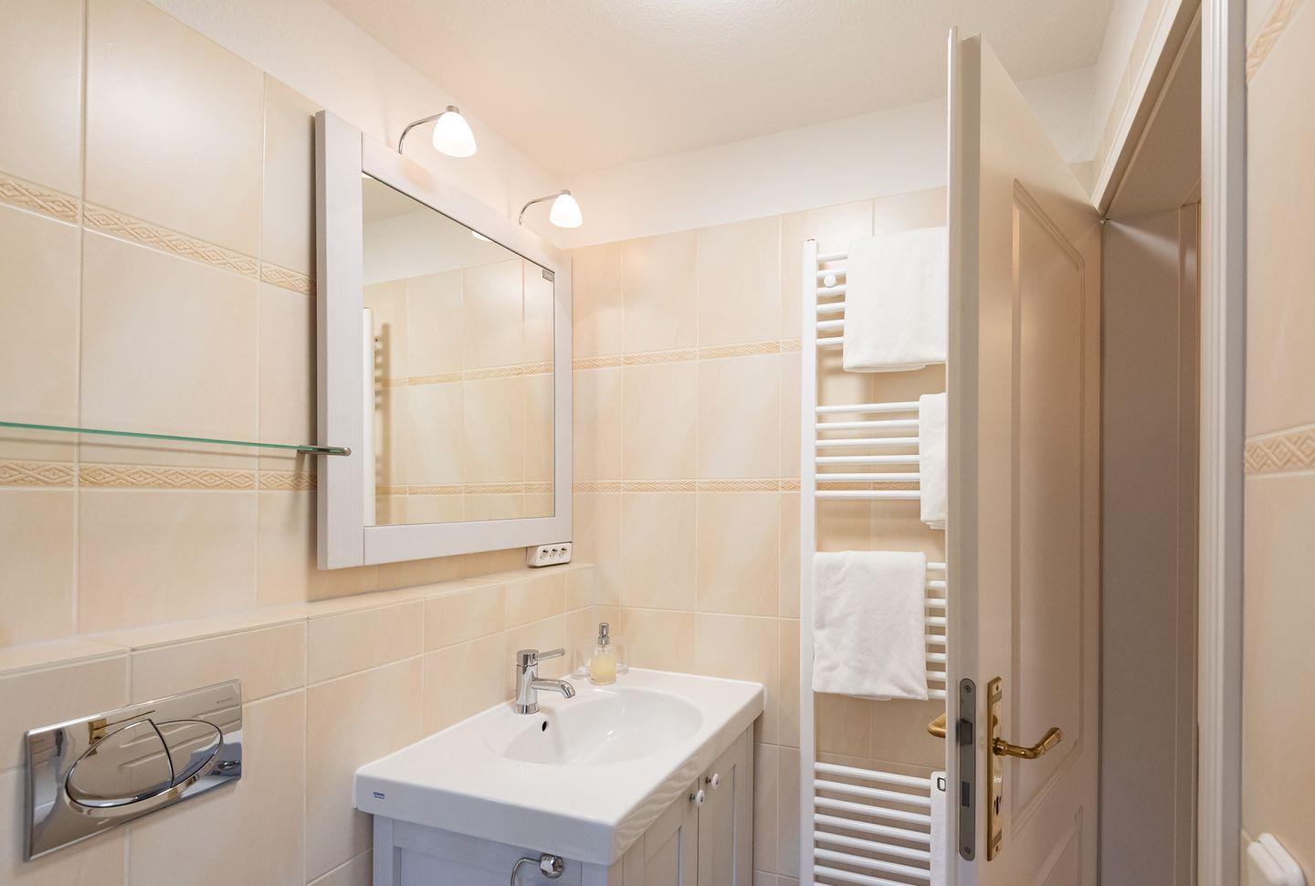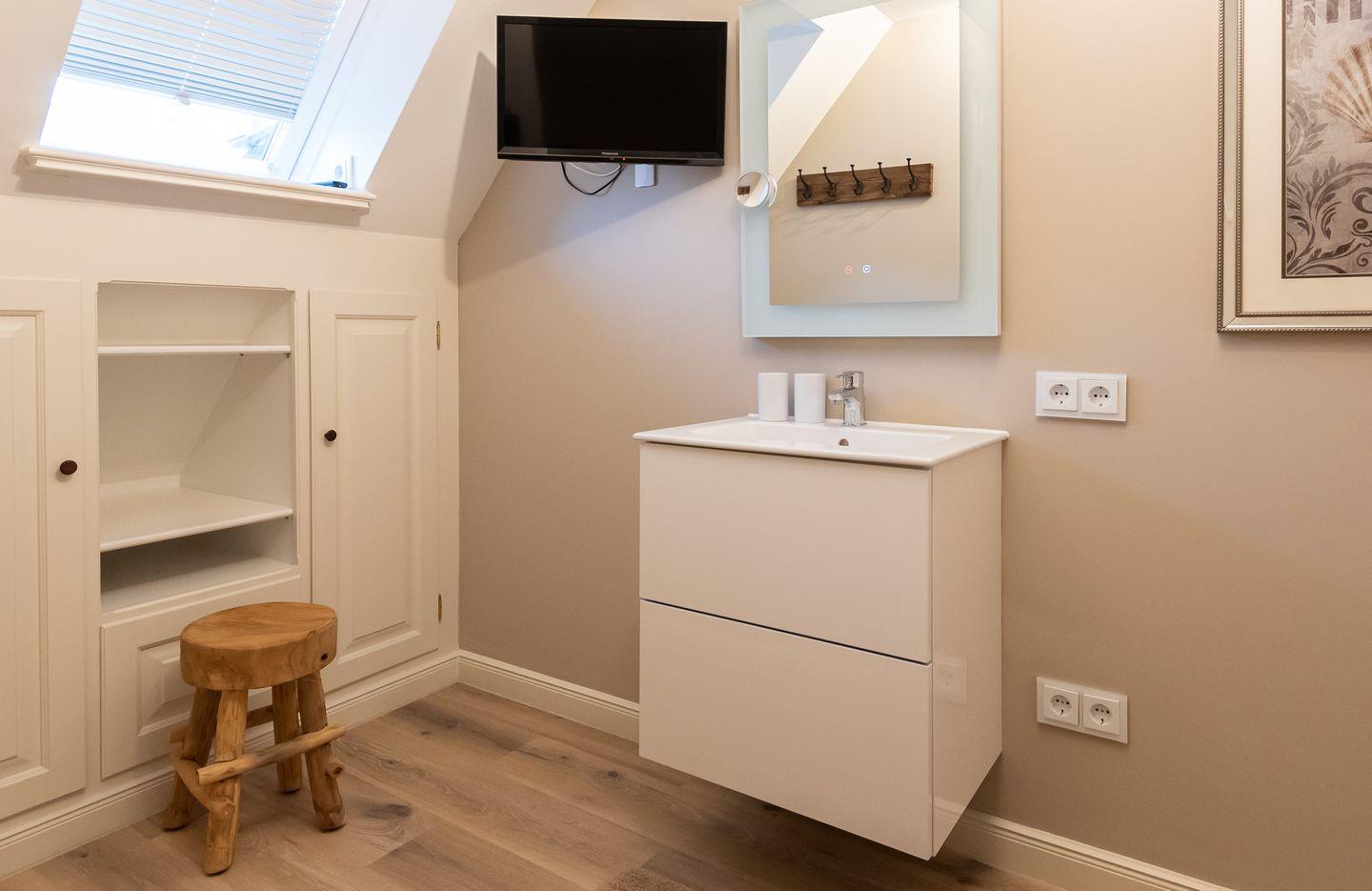 Schlafzimmer 2: Gemütliches Doppelbett, Einbauschränke, TV und sep. Waschbecken mit Spiegel.