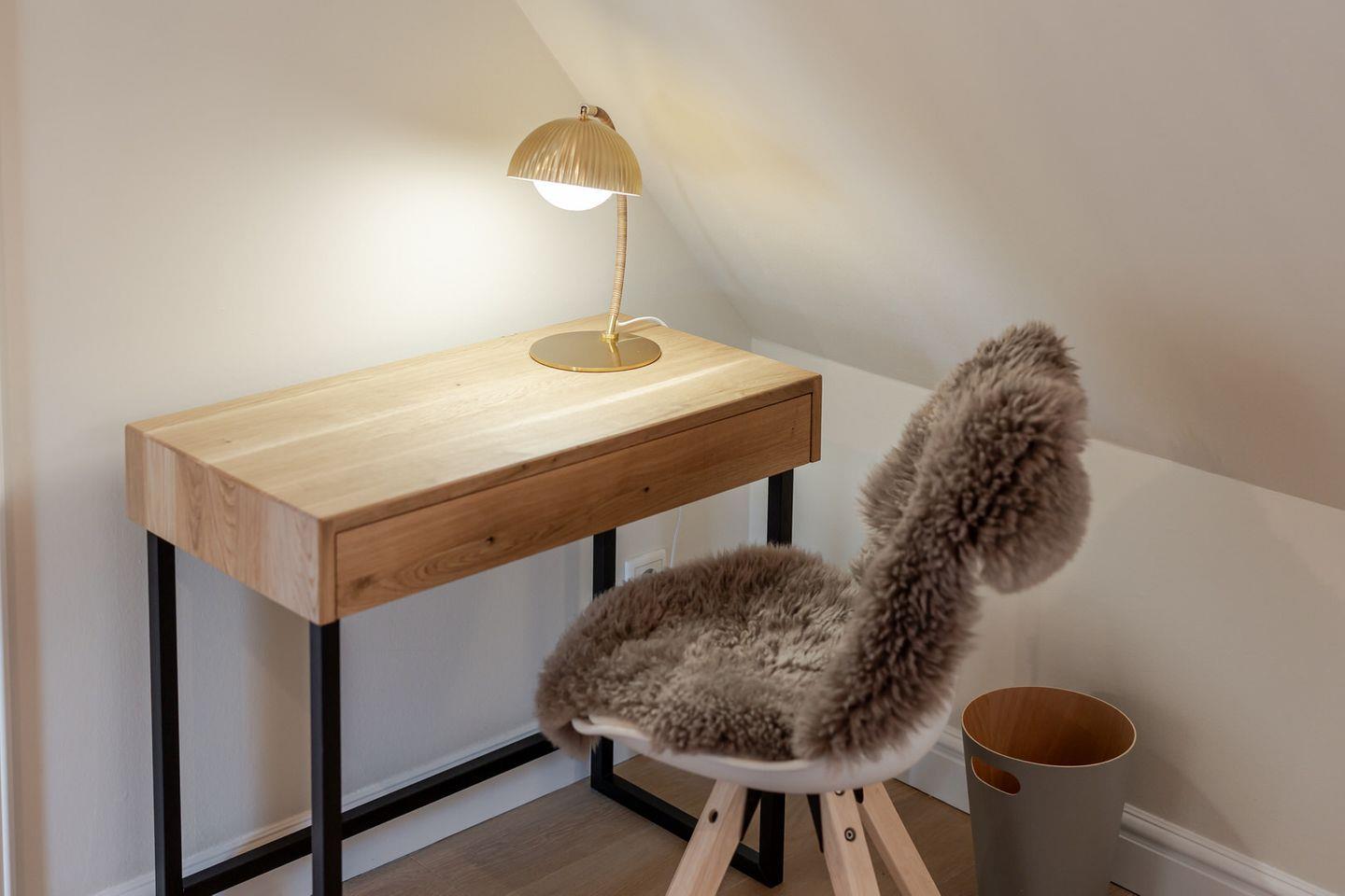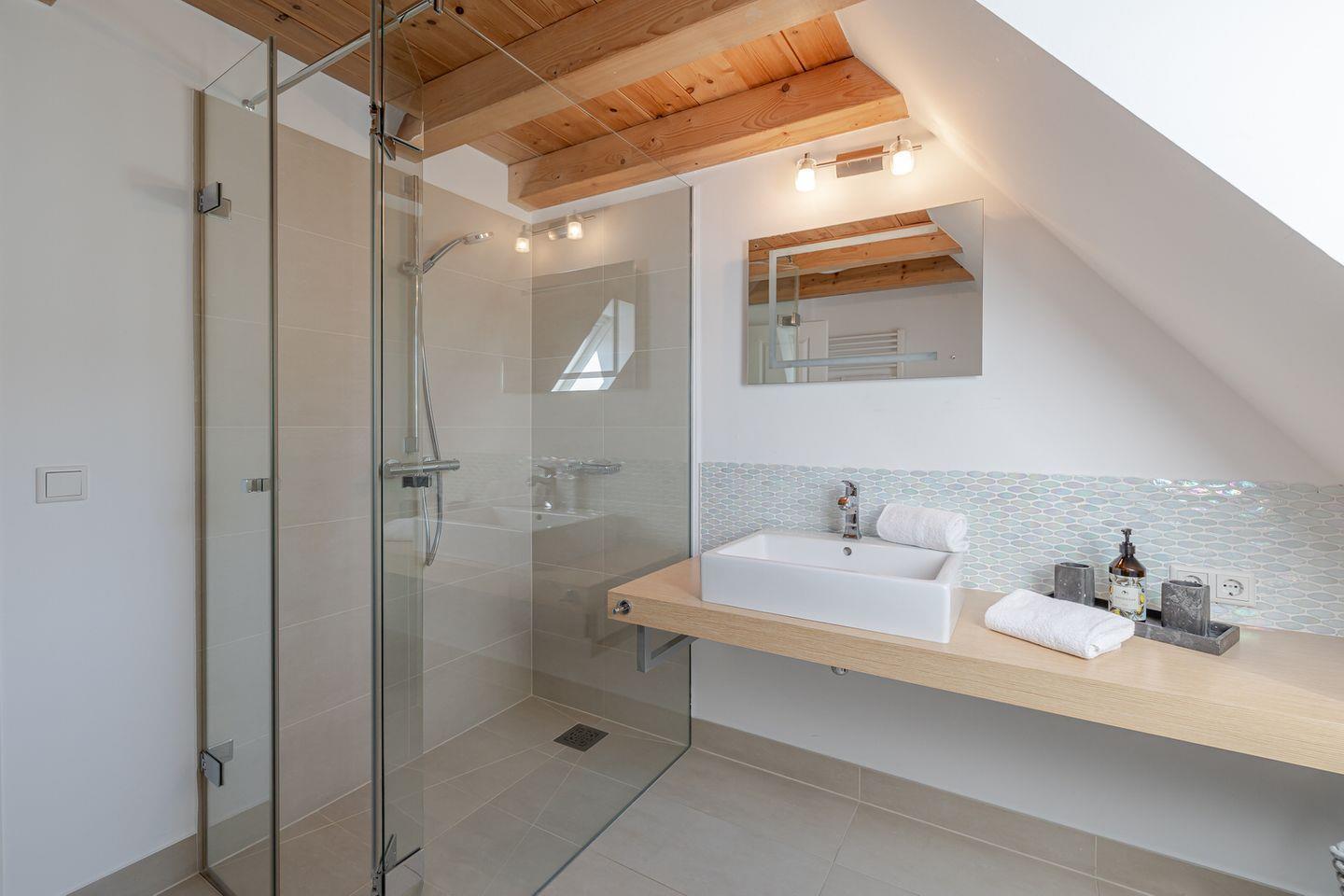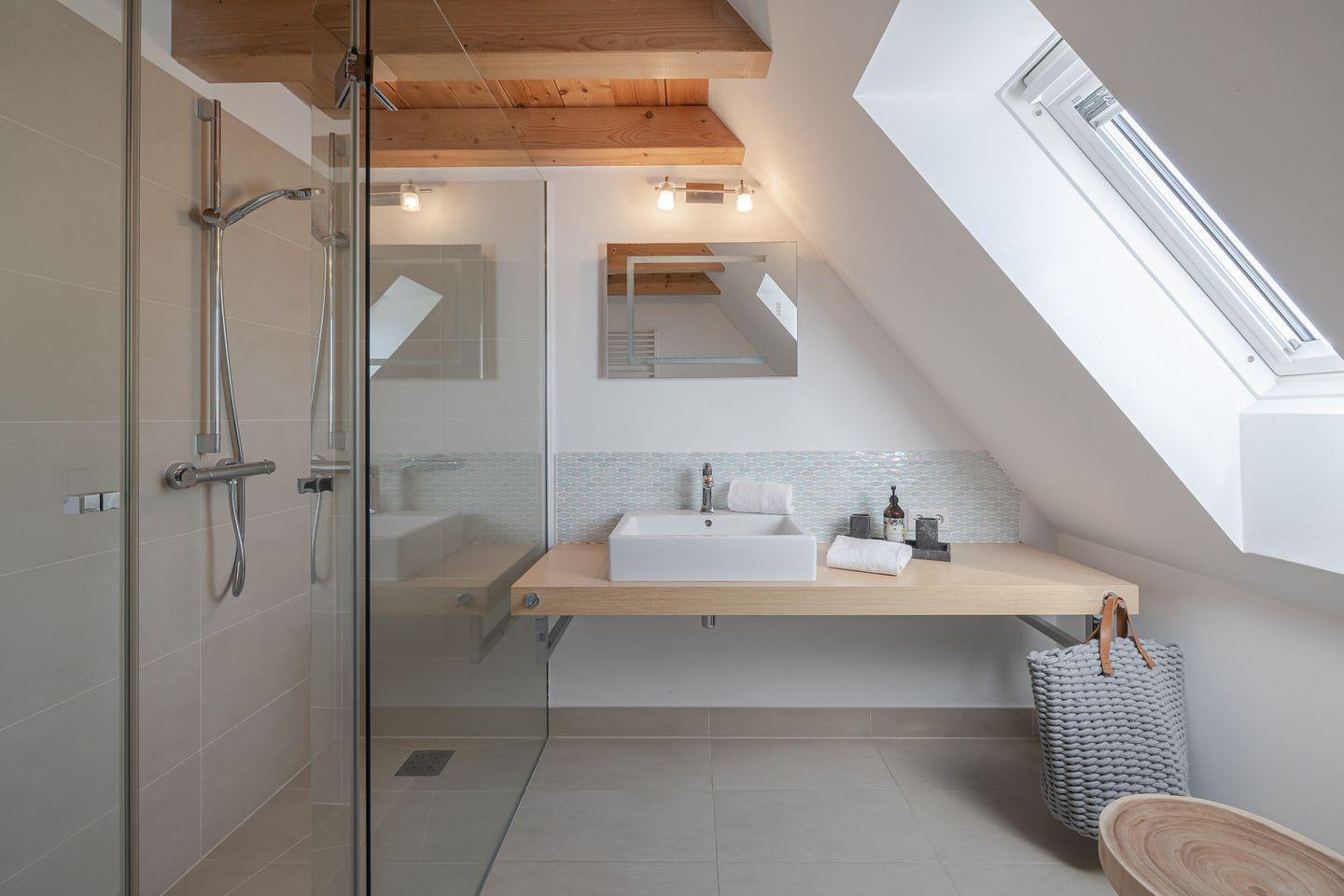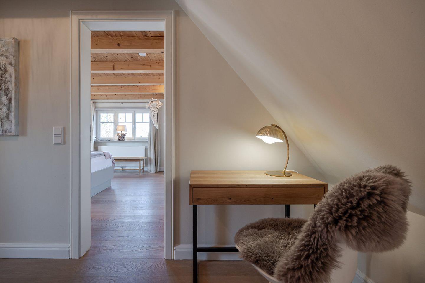 Im Obergeschoss befindet sich ein großes Schlafzimmer mit einem kleinen Balkon, auf dem Sie den Abend ausklingen lassen können. Sie nächtigen im komfortablen Boxspringbett und finden großzügigen Stauraum in massiven Einbauten vor. Das Badezimmer verfügt über eine bodentiefe Dusche. Über eine Treppe erreichen Sie ein weiteres kleines Schlafzimmer im Spitzboden. Hier befinden sich zwei bodennahe Einzelbetten, sodass sich das Domizil auch sehr gut für den Urlaub mit Kindern eignet. Hier ist behagliches Einschlafen mit Blick durch ein großes Bullaugenfenster garantiert.