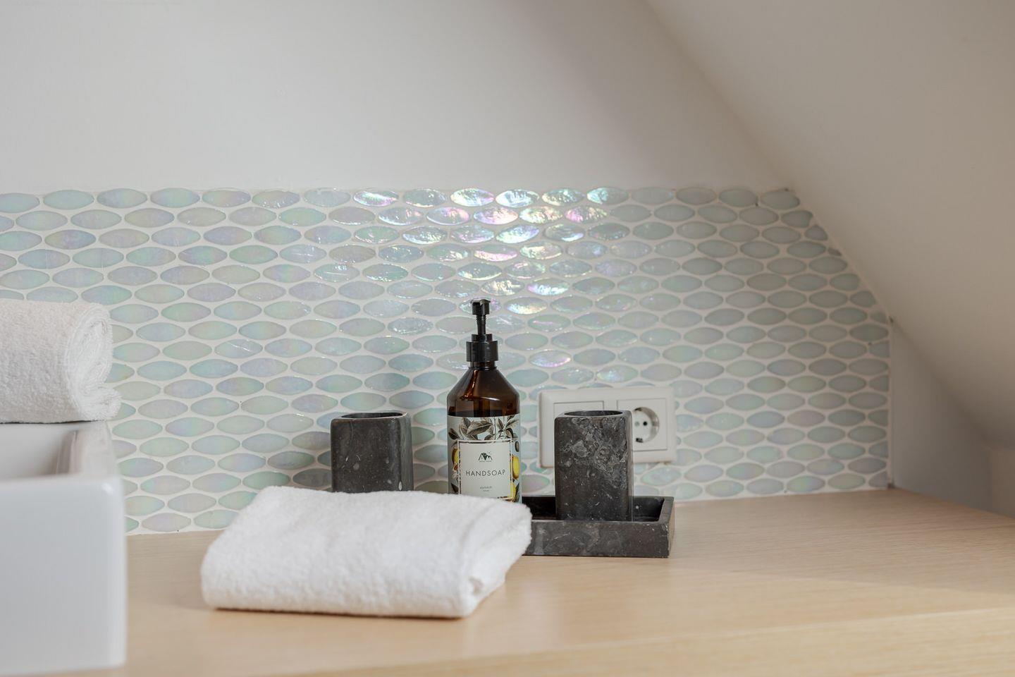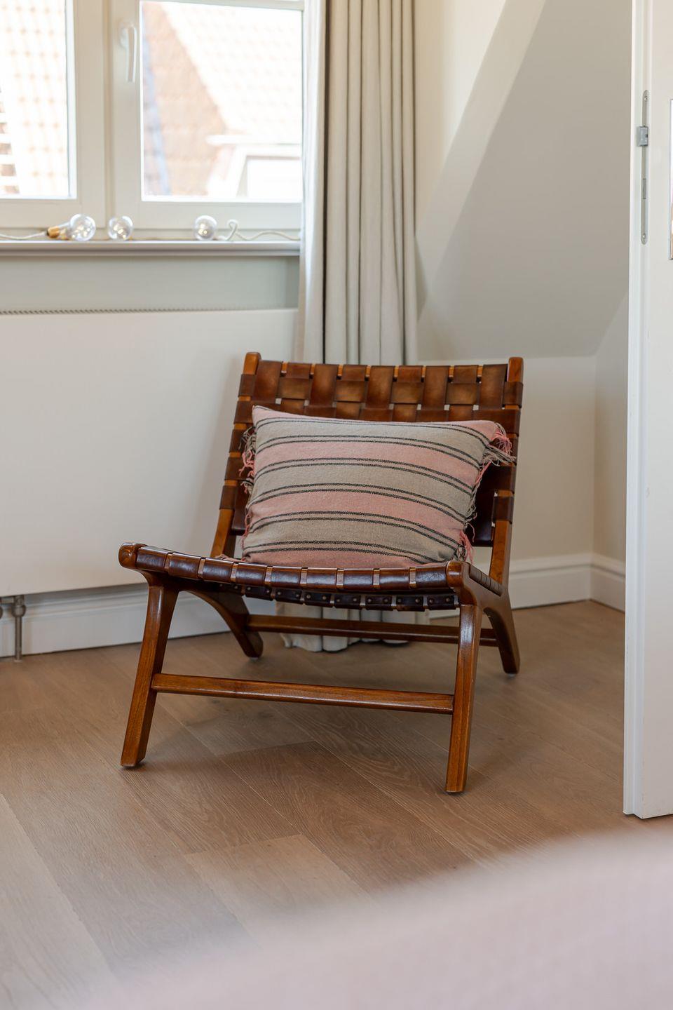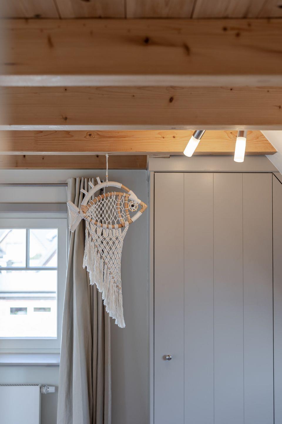 Im Obergeschoss befindet sich ein großes Schlafzimmer mit einem kleinen Balkon, auf dem Sie den Abend ausklingen lassen können. Sie nächtigen im komfortablen Boxspringbett und finden großzügigen Stauraum in massiven Einbauten vor. Das Badezimmer verfügt über eine bodentiefe Dusche. Über eine Treppe erreichen Sie ein weiteres kleines Schlafzimmer im Spitzboden. Hier befinden sich zwei bodennahe Einzelbetten, sodass sich das Domizil auch sehr gut für den Urlaub mit Kindern eignet. Hier ist behagliches Einschlafen mit Blick durch ein großes Bullaugenfenster garantiert.