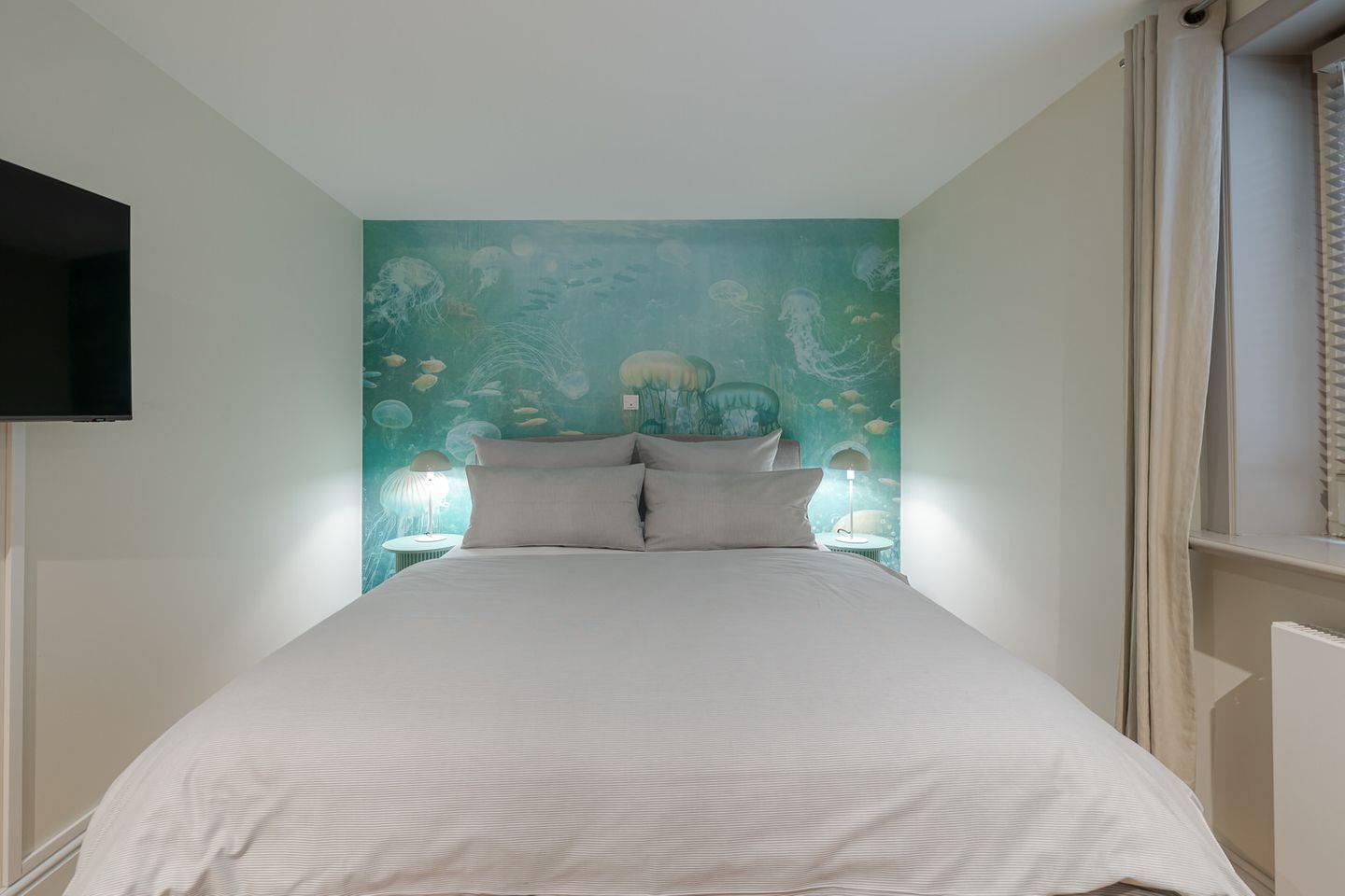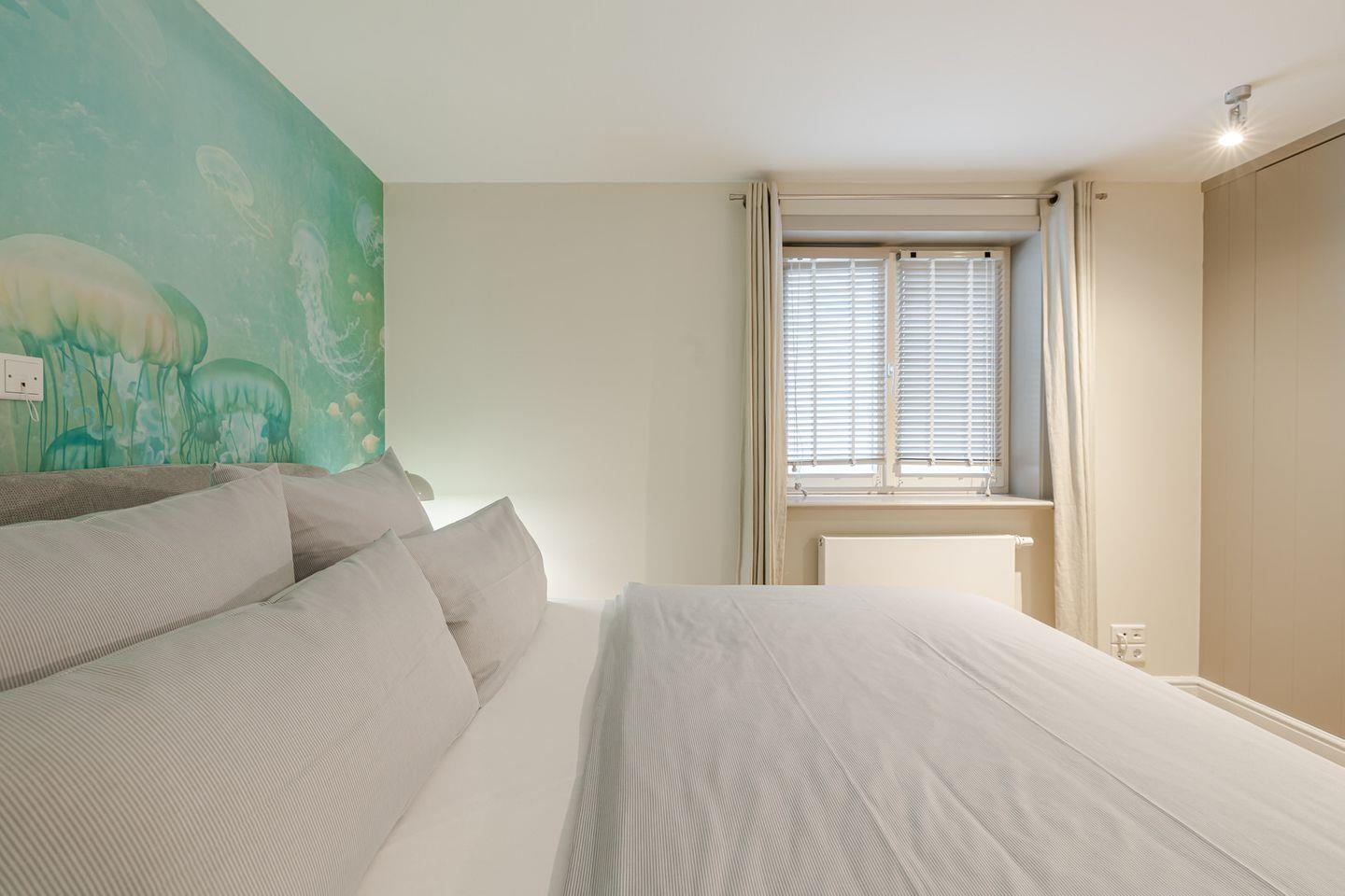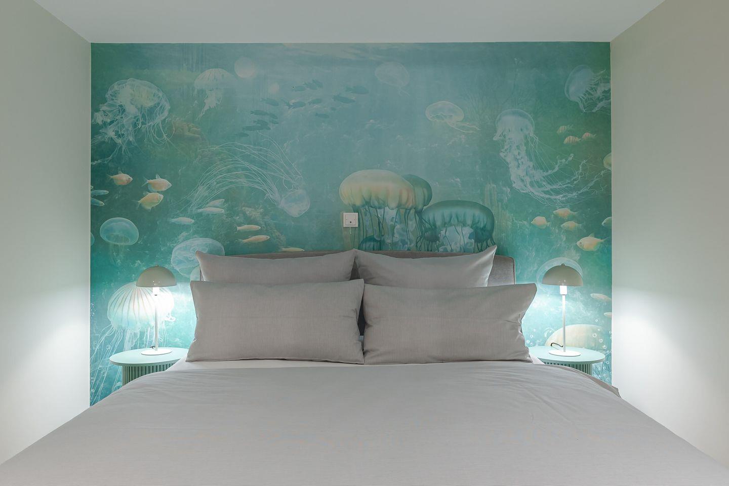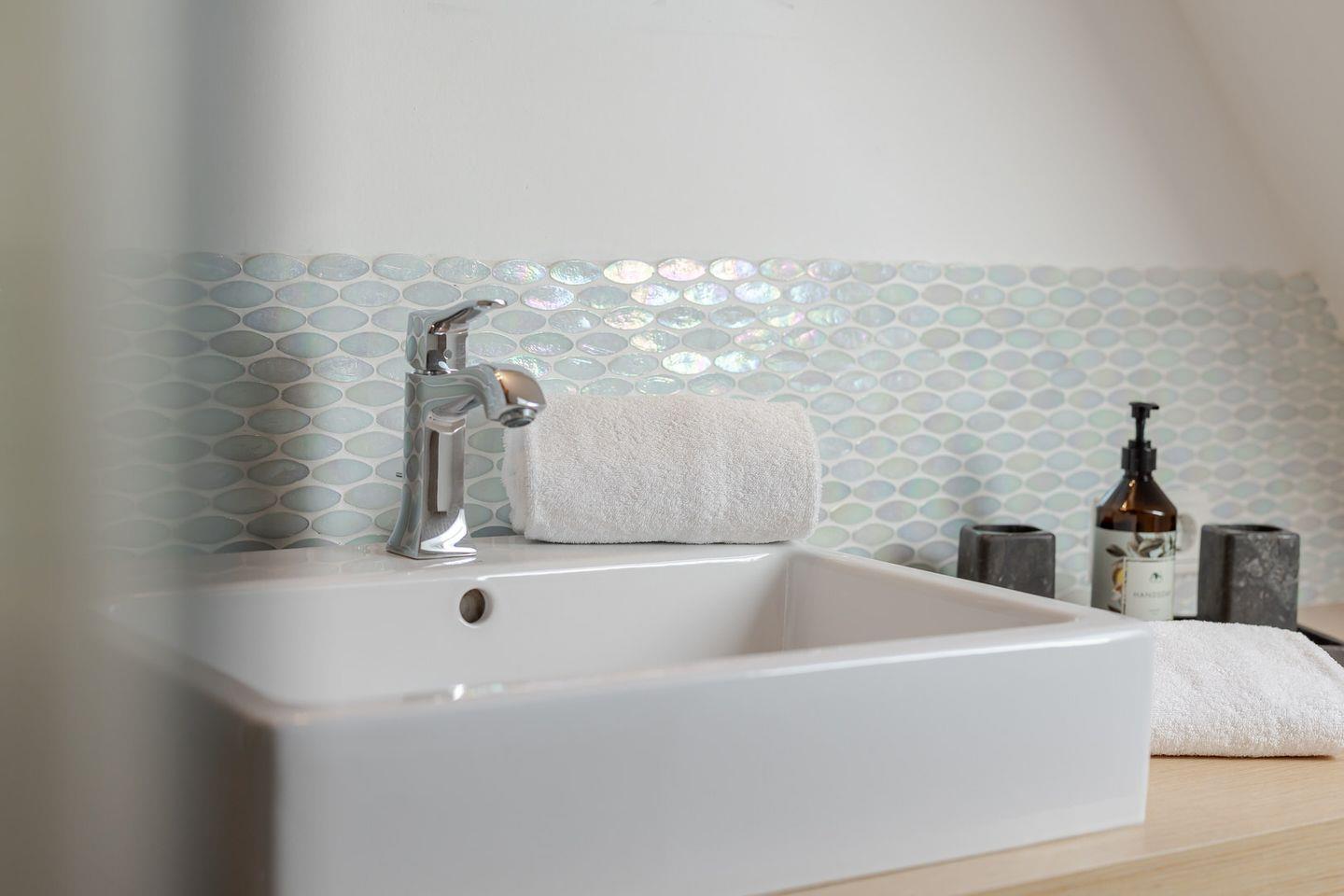 Im Obergeschoss befindet sich ein großes Schlafzimmer mit einem kleinen Balkon, auf dem Sie den Abend ausklingen lassen können. Sie nächtigen im komfortablen Boxspringbett und finden großzügigen Stauraum in massiven Einbauten vor. Das Badezimmer verfügt über eine bodentiefe Dusche. Über eine Treppe erreichen Sie ein weiteres kleines Schlafzimmer im Spitzboden. Hier befinden sich zwei bodennahe Einzelbetten, sodass sich das Domizil auch sehr gut für den Urlaub mit Kindern eignet. Hier ist behagliches Einschlafen mit Blick durch ein großes Bullaugenfenster garantiert.