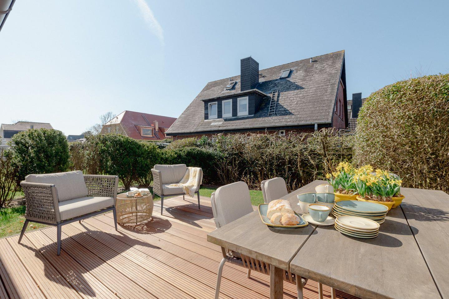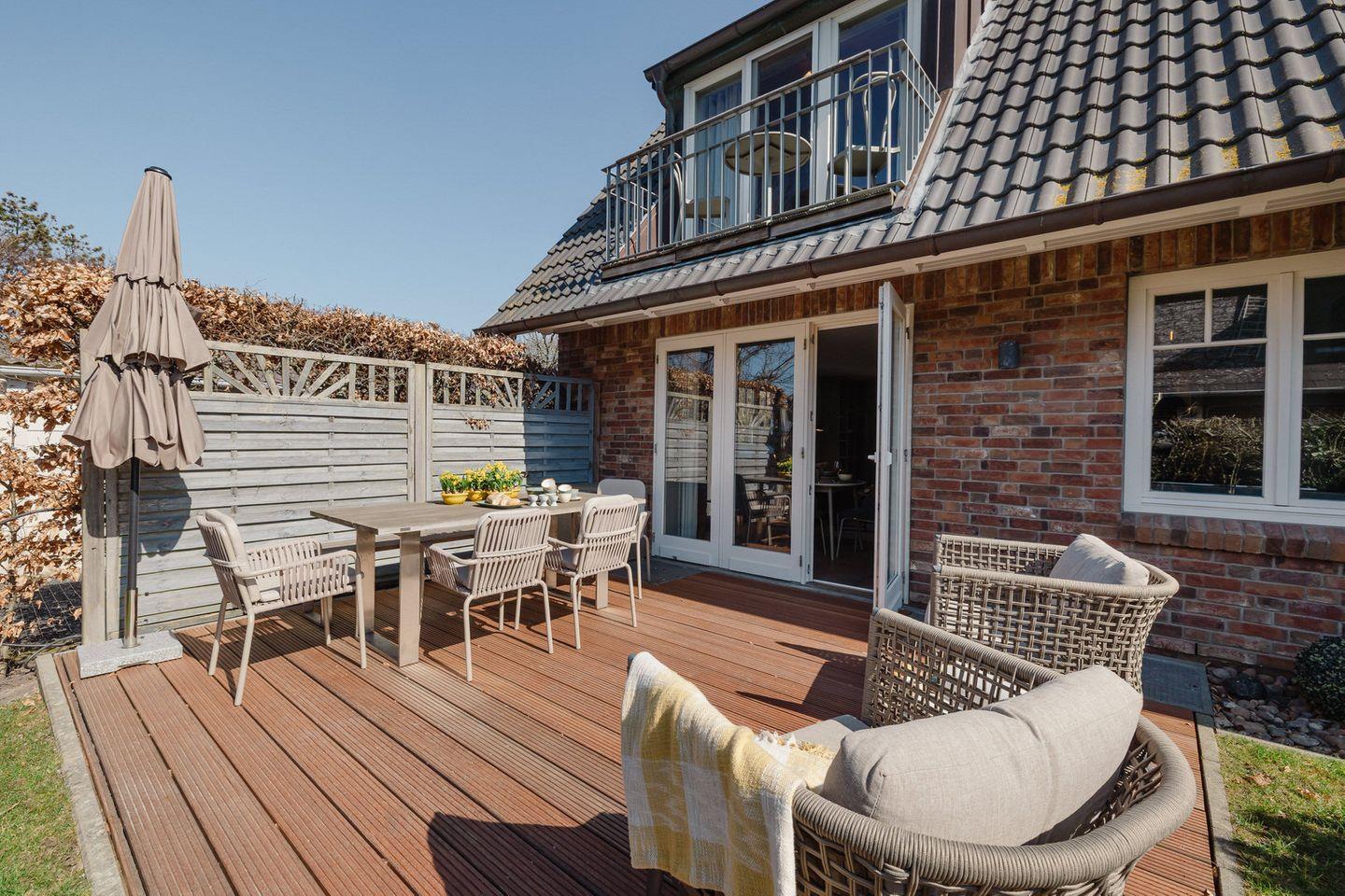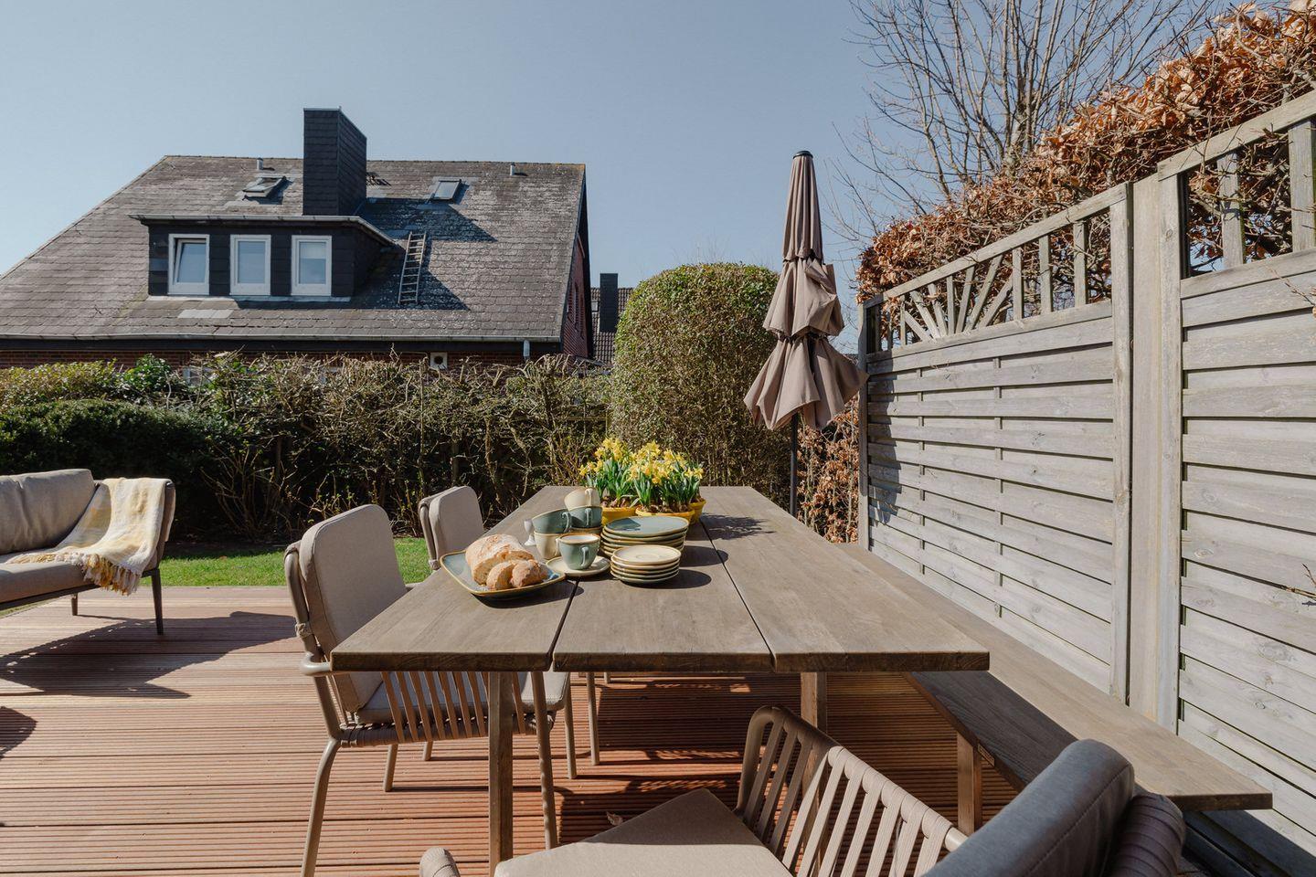 Vom Wohnbereich gelangen Sie auf Ihre blickgeschützte Holzterrasse, die nach Süd / Westen ausgerichtet und mit elegantem Gartenmobiliar ausgestattet ist. Hier wird es Ihnen leicht gemacht, den Alltag getrost hinter sich zu lassen und den ganzen Tag die Sonne zu genießen.