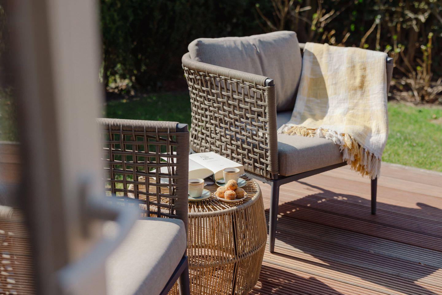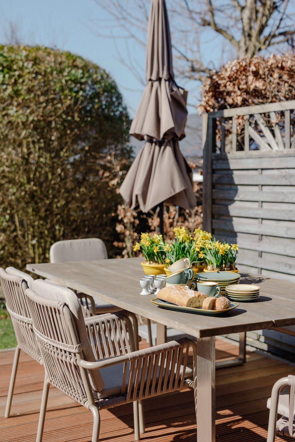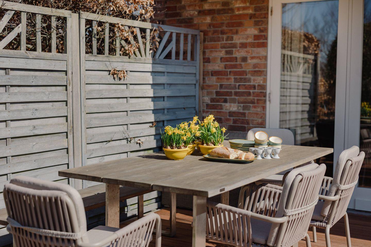 Vom Wohnbereich gelangen Sie auf Ihre blickgeschützte Holzterrasse, die nach Süd / Westen ausgerichtet und mit elegantem Gartenmobiliar ausgestattet ist. Hier wird es Ihnen leicht gemacht, den Alltag getrost hinter sich zu lassen und den ganzen Tag die Sonne zu genießen.
