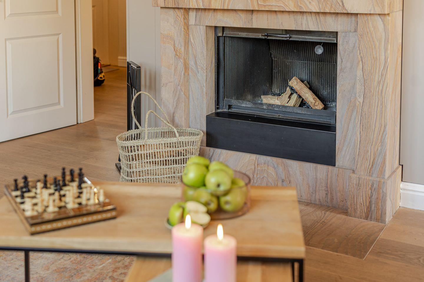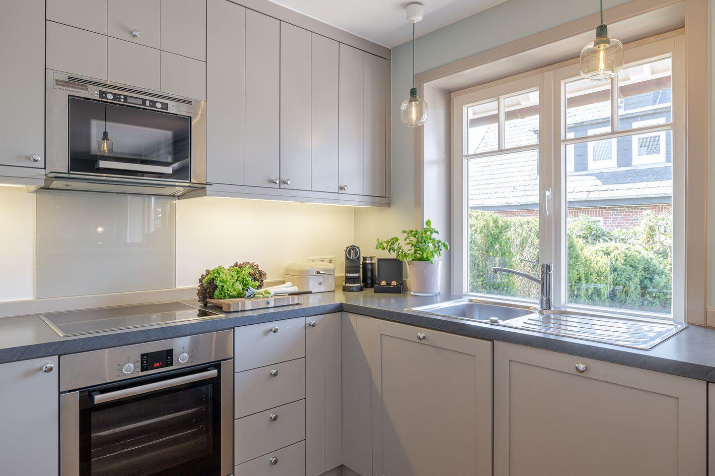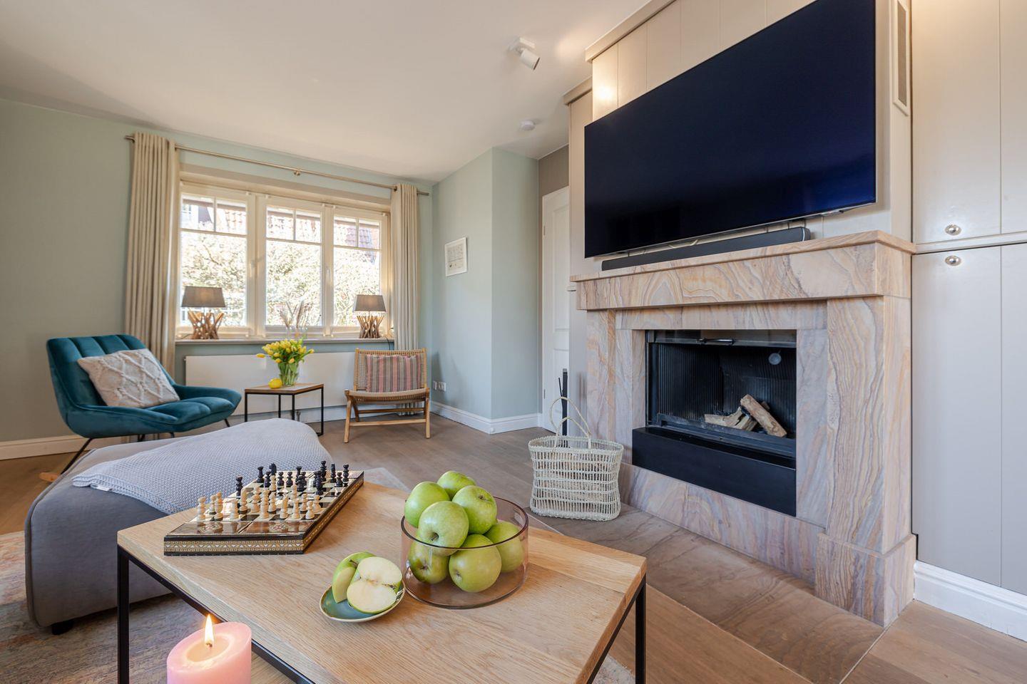 Das Herzstück der großzügigen Haushälfte bildet der geschmackvolle Wohn / und Essbereich, in dem Sie sich an kalten Tagen gemütlich vor Ihrem stilvollen Kamin entspannen können. Die offene Küche wurde optisch vom Wohnbereich abgegrenzt und bietet damit die Möglichkeit, in Ruhe eigene Mahlzeiten zuzubereiten und dennoch eine gesellige Atmosphäre zu gestalten. In der hochwertigen Küche finden Sie, neben einer Nespresso- Maschine, alles vor, was das Herz begehrt.