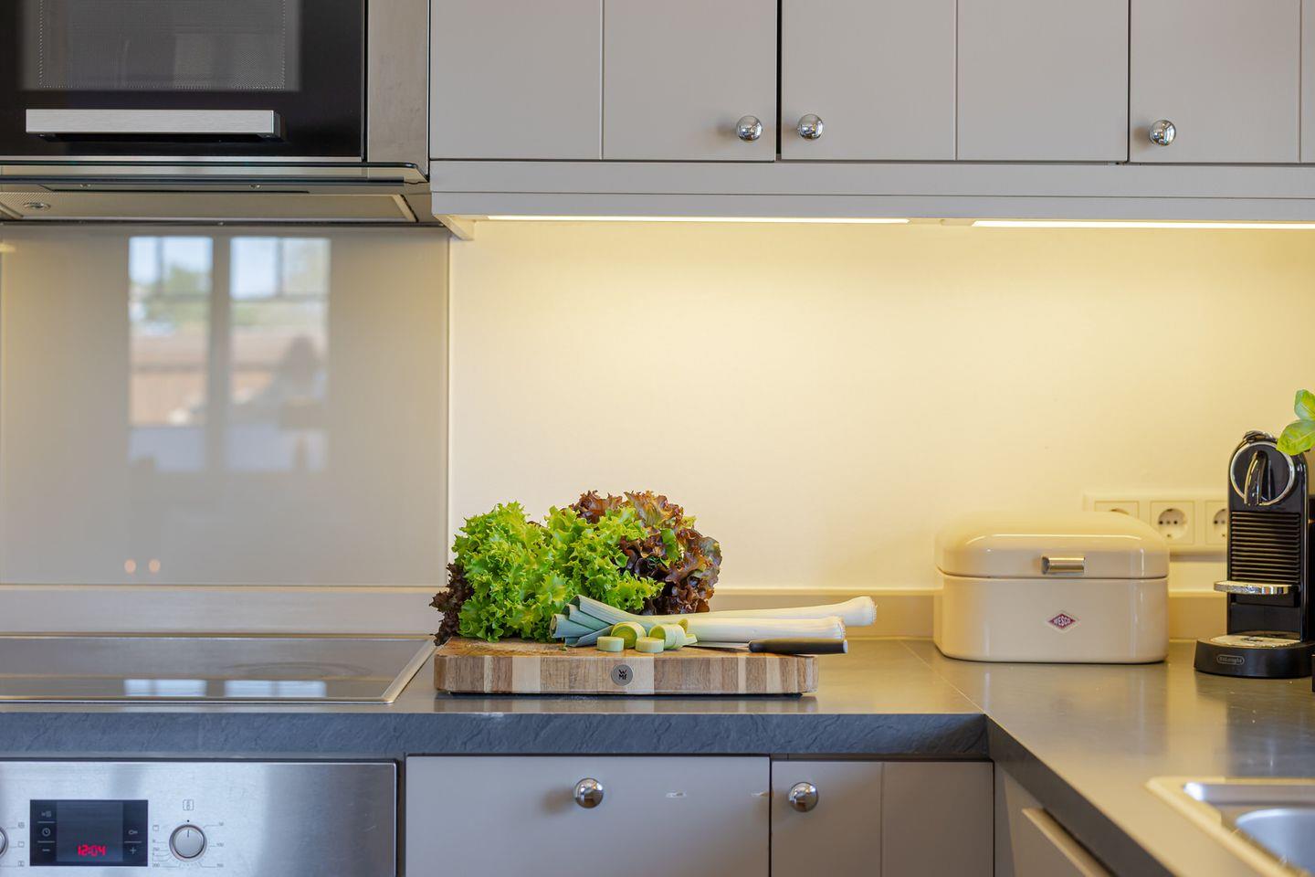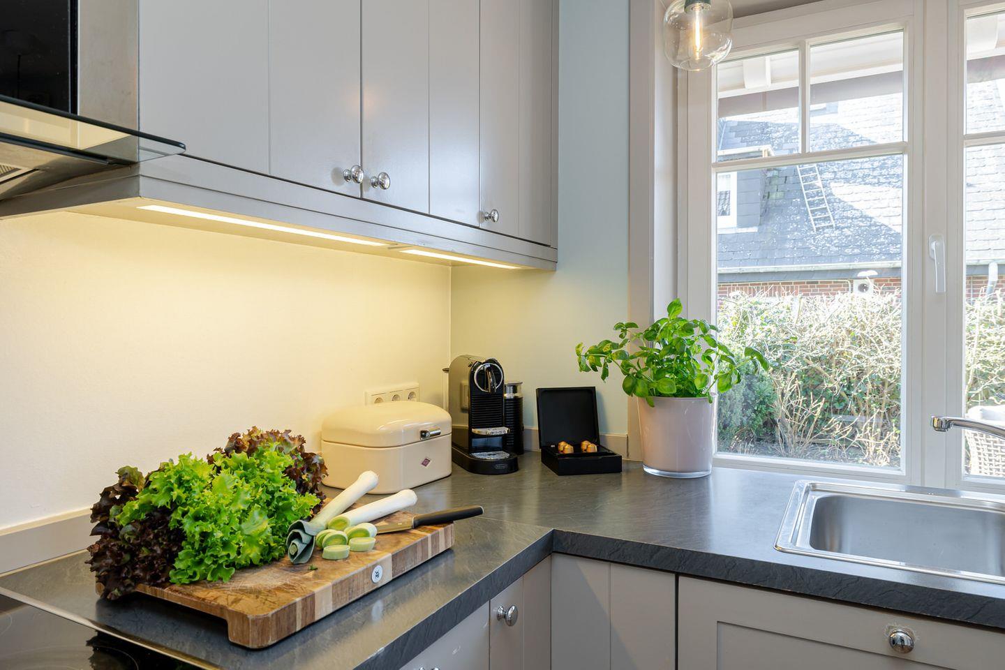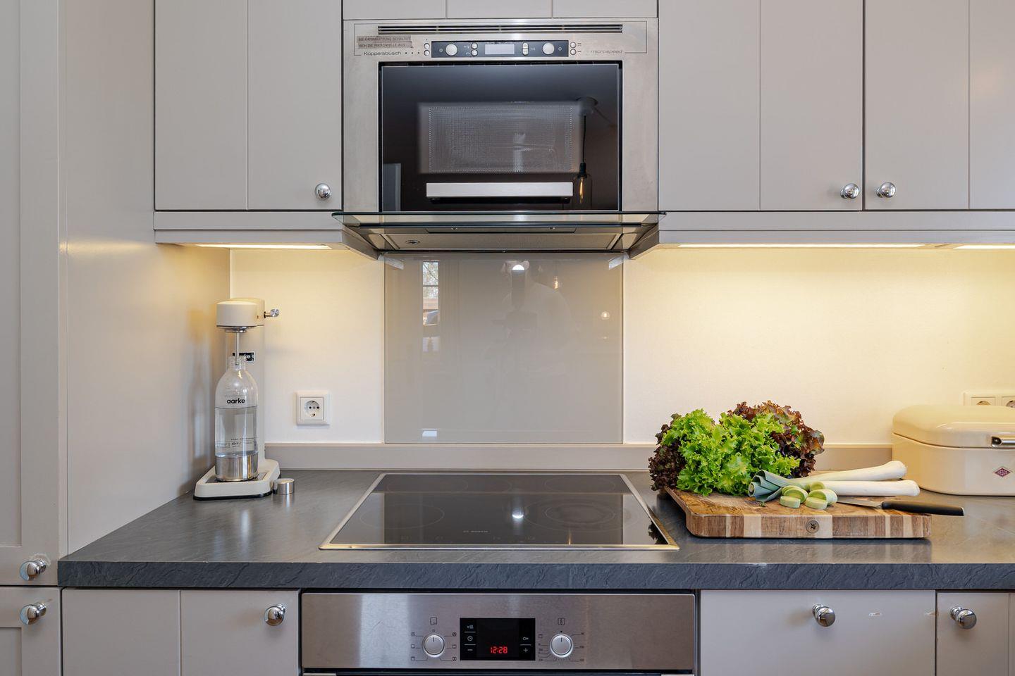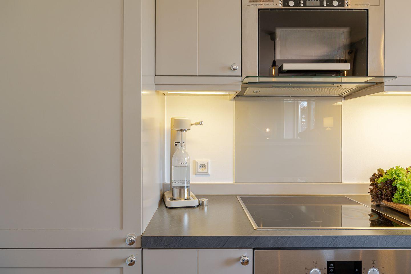 Das Herzstück der großzügigen Haushälfte bildet der geschmackvolle Wohn / und Essbereich, in dem Sie sich an kalten Tagen gemütlich vor Ihrem stilvollen Kamin entspannen können. Die offene Küche wurde optisch vom Wohnbereich abgegrenzt und bietet damit die Möglichkeit, in Ruhe eigene Mahlzeiten zuzubereiten und dennoch eine gesellige Atmosphäre zu gestalten. In der hochwertigen Küche finden Sie, neben einer Nespresso- Maschine, alles vor, was das Herz begehrt.