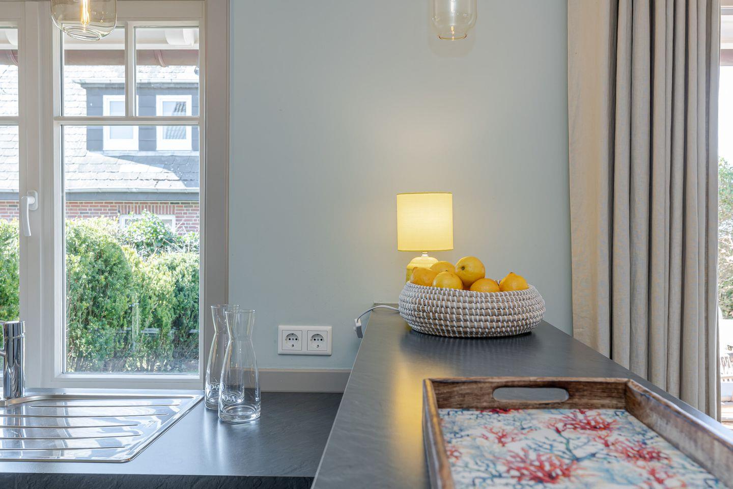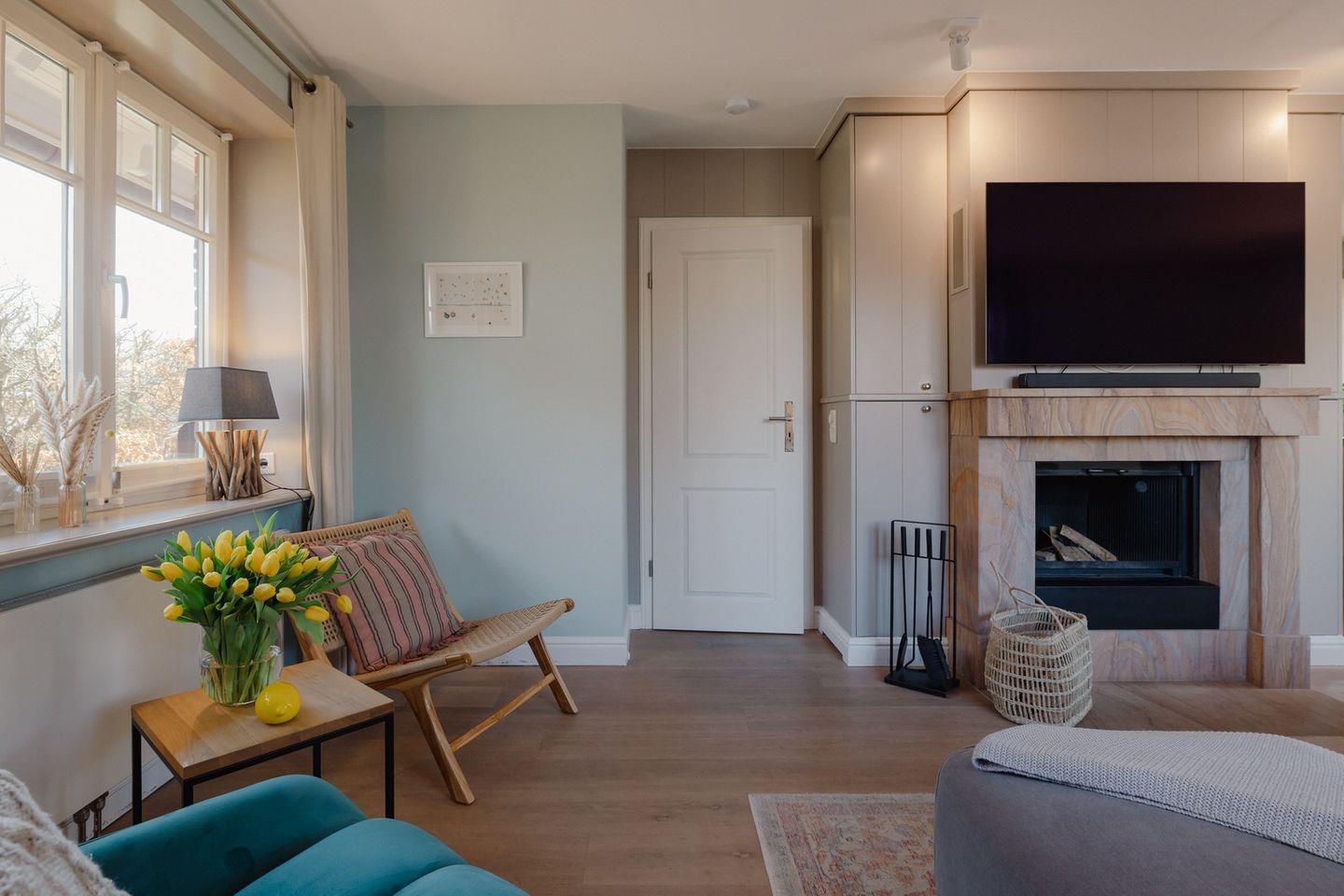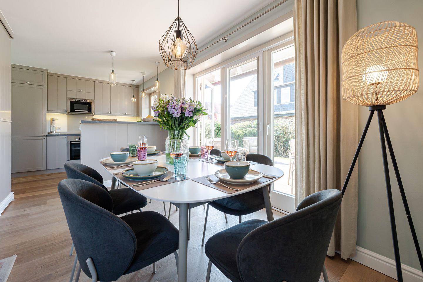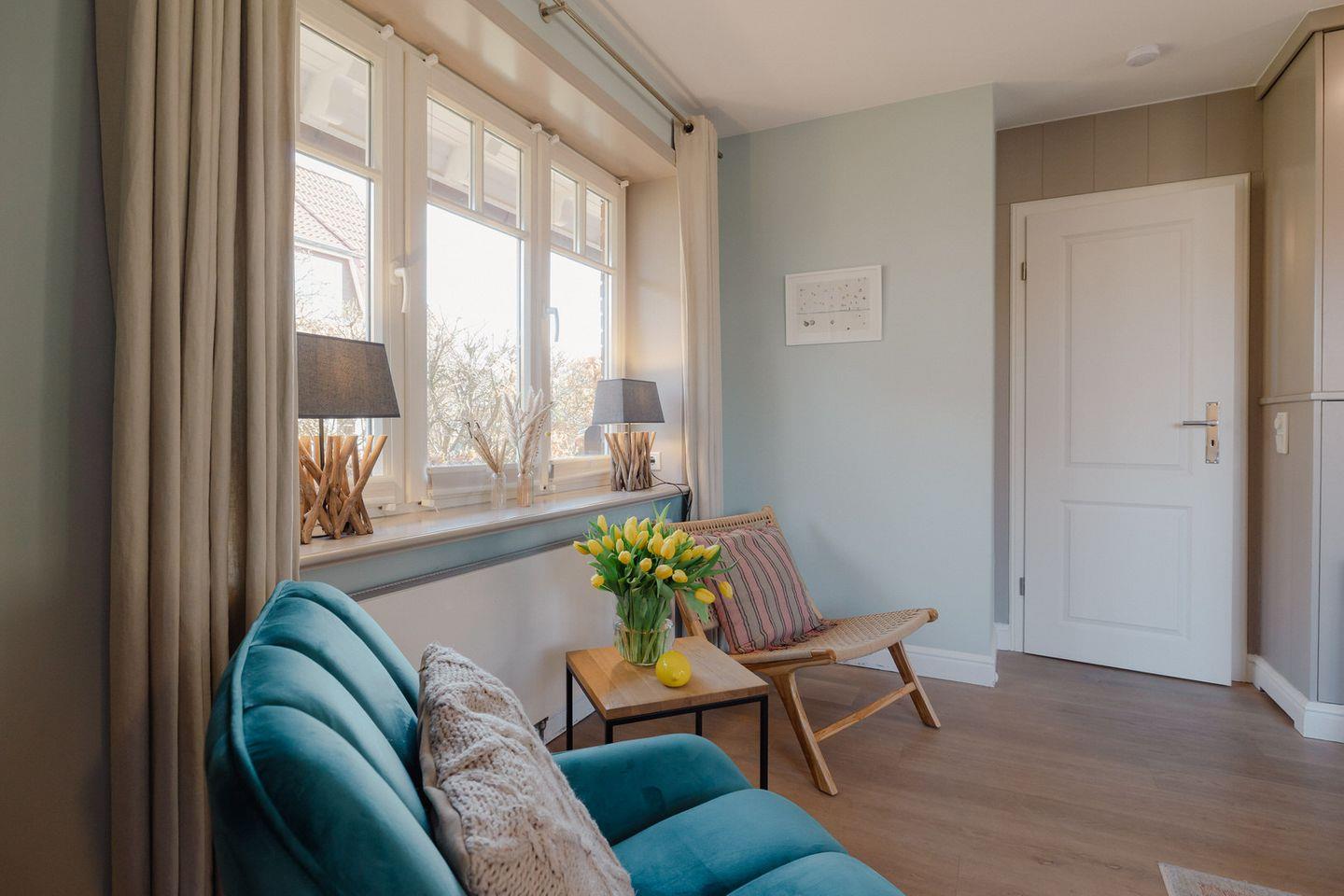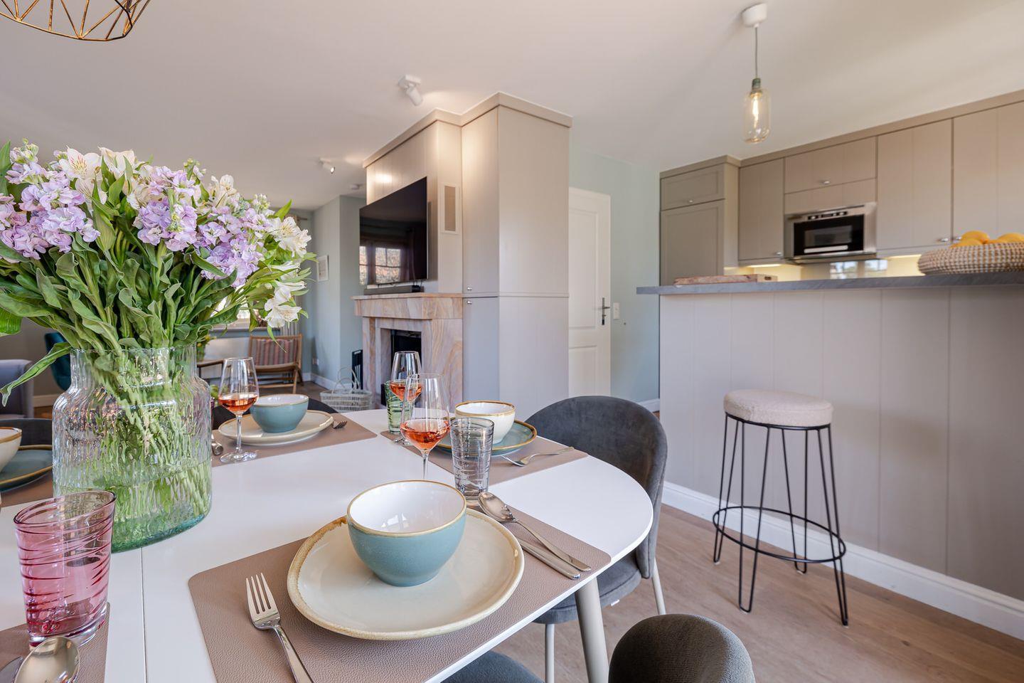 Unser „Hüs im Glück“ besticht durch seine maritime Atmosphäre, die durch eine sehr gelungene Kombination aus dezenten Farbtönen und gekonnt in Szene gesetzten Accessoires in bester Weise hervorgehoben wird. Die angenehme Behaglichkeit des Hauses wird durch den Dielenboden, elegante Einbauten und freiliegende Deckenbalken zusätzlich betont.