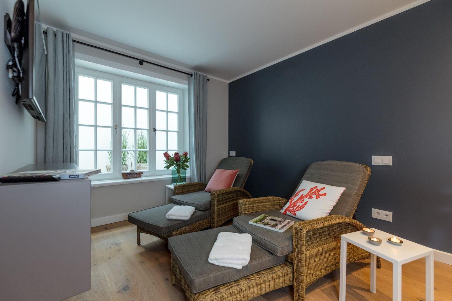 Doppelhaushälfte unter Reet für höchste Ansprüche! Dieses Luxus-Domizil überzeugt durch eine großzügige Raumaufteilung und jede Menge Komfort. Natürliche Materialien wie z.B. edle Eichendielen und Natursteinfliesen verleihen dem Haus einen warmen und für Sylt authentischen Grundton. Hochwertige Tischlereinbauten, erlesende Stoffe und ein stylisches Inventar runden das Bild ab. Im Saunabad oder vor dem offenen Kamin können Sie herrlich entspannen. Im Ruheraum bieten 2 gemütliche Liegen die Möglichkeit zu relaxen oder auf dem benachbarten Rudergerät sportlich aktiv zu werden. Der liebevoll angelegte Süd-Garten und die große Sonnenterrasse eignen sich bestens für erholsame Stunden an der frischen Luft.