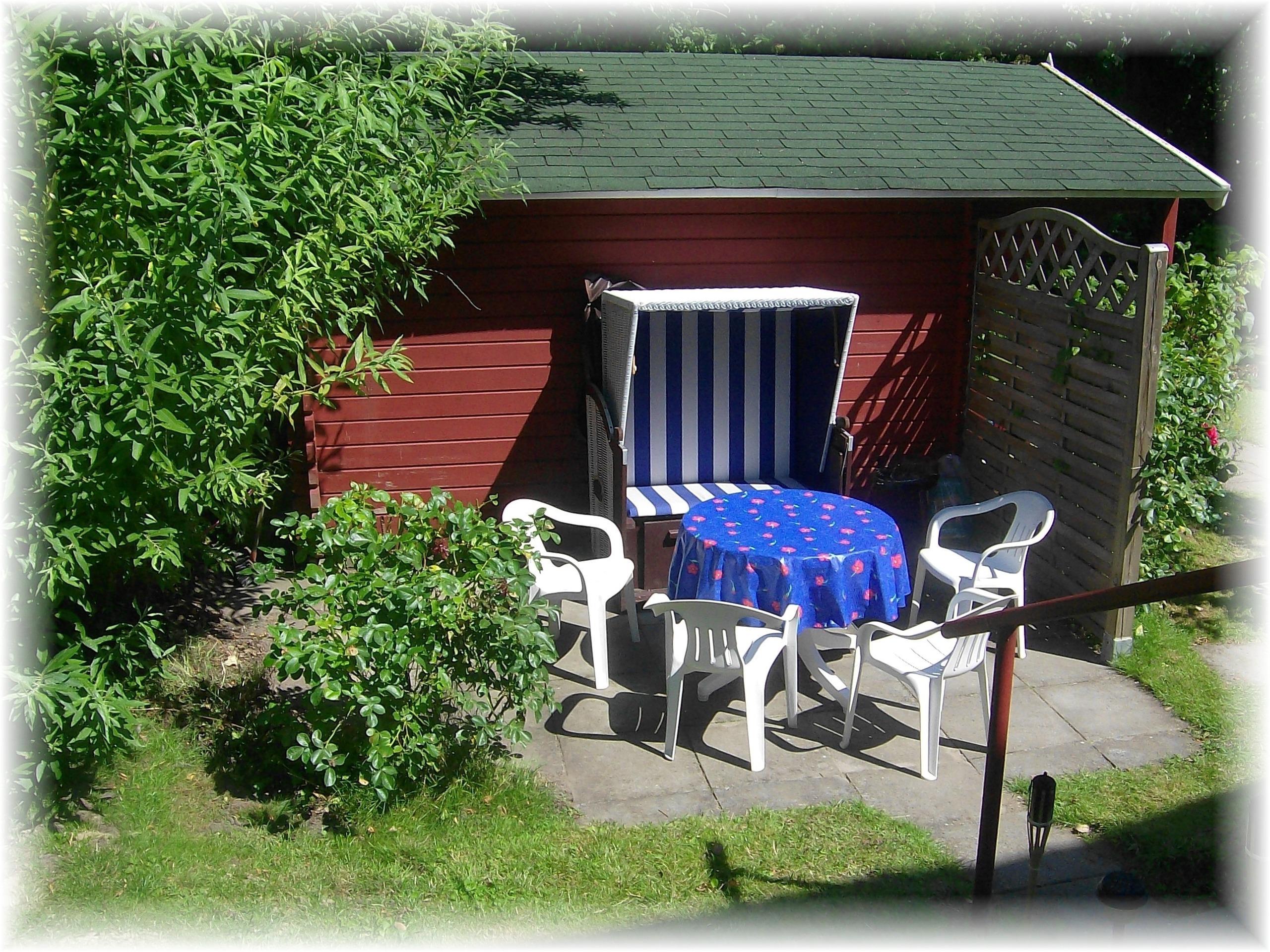 Im dem kleinen Garten befindet sich für unsere Gäste auch eine Terasse inklusive Strandkorb und Gartenmöbel.