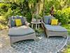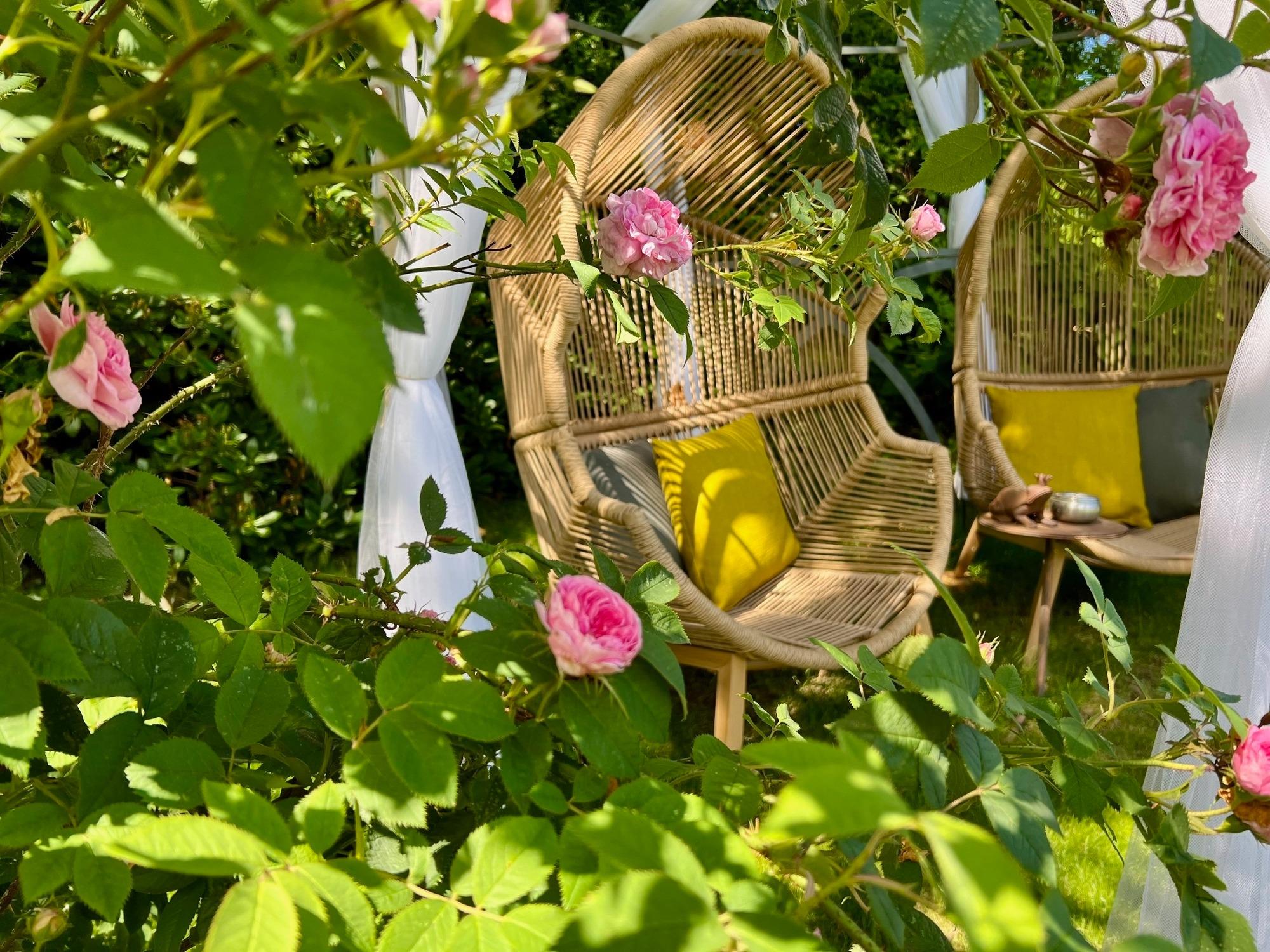 Gartenstühlen, Tisch und Strandkorb dürfen gern gemeinschaftlich genutzt werden.