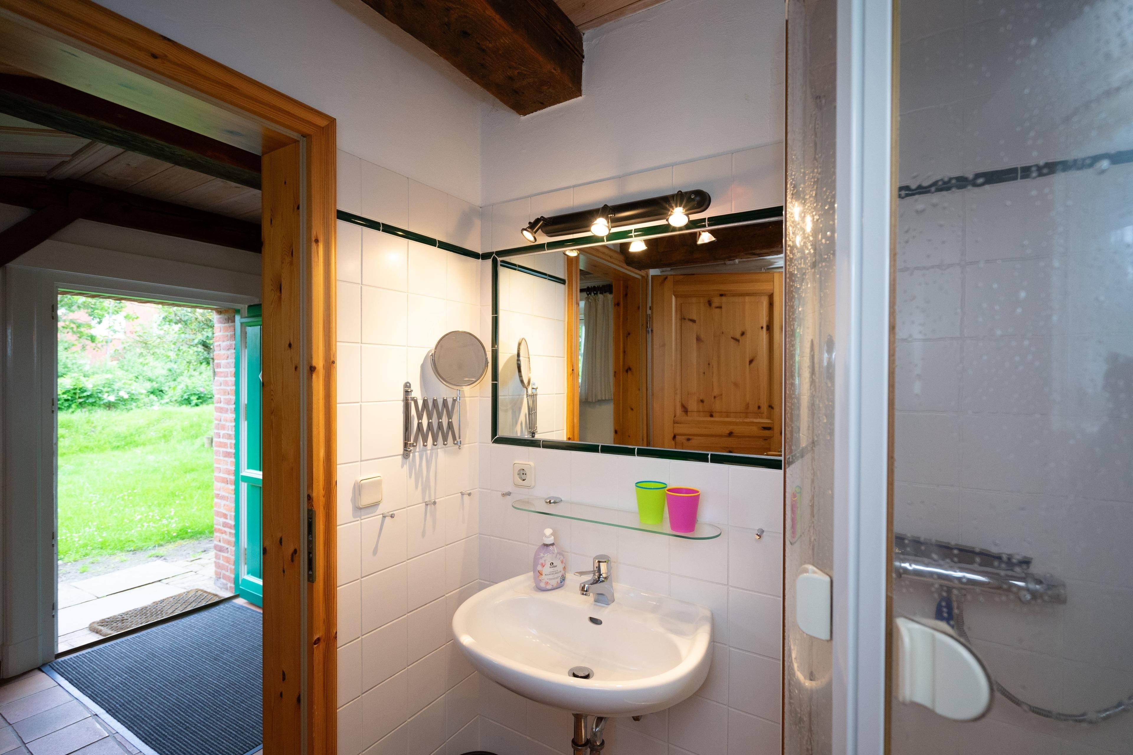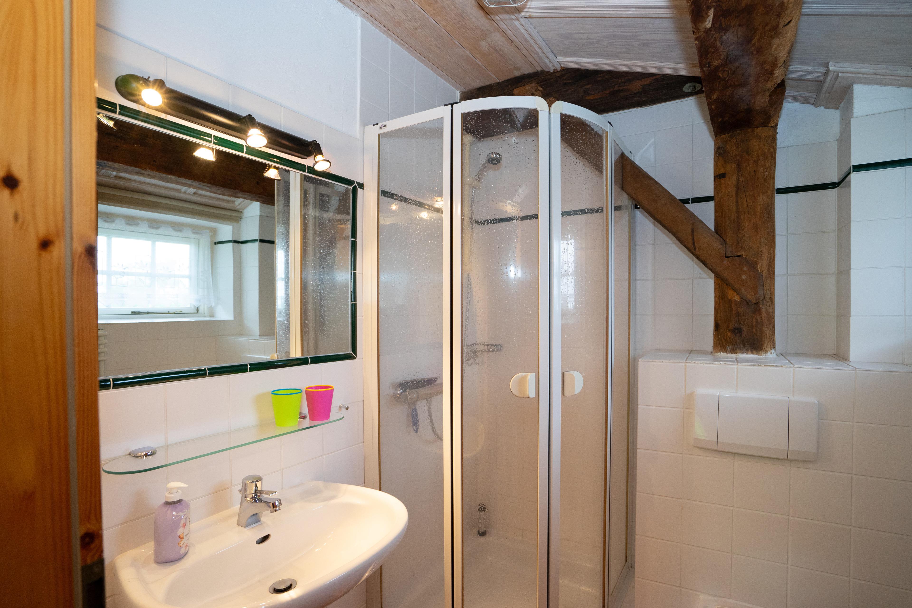 Im Erdgeschoss erwartet Sie ein behaglicher Wohnraum mit einer Küchenzeile, einem Duschbad mit WC und einem einladenden Eingangsbereich mit Garderobe.