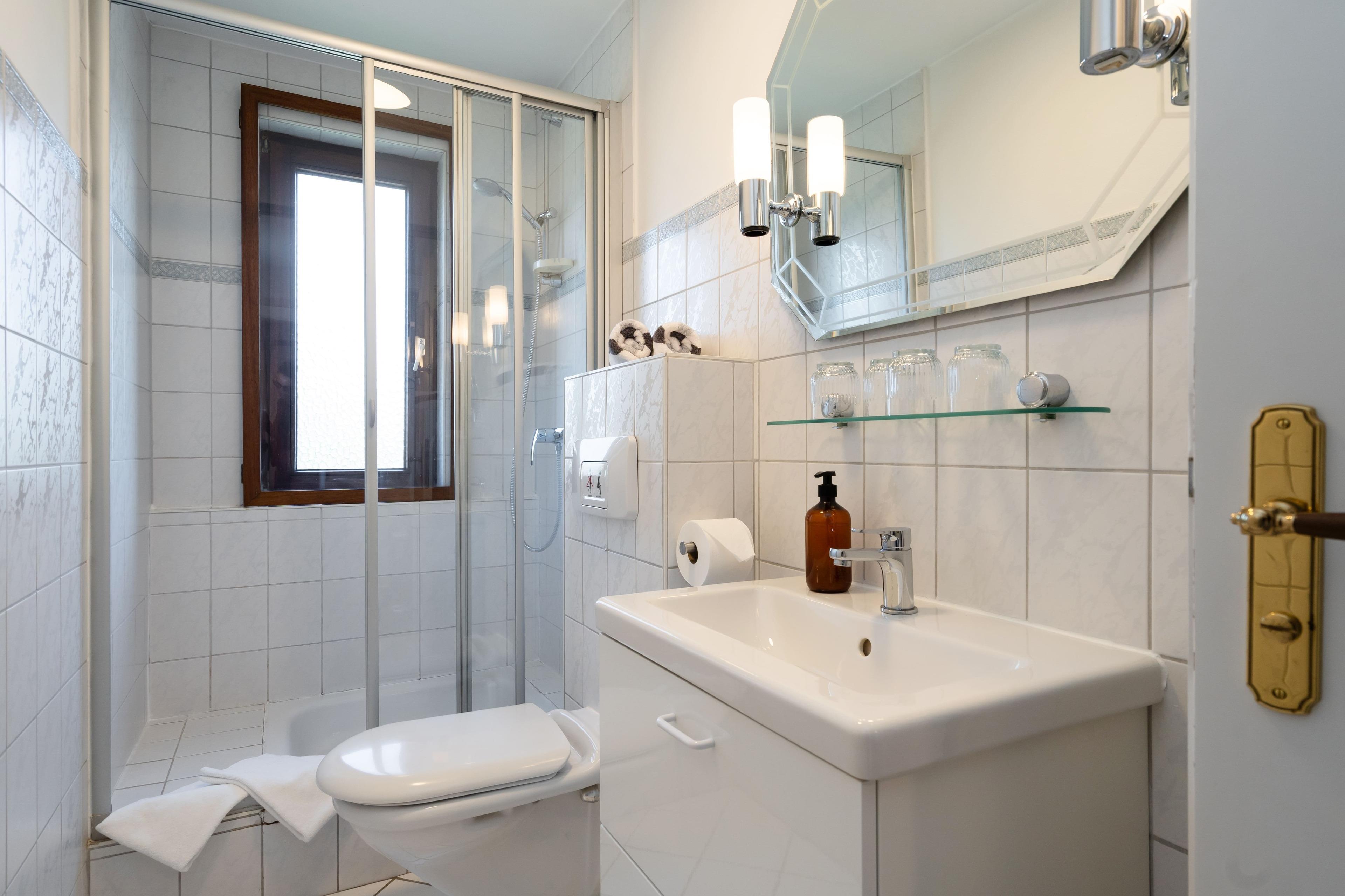 Das Badezimmer ist mit einer Dusche, einem Waschtisch und einem WC ausgestattet. Für zusätzlichen Komfort stehen im Keller eine Waschmaschine und ein Trockner zur gemeinschaftlichen Nutzung bereit.