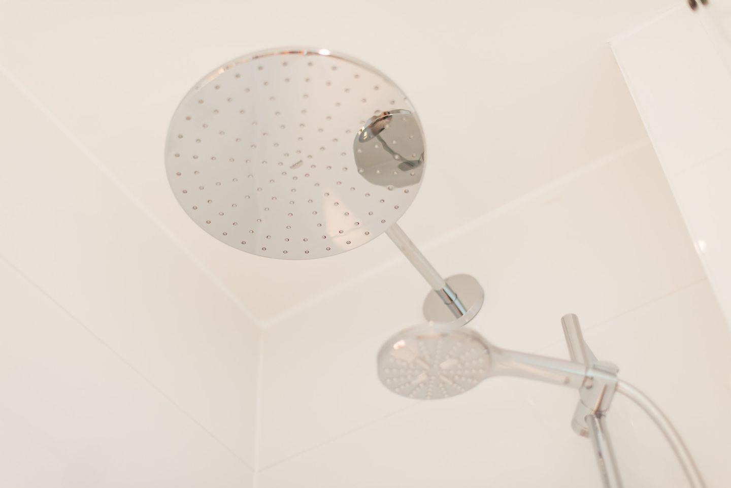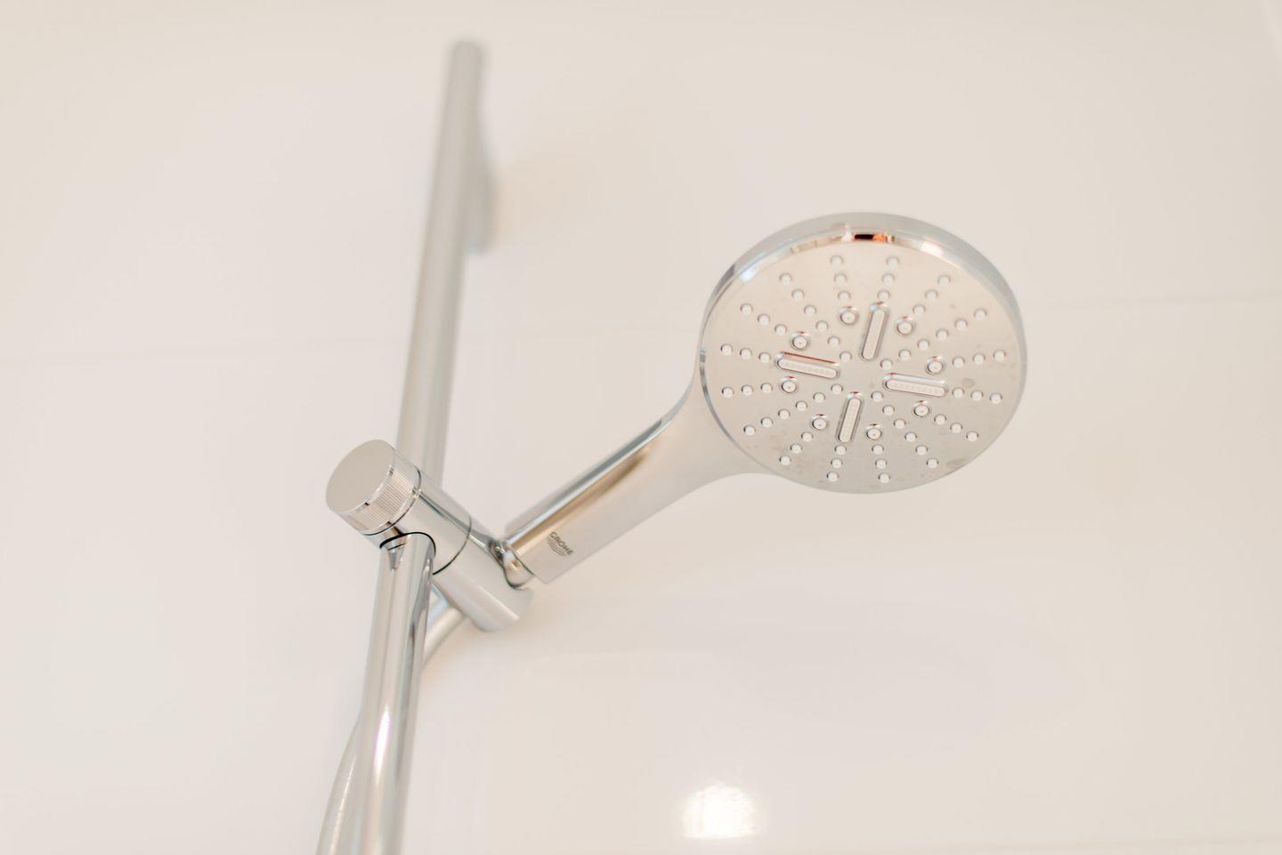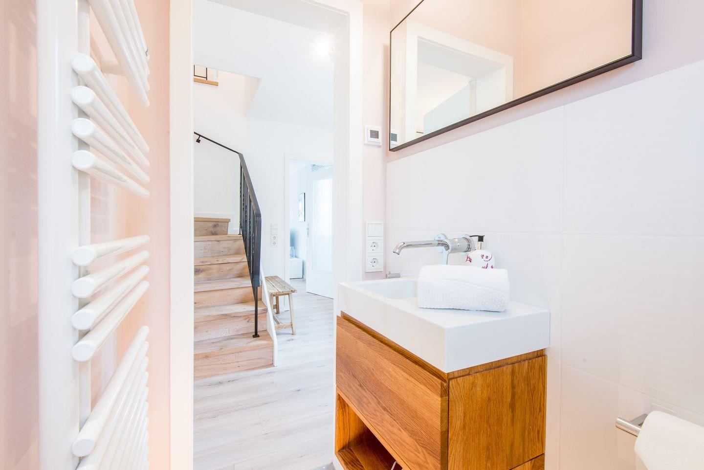 Das Badezimmer mit Dusche und WC sowie einem Föhn sorgt für einen angenehmen Start in den Tag. Ein zusätzliches Gäste-WC im Erdgeschoss ist ebenfalls vorhanden.