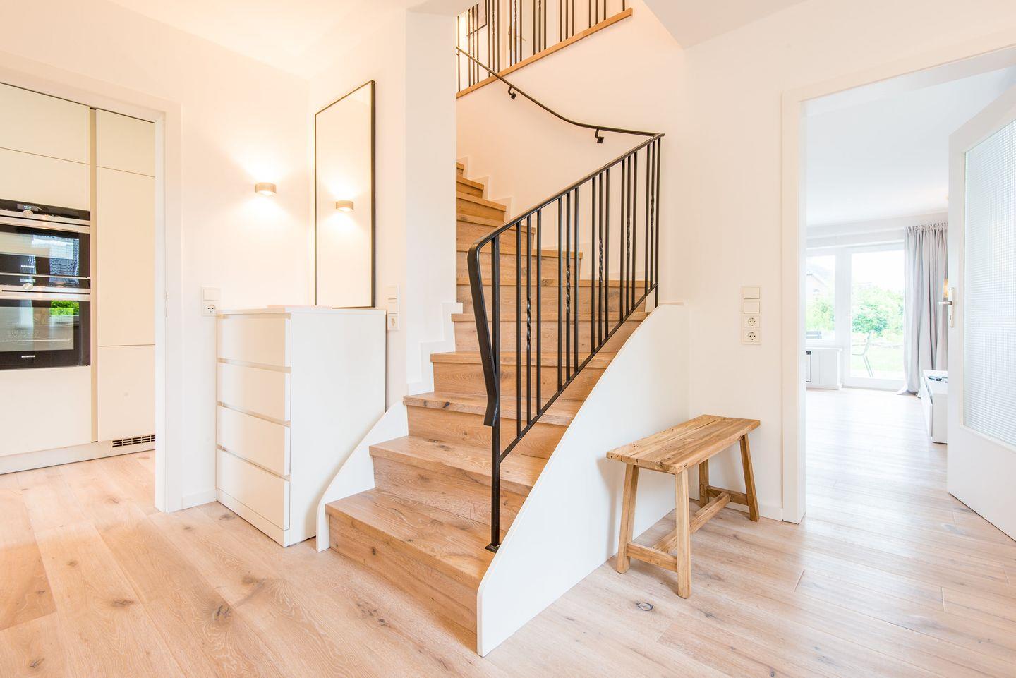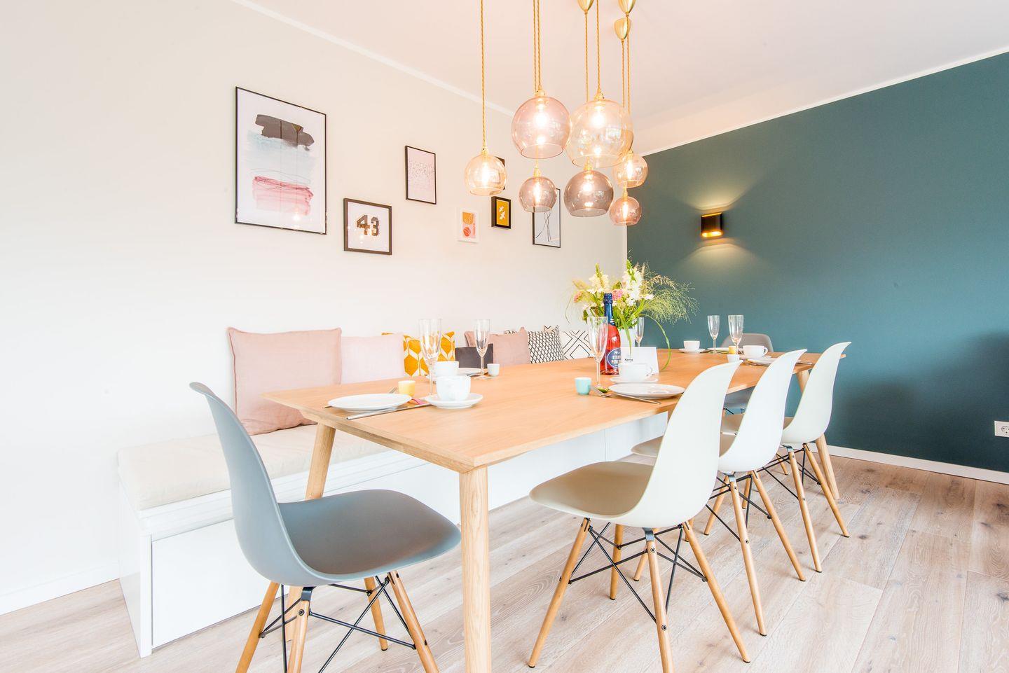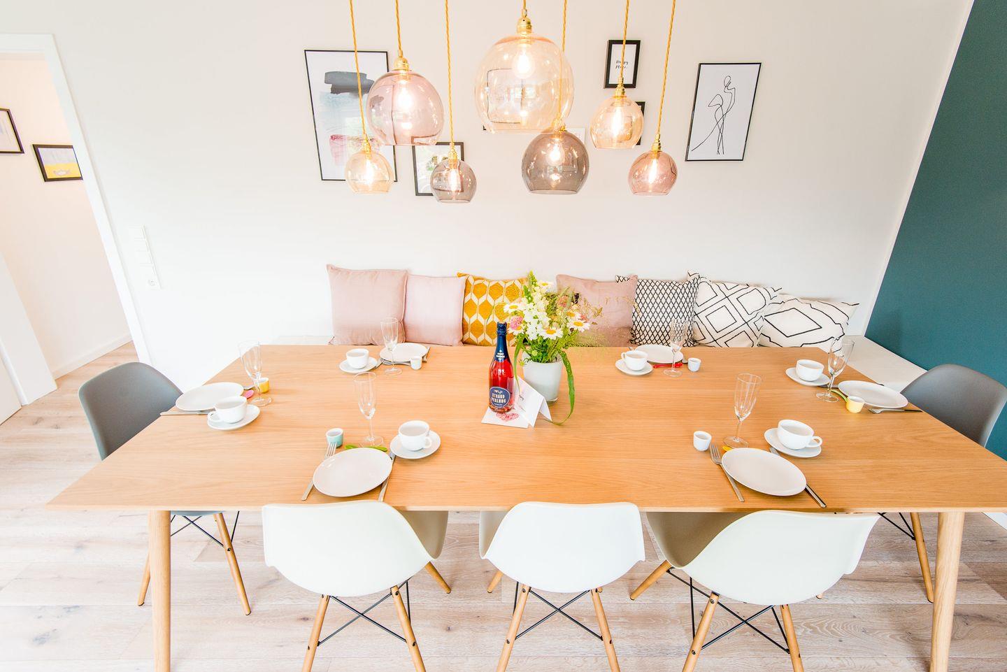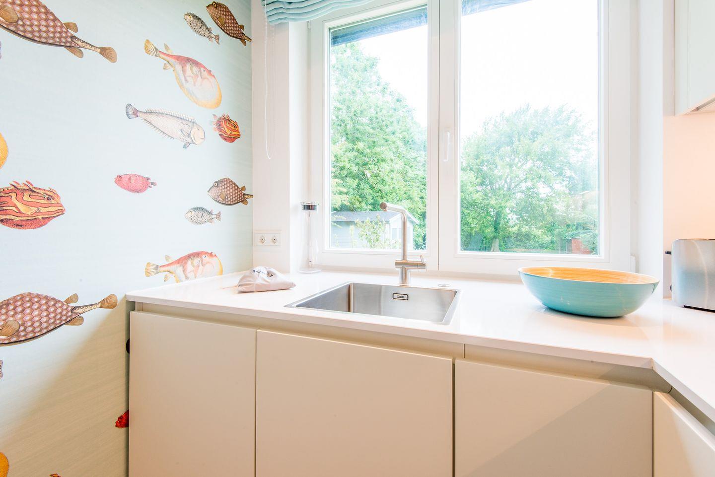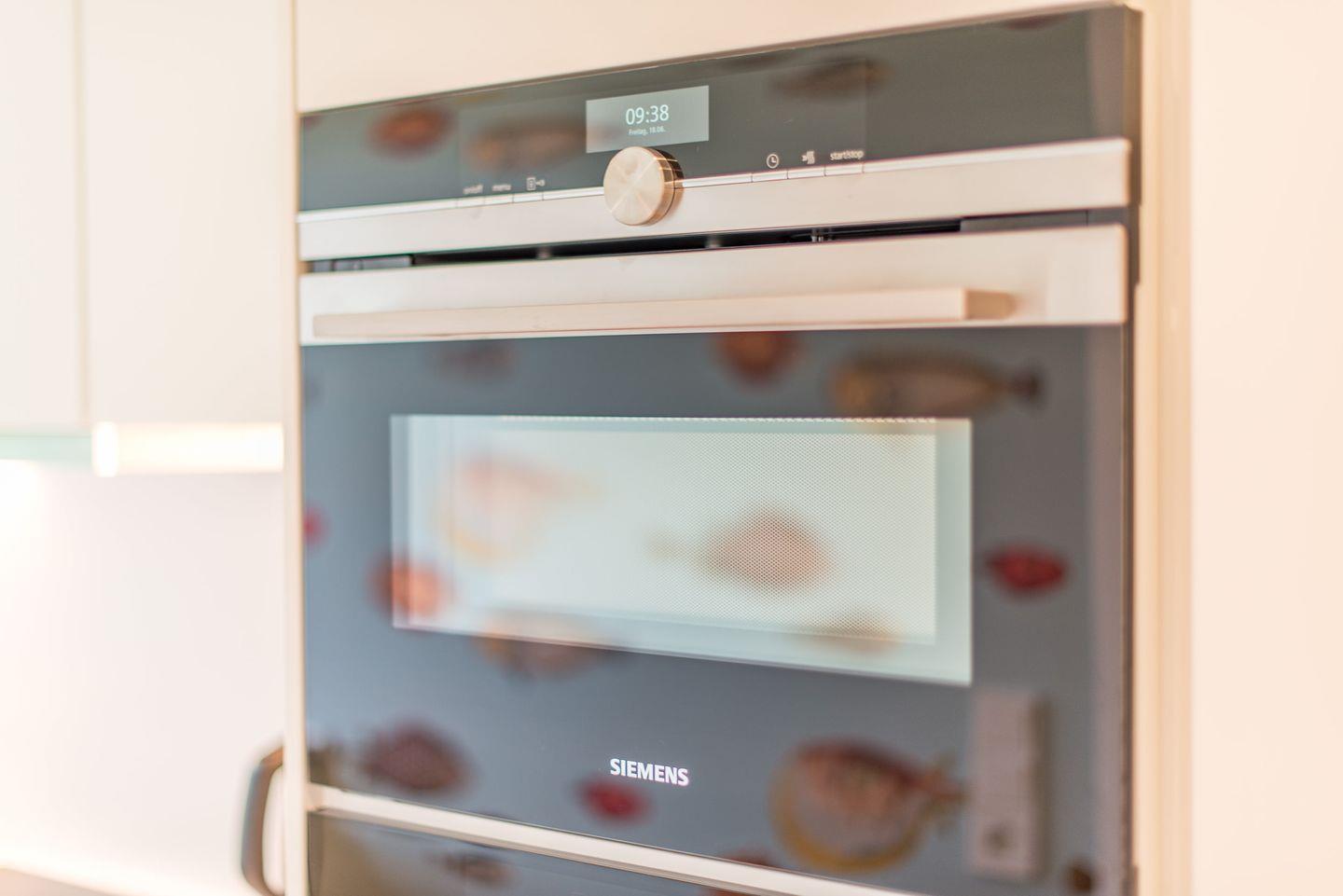 Die Küche bietet modernen Komfort und ist ausgestattet mit einem Cerankochfeld, einem Backofen mit integrierter Mikrowelle, einem Geschirrspüler und einem großzügigen Kühl-Gefrierschrank. Hier finden Sie alles, was Sie zur Zubereitung von Mahlzeiten in einer angenehmen Umgebung benötigen.