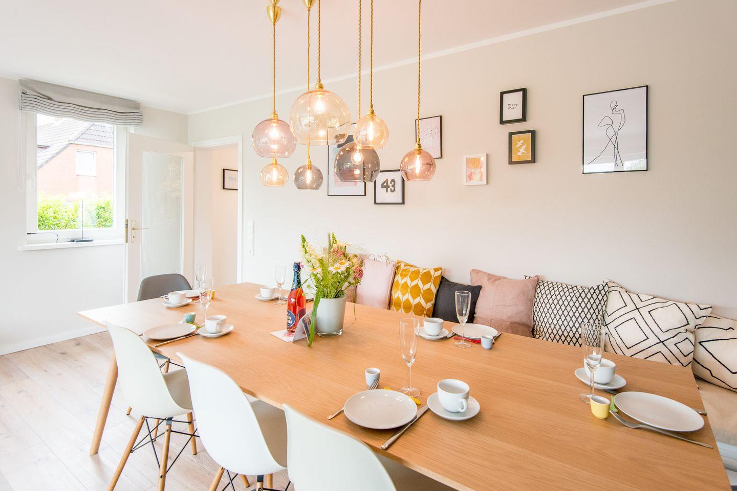 Im einladenden Wohn- und Essbereich erwartet Sie ein großer Esstisch für sechs Personen, der zu gemeinsamen Mahlzeiten einlädt. Ein komfortables Sofa und ein TV sorgen für entspannte Abende. Der direkte Zugang zur Terrasse und dem großzügigen Garten, der mit einem Strandkorb ausgestattet ist, schafft zusätzlichen Raum im Freien – ideal, um die Nordseeluft zu genießen und sich zu erholen.