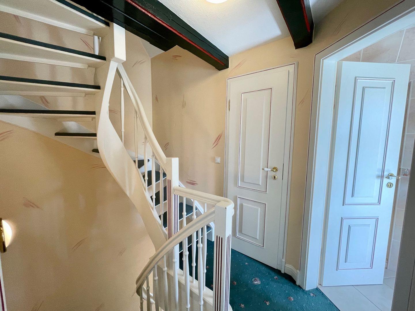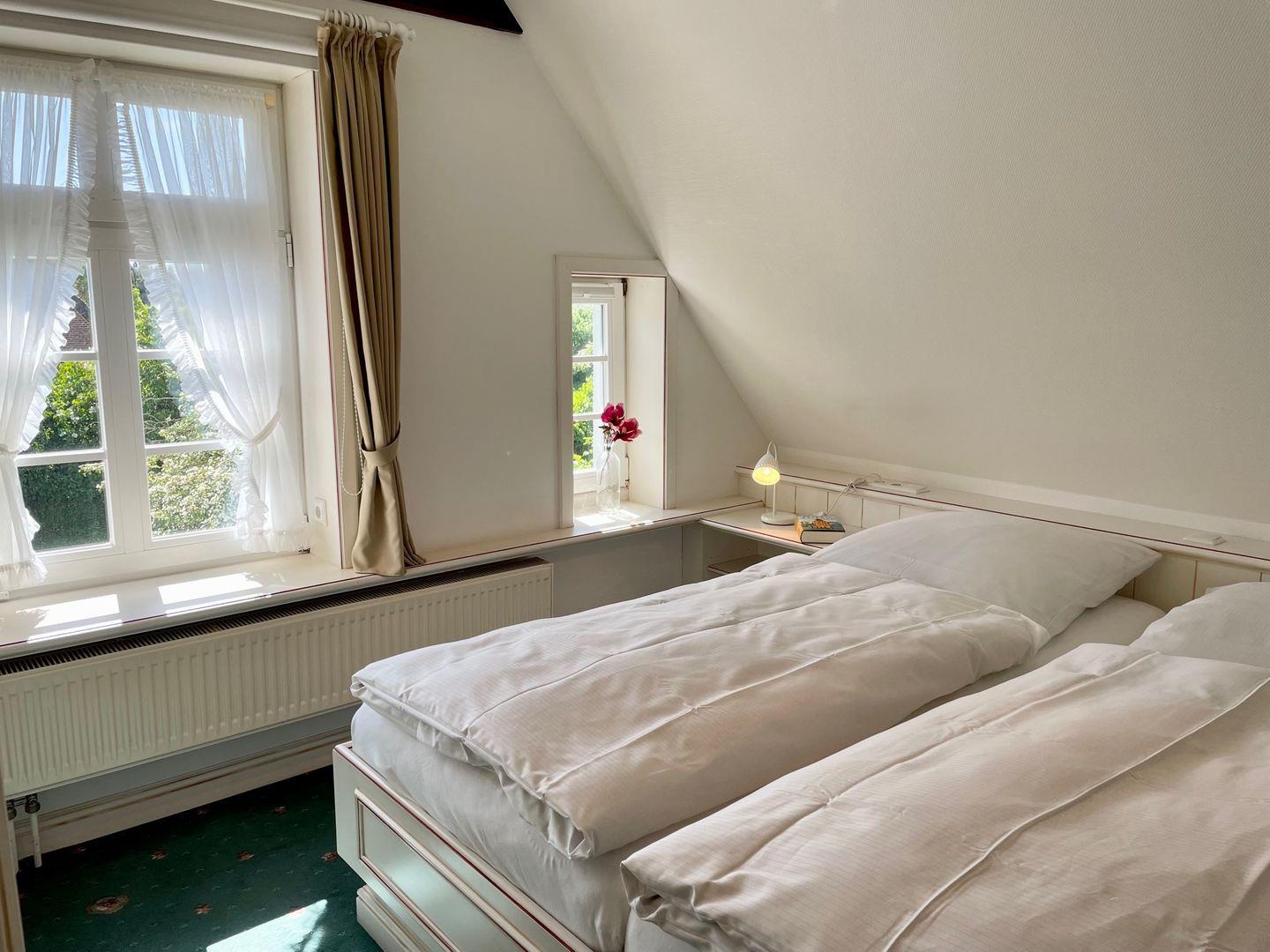 Die beiden Schlafzimmer befinden sich in den oberen Ebenen. Es handelt sich um Doppelschlafzimmer, wobei vor allem der Schlafbereich im Dachgeschoss durch sein Oberlicht bezaubert.
