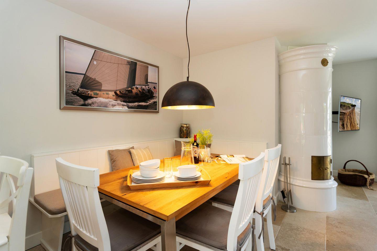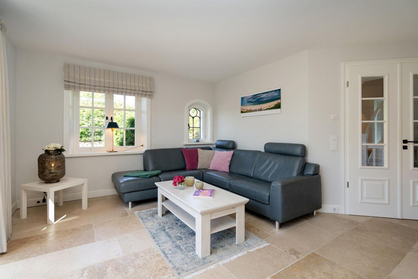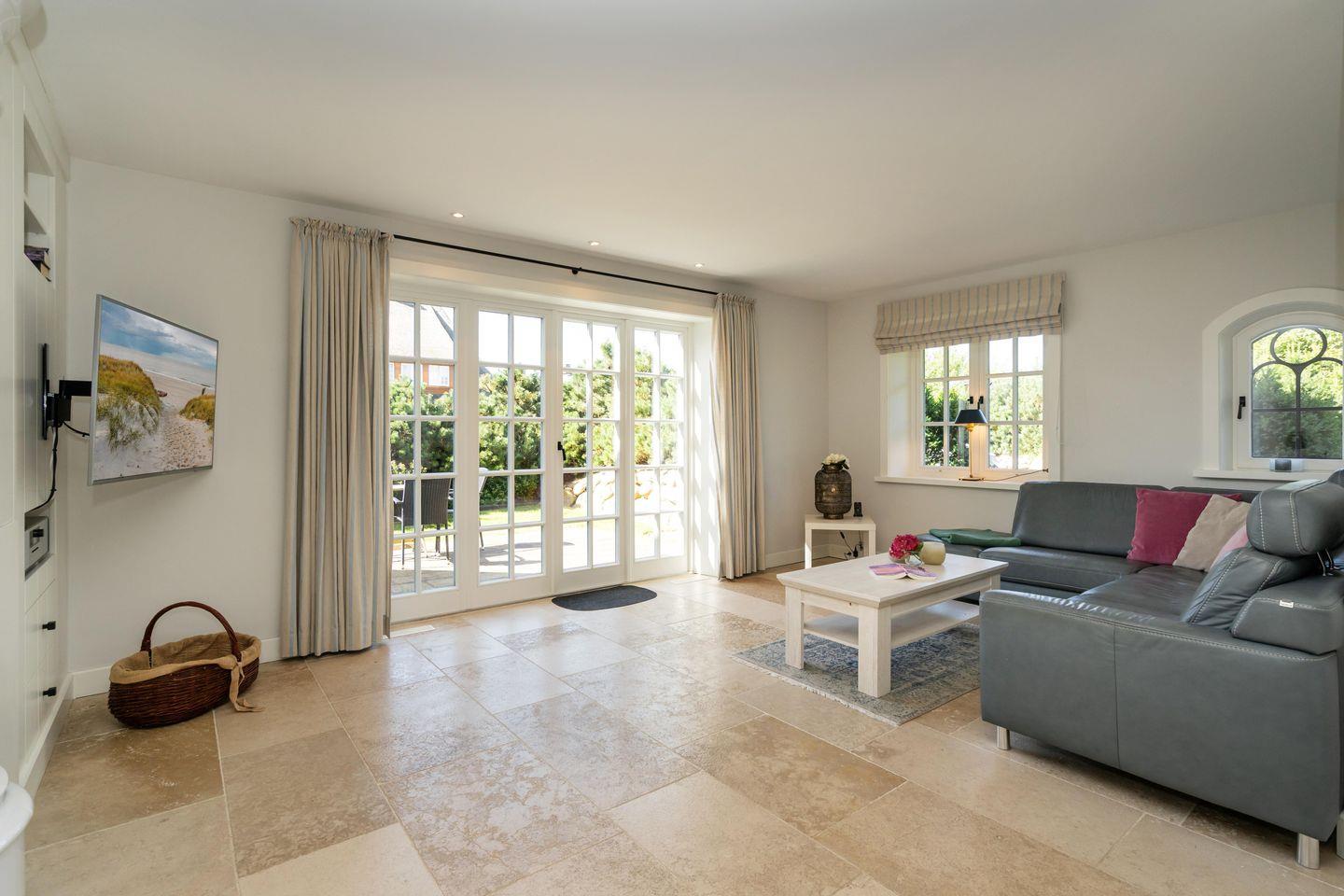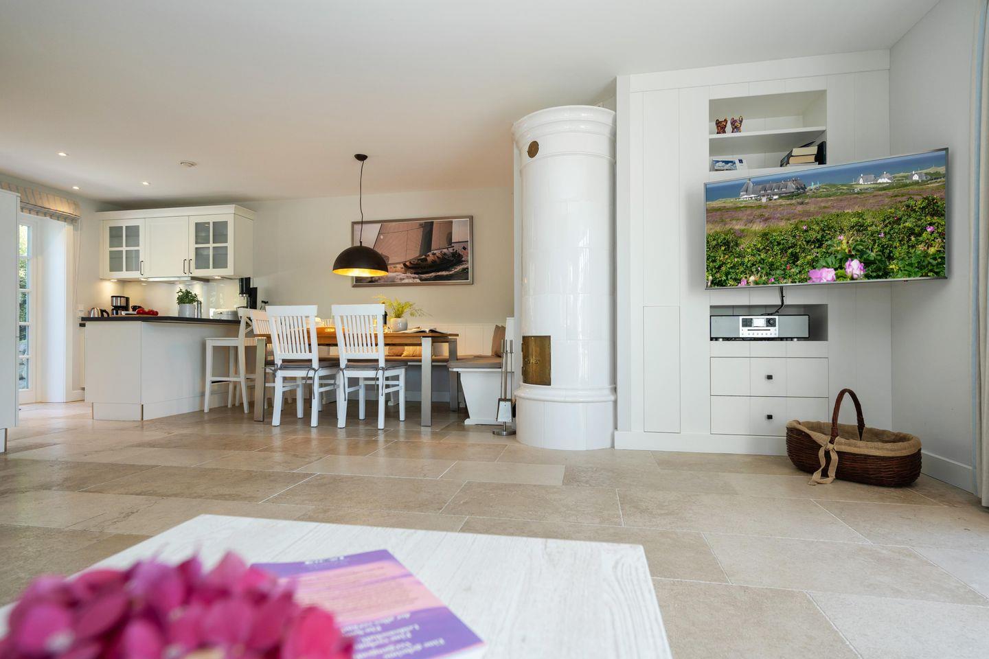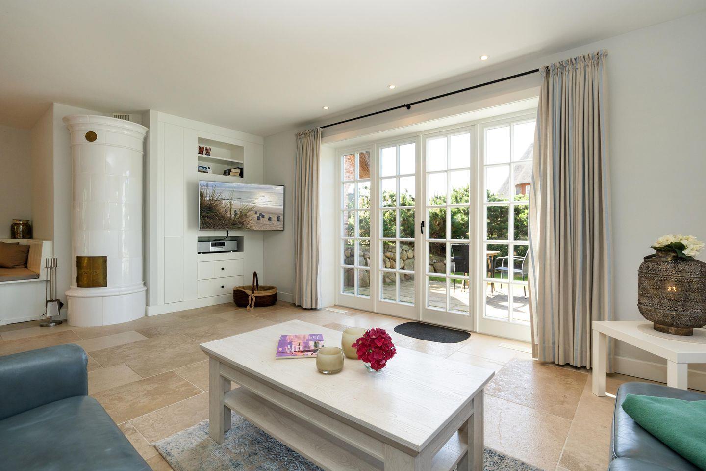 Ein Traum unter Reet. Diese friesische Doppelhaushälfte für bis zu 7 Personen im Herzen Keitums bietet auf 180 m² einen Mix aus Modernität und absoluten Luxus. Der lichtdurchflutete Wohnbereich mit offener Küche bietet viel Platz zum gemeinsamen Kochen, Essen und Verweilen. Auf der angrenzenden Terrasse samt Gartenmöbeln und Strandkorb (in der Saison) lassen sich viele Sonnenstunden verbringen. An kalten Tagen sorgt der Kachelofen im Wohnbereich für warme Temperaturen. Im Eingangsbereich befindet sich ein Gäste-WC. Über eine Treppe gelangen Sie ins Obergeschoss, dort erwarten Sie zwei Schlafzimmer sowie zwei großzügige Bäder. Im Dachgeschoss befindet sich ein Schlafzimmer mit Einzelbetten. Ein weiteres großzügiges Schlafzimmer sowie Badezimmer erwartet Sie im Souterrain. Dort dient Ihnen auch - besonders in den Wintermonaten - eine finnische Sauna mit Ruheraum als Wellnessoase. Alle Schlafräume sind durch hochwertige Tischlereinbauten ausgestattet und bieten somit viel Stauraum für einen Sylturlaub. WLAN, einen zugehörigem PKW-Stellplatz am Haus inkl. E-Ladestation sowie ein Waschtrockner stehen Ihnen zur Verfügung. Haustiere sind willkommen.