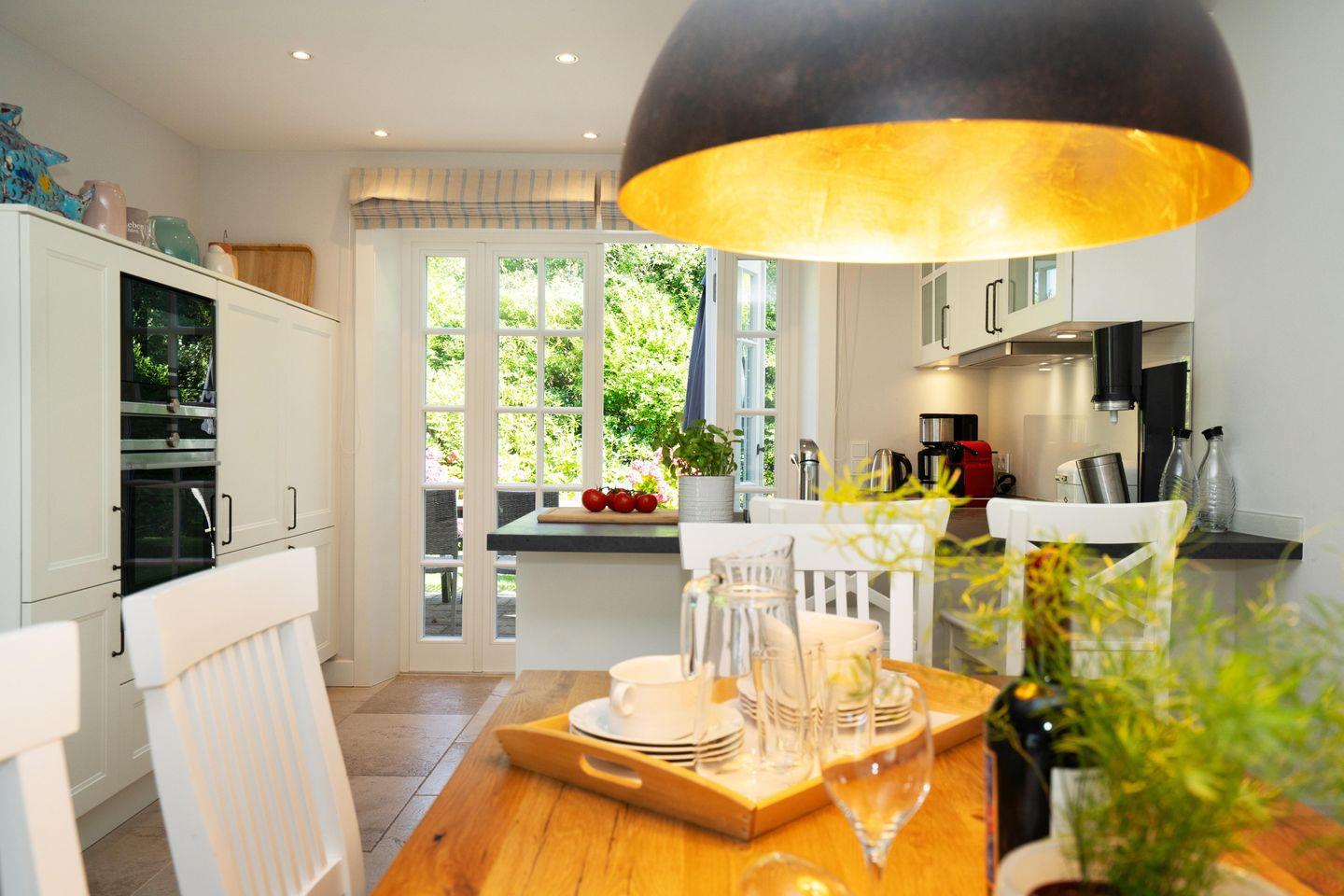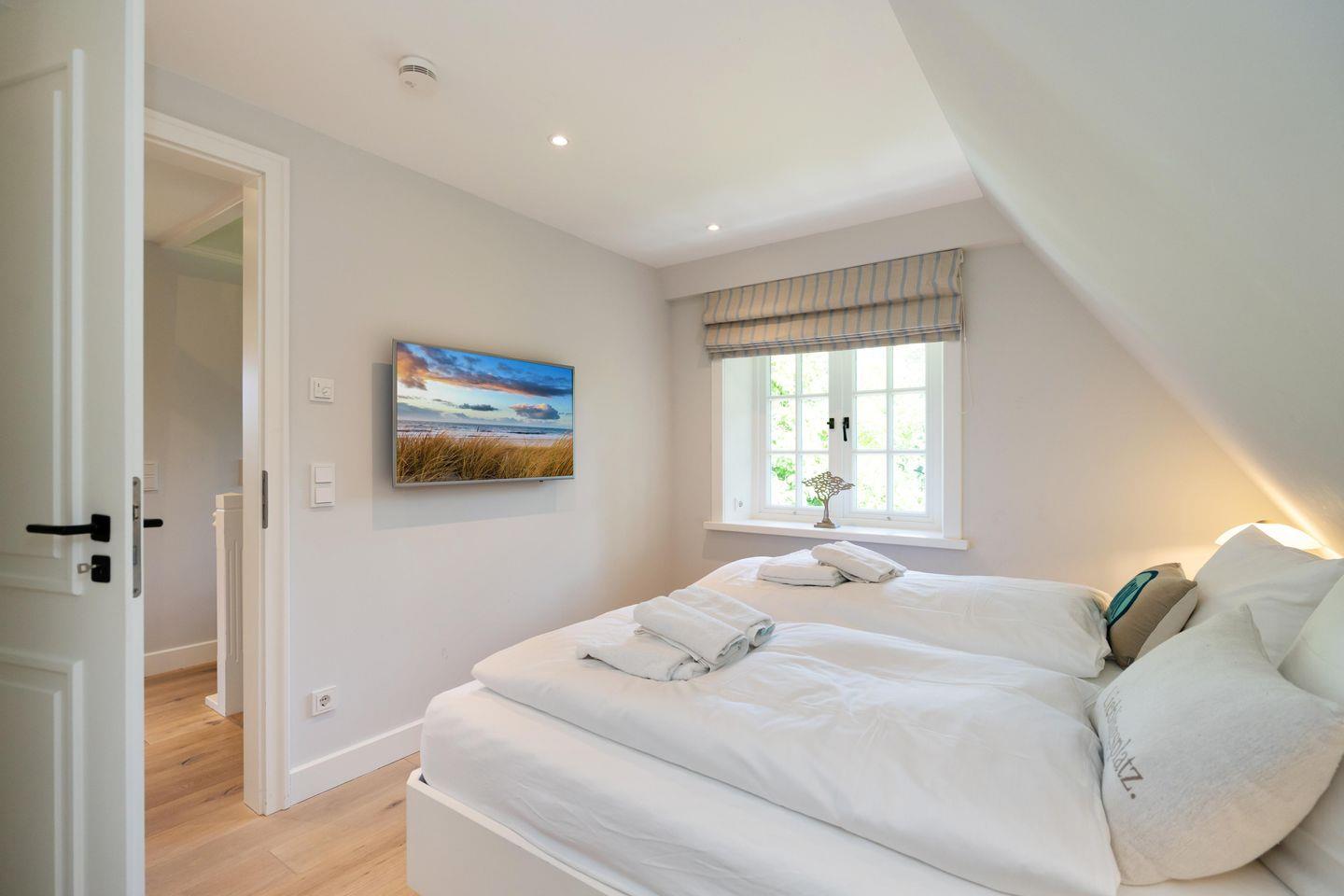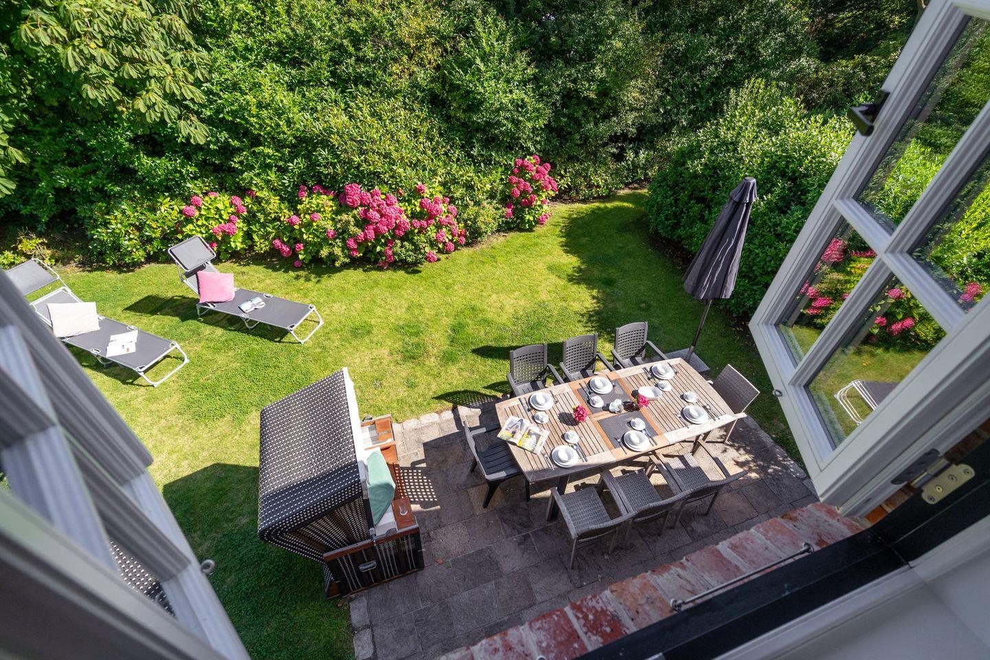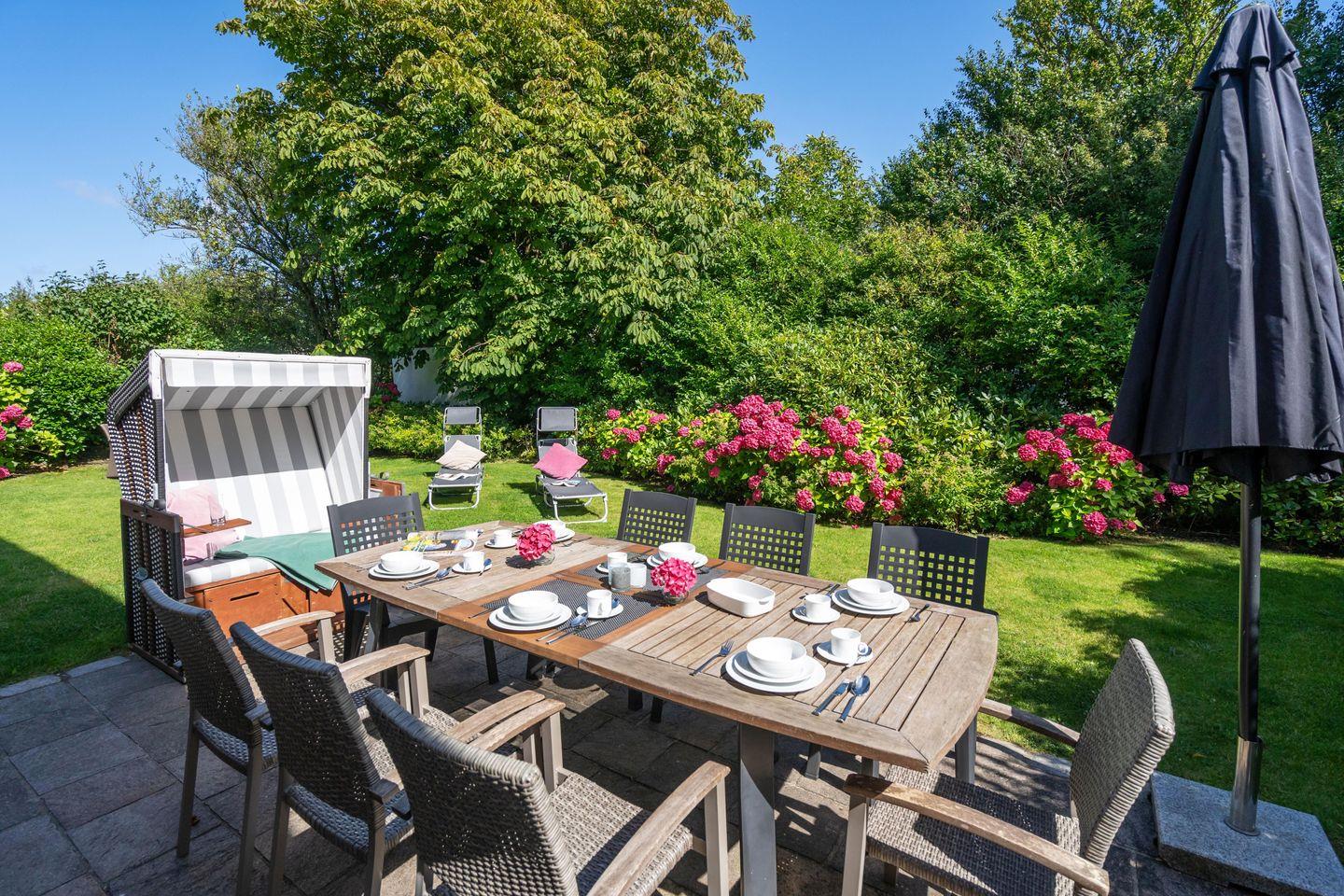 Ein Traum unter Reet. Diese friesische Doppelhaushälfte für bis zu 7 Personen im Herzen Keitums bietet auf 180 m² einen Mix aus Modernität und absoluten Luxus. Der lichtdurchflutete Wohnbereich mit offener Küche bietet viel Platz zum gemeinsamen Kochen, Essen und Verweilen. Auf der angrenzenden Terrasse samt Gartenmöbeln und Strandkorb (in der Saison) lassen sich viele Sonnenstunden verbringen. An kalten Tagen sorgt der Kachelofen im Wohnbereich für warme Temperaturen. Im Eingangsbereich befindet sich ein Gäste-WC. Über eine Treppe gelangen Sie ins Obergeschoss, dort erwarten Sie zwei Schlafzimmer sowie zwei großzügige Bäder. Im Dachgeschoss befindet sich ein Schlafzimmer mit Einzelbetten. Ein weiteres großzügiges Schlafzimmer sowie Badezimmer erwartet Sie im Souterrain. Dort dient Ihnen auch - besonders in den Wintermonaten - eine finnische Sauna mit Ruheraum als Wellnessoase. Alle Schlafräume sind durch hochwertige Tischlereinbauten ausgestattet und bieten somit viel Stauraum für einen Sylturlaub. WLAN, einen zugehörigem PKW-Stellplatz am Haus inkl. E-Ladestation sowie ein Waschtrockner stehen Ihnen zur Verfügung. Haustiere sind willkommen.