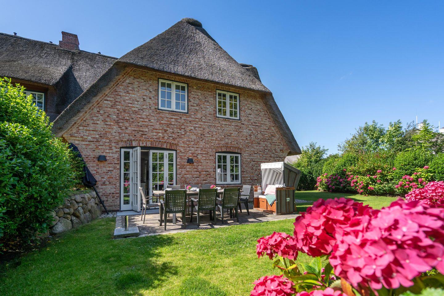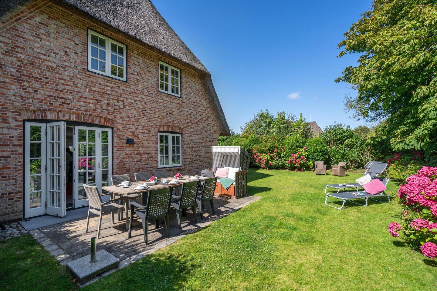Traumhaftes ca. 180 m² großes Reetdachhaus im Herzen Keitums für bis zu 7 Personen mit drei Bädern, Wellnessbereich und schönem Garten. Inklusive WLAN, PKW-Stellplatz und Strandkorb (in der Saison).
